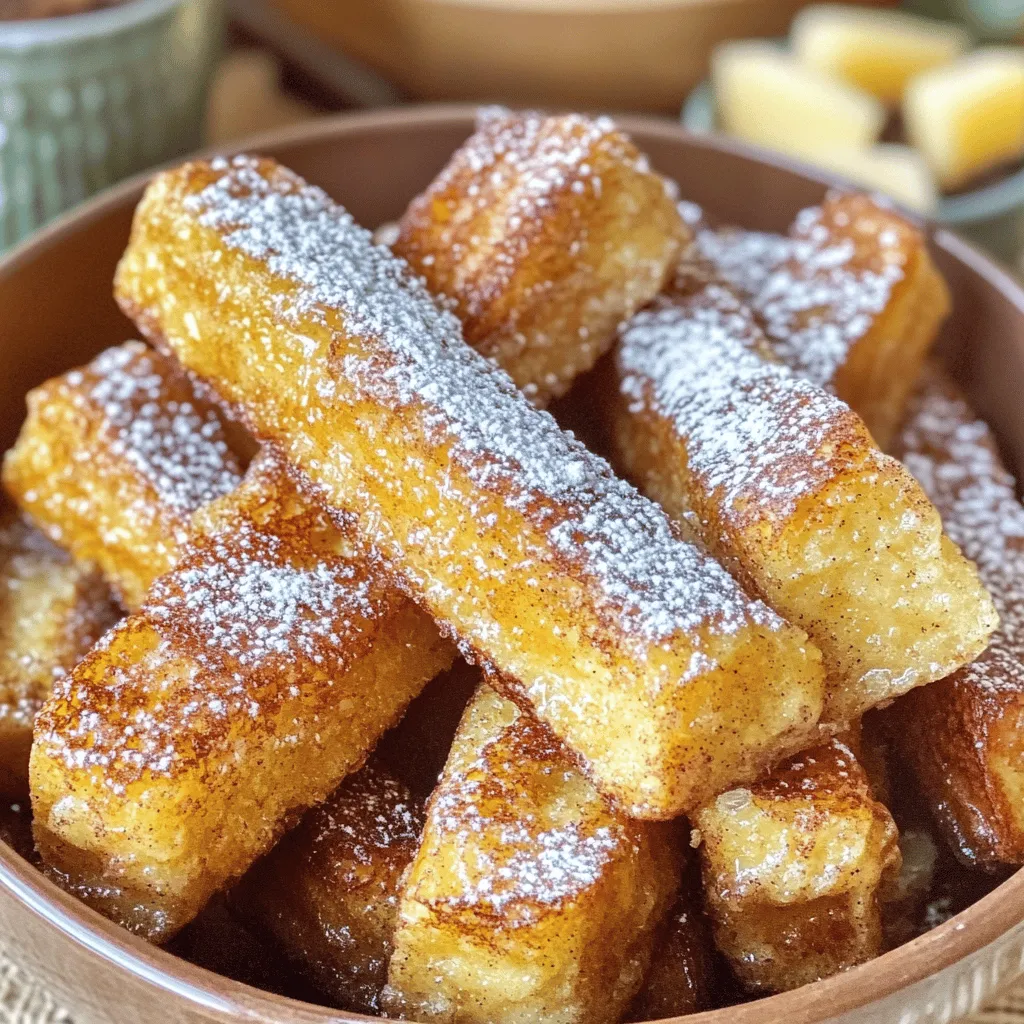 - 6 slices of thick bread (like brioche or challah) - 2 large eggs - 1/2 cup milk - 2 tablespoons maple syrup - 1 teaspoon vanilla extract - 1 teaspoon ground cinnamon - 1/2 teaspoon nutmeg - Pinch of salt - 1/4 cup granulated sugar (for coating) - Optional: powdered sugar for garnish You can switch up the bread for a fun twist. Try sourdough or whole wheat for a heartier feel. If you want a lighter option, use white bread. Almond milk or oat milk works well instead of regular milk. For a vegan option, use flax eggs. Just mix 1 tablespoon of ground flaxseed with 2.5 tablespoons of water. Let it sit for five minutes to thicken. Choose thick bread for the best results. Brioche or challah gives a soft, rich flavor. It soaks up the batter well. Avoid thin bread, as it may get too soggy. Look for day-old bread if possible. It holds up better when soaked in the egg mixture. Fresh bread works, too, but day-old bread gives a nice texture. Start with your bread. Use thick slices like brioche or challah. Cut each slice into three equal strips. This makes perfect sticks for dipping. The thicker the bread, the better the texture. Set these aside on a plate. They are ready for the egg batter. Grab a large shallow bowl. In it, whisk together 2 large eggs and 1/2 cup milk. Add in 2 tablespoons of maple syrup. This gives a nice touch of sweetness. Next, mix in 1 teaspoon of vanilla extract, 1 teaspoon of ground cinnamon, and 1/2 teaspoon of nutmeg. Don’t forget a pinch of salt! Whisk until everything is well mixed. This batter will coat the bread sticks beautifully. Now it’s time to coat the sticks. Take each bread stick and dip it into the egg mixture. Make sure each stick gets fully coated. Let any extra batter drip back into the bowl. In another shallow bowl, mix 1/4 cup of granulated sugar with an extra teaspoon of cinnamon. Roll each coated stick in this cinnamon-sugar mix. Ensure they are fully covered. Preheat your air fryer to 375°F (190°C). Place the coated sticks in a single layer in the air fryer basket. You may need to work in batches. Air fry for about 8-10 minutes. Flip them halfway through cooking. They should turn golden brown and crispy. Once done, take them out and let them cool for a bit. Optionally, dust with powdered sugar before serving. Enjoy your tasty treat! To get that perfect crunch, follow these simple steps. First, ensure you cut your bread thick. I love using brioche or challah for this recipe. Next, coat the sticks well in the egg mixture. Let the excess batter drip off. This helps keep them from becoming soggy. Air fry them at 375°F (190°C) for 8-10 minutes. Flip them halfway through for even cooking. The golden brown color means they're crispy and ready to eat! For added flavor, you can mix in different spices. Try adding a pinch of cardamom or ginger to the egg mixture. If you love chocolate, add mini chocolate chips to the batter. You can also switch the maple syrup for honey or agave. For a fruity twist, serve with fresh berries or banana slices. These small changes make each bite exciting. Every air fryer is a bit different. If your model runs hot, lower the temperature to 350°F (175°C). You might need to cook the sticks a little longer. Always check for doneness by looking for a golden brown color. If you want them extra crispy, cook in batches. Avoid overcrowding the basket. This ensures the hot air can circulate well around each stick. {{image_2}} You can change up the flavor of your Air Fryer Cinnamon French Toast Sticks. Try adding chocolate chips to the egg mixture for a sweet twist. You can also use fresh fruit like sliced bananas or berries. Just add them on top after cooking. If you want a fun fall flavor, mix in pumpkin spice instead of cinnamon. This keeps your breakfast exciting! If you need gluten-free options, choose gluten-free bread. Many brands offer tasty options that work well. For a dairy-free version, use almond milk or oat milk instead of regular milk. You can swap eggs for a flaxseed mixture if you're avoiding eggs. Mix one tablespoon of ground flaxseed with three tablespoons of water and let it sit for five minutes. This acts as a great egg substitute! Serve your French toast sticks with maple syrup for dipping. You can also add a side of fresh fruit for a healthy touch. Some people love to sprinkle powdered sugar on top for extra sweetness. Another great idea is to serve them with yogurt for added protein. Get creative and make a fun breakfast plate! To store leftover French toast sticks, let them cool down first. Place them in an airtight container. They will stay fresh in the fridge for up to three days. For best taste, eat them within this time frame. Reheat the French toast sticks in your air fryer. Set it to 350°F (175°C) for about 5 minutes. This will make them crispy again. You can also use a microwave, but they may become soft. If you choose the microwave, heat for about 30 seconds. You can freeze French toast sticks for longer storage. Once cooled, place them in a single layer on a baking sheet. Freeze them for about an hour. After that, transfer them to a freezer bag. They will keep for up to two months. When ready to eat, thaw them overnight in the fridge before reheating. Yes, you can use regular toast. However, thick bread gives the best texture. Thick bread holds the batter well and stays soft inside. Regular toast may become too crunchy and dry. If you prefer regular bread, just watch the cooking time closely. To stop the sticks from sticking, lay them out in a single layer. Use parchment paper or a silicone mat in the air fryer. You can also give them a light spray of cooking oil. This will help keep them separate and give them a nice crisp. Yes, you can make this recipe ahead of time. Prepare the sticks and coat them with sugar. Store them in the fridge for up to 24 hours. When ready, air fry them straight from the fridge. Just add a minute or two to the cooking time for best results. In this blog post, I covered 
