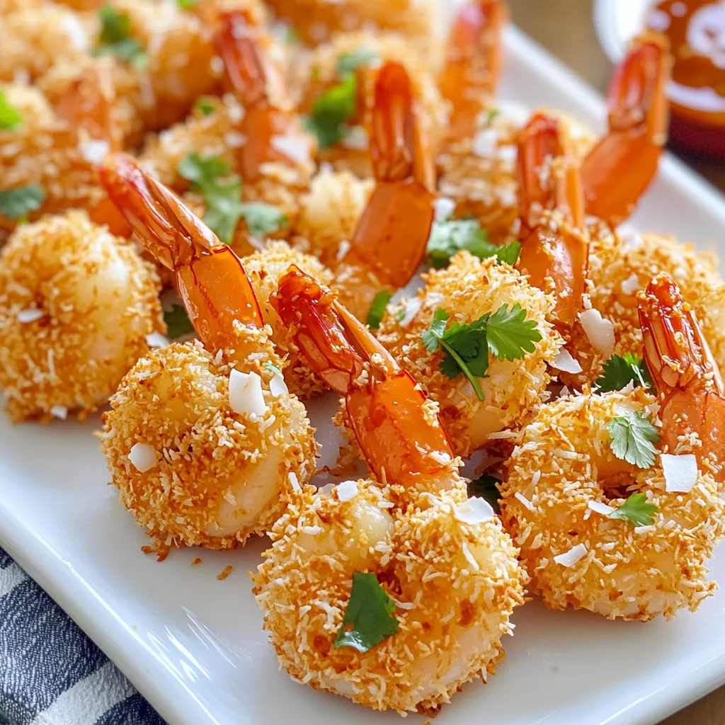 These ingredients create a crunchy, sweet, and savory treat. The shrimp bring a fresh taste, while the coconut and panko add crunch.