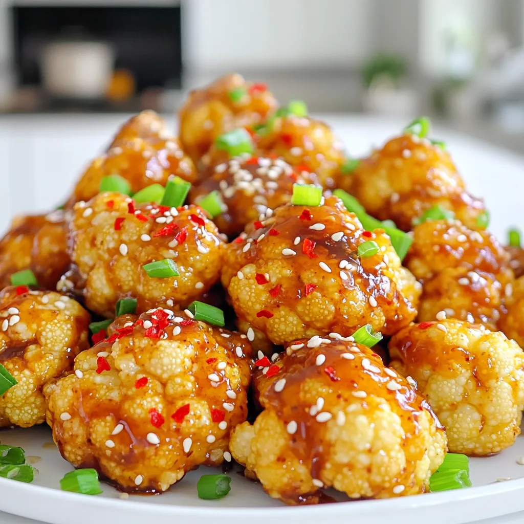 - 1 head of cauliflower, cut into florets - 3 tablespoons olive oil - 2 tablespoons honey - 3 cloves garlic, minced - 1 teaspoon red chili flakes (adjust to taste) - 1 teaspoon smoked paprika - Salt and pepper to taste - Chopped green onions for garnish - Sesame seeds for garnish Gather these ingredients to make your Air Fryer Spicy Honey Garlic Cauliflower. Using fresh cauliflower helps the dish taste its best. Olive oil adds richness, while the honey brings sweetness. Minced garlic gives that lovely zing. For seasoning, red chili flakes and smoked paprika bring a kick and depth. Adjust the chili flakes to fit your spice level. Don't forget salt and pepper for balance. Lastly, the garnishes elevate the dish's look and flavor. Chopped green onions add freshness, and sesame seeds give crunch. This combination makes your cauliflower not only tasty but also beautiful. - Wash and cut the cauliflower into bite-sized florets. - Pat dry with a clean kitchen towel. To prepare the cauliflower, you need to start with a clean head. Rinse it well under cool water. Use a sharp knife to cut it into small, even florets. This size helps them cook evenly. After cutting, use a kitchen towel to pat them dry. This step is key for achieving that crispy texture later. - Combine olive oil, honey, minced garlic, chili flakes, smoked paprika, salt, and pepper. - Mix until uniform. In a large bowl, add olive oil, honey, and minced garlic. Then, sprinkle in the red chili flakes and smoked paprika. Add salt and pepper to taste. Stir everything together well until it looks smooth and even. This marinade will coat the cauliflower, so every bite bursts with flavor. - Preheat air fryer to 400°F (200°C). - Arrange marinated florets in air fryer basket. - Air fry for 15-18 minutes, shaking halfway through. Before cooking, preheat your air fryer to 400°F (200°C). This step helps the cauliflower crisp up nicely. Once it’s ready, place the marinated florets in the air fryer basket. Make sure you arrange them in a single layer. This helps them cook evenly. Set the timer for 15 to 18 minutes. Remember to shake the basket halfway through to ensure every piece gets that golden brown color. Enjoy the delightful crunch and flavor when they are done! To get crispy cauliflower, you must dry it well. After washing, use a clean kitchen towel. Pat each floret until no moisture remains. This step helps the olive oil and spices stick better. Avoid overcrowding the air fryer basket. If you pack in too many florets, they will steam instead of crisp. Fry in batches if needed. This allows hot air to circulate and cook evenly. You can modify the spice level by changing the amount of chili flakes. If you want it milder, use less. For more heat, add a bit more. You can also try adding other spices, like cayenne or chipotle powder. This gives you more flavor options. For the best texture, air fry the cauliflower for 15-18 minutes. Shake the basket halfway through cooking. This helps them cook evenly and gets them crispy all around. Keep an eye on them toward the end. Cook until they are golden brown and tender. {{image_2}} You can easily change the taste of your spicy honey garlic cauliflower. Try adding different spices like curry powder or cumin for a unique twist. If you love sweet dishes, use more honey or add a splash of maple syrup. For a savory take, skip the honey and add soy sauce or balsamic vinegar. This dish pairs well with various dipping sauces. Try serving it with ranch, tahini, or spicy mayo. It makes a great side dish for grilled meats or a tasty snack for movie night. You can also toss it in a salad for extra crunch and flavor. If you prefer not to use honey, try agave nectar or maple syrup as a sweetener. Both options work well and keep the dish sweet. To make it vegan, use a plant-based honey substitute or skip the honey altogether. You’ll still enjoy great taste! To keep your spicy honey garlic cauliflower fresh, store it right. Use an airtight container. This keeps moisture out and flavors in. Place the cooled cauliflower in the container. Make sure to seal it tightly to avoid spills. You can easily reheat your cauliflower in the air fryer. Set it to 350°F (175°C) for about 5-7 minutes. This keeps the cauliflower crispy. If you don’t have an air fryer, a microwave works too. Just heat it for 1-2 minutes. For oven reheating, place it on a baking sheet and warm at 350°F (175°C) for 10 minutes. In the fridge, your leftovers last about 3-4 days. Always check for any odd smells or changes in texture. If you want to keep them longer, freezing is a good option. Place the cooled cauliflower in a freezer-safe bag. It can last up to 3 months in the freezer. When ready to eat, thaw it in the fridge overnight before reheating. You should air fry cauliflower for about 15 to 18 minutes. Shake the basket halfway through. This helps the cauliflower cook evenly and become crispy. Check for a golden brown color. If you want it crispier, add a few extra minutes. Yes, you can! You can roast the cauliflower in the oven. Preheat your oven to 425°F (220°C). Arrange the marinated florets on a baking sheet in a single layer. Bake for about 25 to 30 minutes. Make sure to flip them halfway to get an even roast. This dish pairs well with many foods. Serve it as a snack or a side. It goes great with grilled chicken or fish. You can also add it to a grain bowl. Try it with rice or quinoa for a tasty meal. Don't forget to serve it with a dipping sauce, like ranch or yogurt sauce, for extra flavor! In this post, we explored how to make spicy honey garlic cauliflower. You learned about the key ingredients, step-by-step preparation, and cooking tips. We also covered variations, storage info, and FAQs for your convenience. This dish is fun, flavorful, and easy to make. Experiment with spices or add your own flair. It’s perfect as a snack or side dish. Enjoy your cooking journey and savor the delicious results!