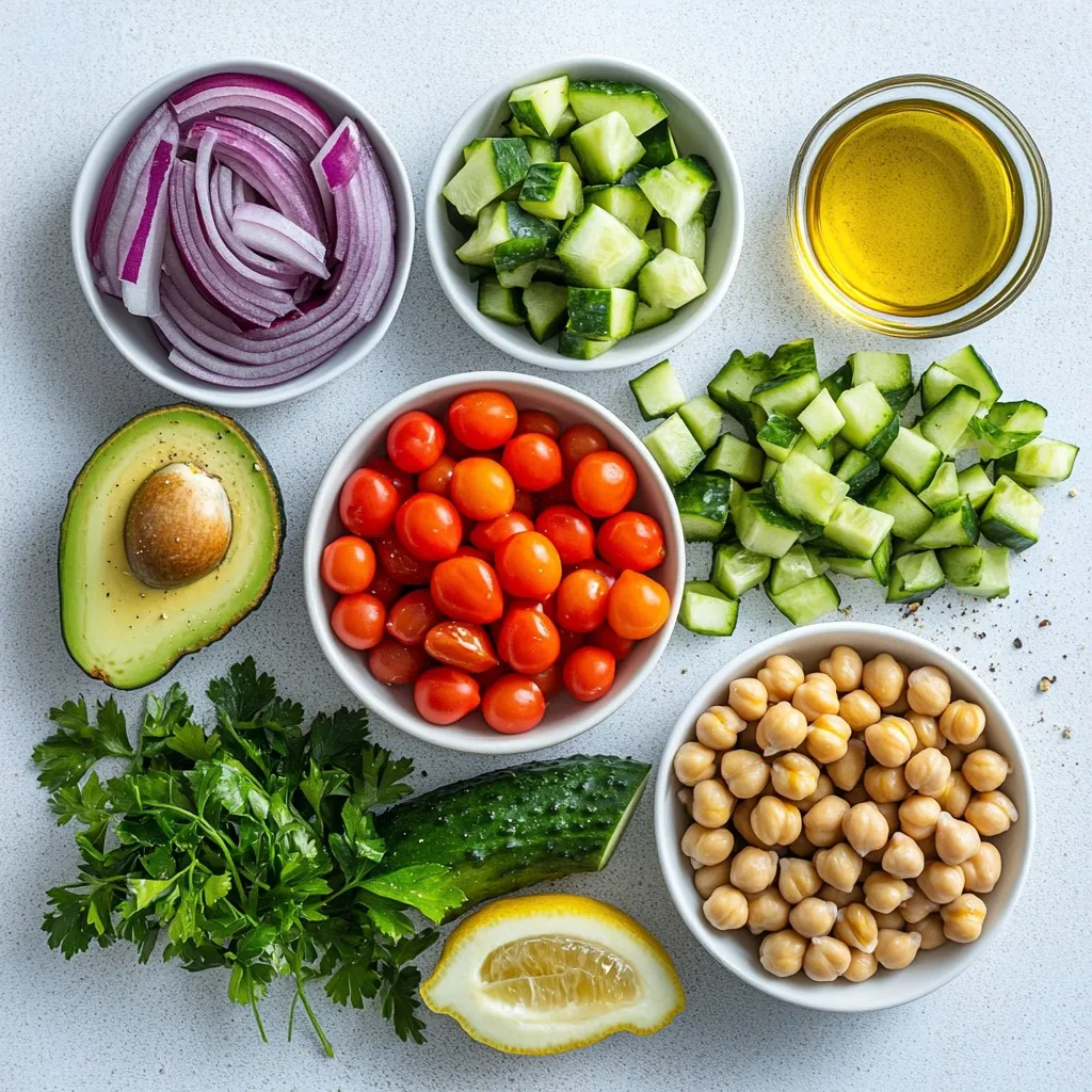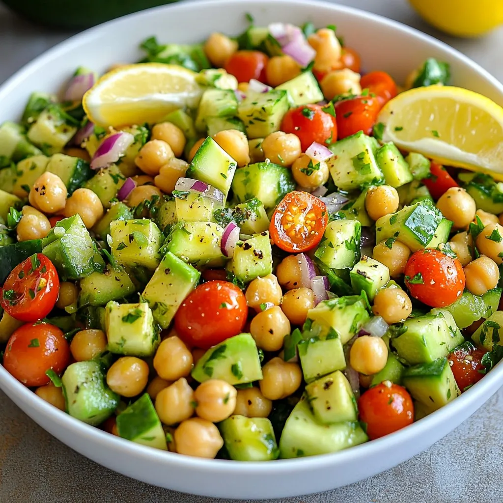 A refreshing salad made with chickpeas, avocados, and fresh vegetables, dressed with a light lemon and olive oil dressing.
