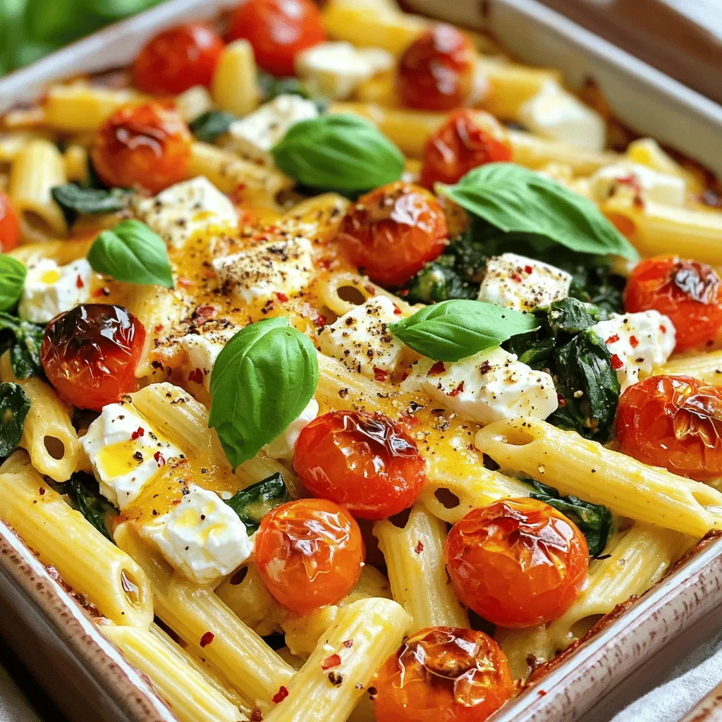 ![To make baked feta pasta, you need simple ingredients that pack a punch. Here’s what you’ll need: - 200g pasta of your choice (penne or fusilli work well) - 200g block of feta cheese - 1 cup cherry tomatoes, halved - 1/2 cup fresh spinach - 1/4 cup black olives, pitted and sliced - 3 cloves garlic, minced - 3 tablespoons olive oil - 1 teaspoon dried oregano - Salt and pepper to taste - Fresh basil leaves for garnish - Optional: Red pepper flakes for some heat I love using fresh ingredients. The cherry tomatoes burst with flavor, and the feta melts into a creamy sauce that coats the pasta beautifully. Fresh spinach adds a nice touch, both in taste and color. You can easily swap out some ingredients based on what you have or prefer. Here are some ideas: - Alternative cheese options: If you want to try something different, use goat cheese or ricotta. They both give a nice creaminess. - Vegetable swaps: You can add bell peppers, zucchini, or even artichokes. These add more color and flavor. - Gluten-free pasta suggestions: For a gluten-free version, use rice pasta or chickpea pasta. They work just as well! Feel free to experiment! Cooking should be fun, and personal touches make the dish uniquely yours. For the full recipe, check the [Full Recipe]. 1. Preheat the oven properly: Set your oven to 400°F (200°C). This heat helps the feta and tomatoes cook well. 2. Preparing the baking dish with vegetables: Grab a large baking dish. Add 1 cup of halved cherry tomatoes, 3 minced garlic cloves, 1/4 cup of sliced black olives, and 1/2 cup of fresh spinach. Drizzle 2 tablespoons of olive oil over the mix. Season with salt, pepper, and 1 teaspoon of dried oregano. Stir everything together until coated. 1. Tips for al dente pasta: Boil water in a pot. Add 200g of your favorite pasta, like penne or fusilli. Cook it according to the package instructions. Al dente means the pasta should be firm to the bite. 2. Timing with baking instructions: While the feta and veggies bake, cook the pasta. Keep an eye on the oven. The feta and vegetables need about 25-30 minutes to bake. This timing helps everything finish together. 1. How to mix the baked feta with the pasta: Once the baking time is up, take the dish out of the oven. Use a fork to mash the feta cheese. Mix it with the roasted tomatoes and spinach. This creates a creamy sauce. 2. Importance of seasoning adjustments: After mixing in the cooked pasta, taste the dish. You might need more salt or pepper. Adjust to your liking, and serve it hot. Enjoy this simple dish with fresh basil leaves on top for a pop of flavor. For the full details on making this delicious meal, check the Full Recipe. To ensure feta melts perfectly, use a block of feta cheese. Crumbled feta does not melt the same way. Place the block in the center of your veggie mix. Drizzle with olive oil to help it melt evenly. Bake at 400°F for 25-30 minutes. You want the edges to turn golden brown. For roasting tomatoes, pick ripe cherry tomatoes. Halve them for more surface area. Toss them with garlic, olive oil, and seasonings. This mix helps them blister and caramelize beautifully. The sweet flavor of roasted tomatoes pairs well with the creamy feta. To boost flavor, add herbs and spices. Fresh basil or parsley brightens the dish. You can also try thyme or rosemary for a different taste. Red pepper flakes add a nice kick. Sprinkle some on top before serving for extra heat. If you like it spicy, consider adding sliced jalapeños or a dash of hot sauce. Mix these into the veggie blend before baking. This way, the heat infuses into the sauce as it cooks. For serving, use a large bowl or platter. This makes it easier for guests to serve themselves. Top with fresh basil leaves for a pop of color. When plating for social media, think about height and color. Use contrasting bowls or plates to make the dish stand out. A sprinkle of red pepper flakes adds visual interest. Don’t forget to capture that creamy sauce as you mix it in. This makes for a mouthwatering photo! You can find the full recipe for this delicious dish to create your own masterpiece. {{image_2}} If you want a plant-based version, try using plant-based cheese. It melts nicely and gives a good flavor. Look for brands that mimic feta. You can also add legumes like chickpeas or lentils to boost protein. They mix well and add a nice texture. Want to make it a full meal in one dish? Combine proteins like chicken or shrimp with the pasta. Just add them to the baking dish with the other ingredients. The meat cooks alongside the veggies and cheese. This method keeps clean-up easy and your dinner flavorful! Adjust the dish with seasonal vegetables for fresh flavors. In summer, add zucchini or bell peppers for crunch. In winter, consider hearty veggies like broccoli or kale. These changes keep the recipe exciting and help you use what’s in season. To keep your baked feta pasta fresh, store leftovers safely. First, let the dish cool down. Then, put it in an airtight container. This helps keep the pasta from drying out. You can store it in the fridge for up to three days. If you want to save space, divide it into smaller portions. This also makes it easy to reheat later. The best way to reheat baked feta pasta is in the oven. Preheat the oven to 350°F (175°C). Put the pasta in an oven-safe dish. Cover it with foil to keep it moist. Heat for about 15-20 minutes. If you prefer, you can also use the microwave. Heat it in short bursts, stirring in between. This helps heat it evenly and avoids overcooked pasta. Yes, you can freeze baked feta pasta! To do this, let it cool completely. Then, place it in a freezer-safe container. Make sure to leave some space at the top, as the pasta may expand. It can last up to three months in the freezer. To thaw, move it to the fridge overnight. You can reheat it in the oven or microwave as mentioned before. Enjoy your delicious dish again with ease! For baked feta pasta, I recommend using short shapes l