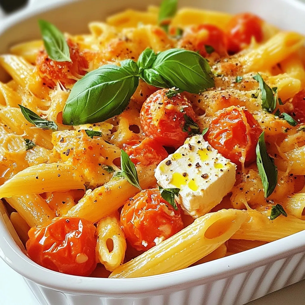 - 200g pasta (penne or fusilli recommended) - 200g feta cheese block - 300g cherry tomatoes, halved - 3 cloves garlic, minced - 4 tablespoons olive oil - 1 teaspoon dried oregano - 1 teaspoon red pepper flakes (adjust to taste) - Fresh basil leaves for garnish - Salt and pepper to taste I love how simple yet flavorful this dish is. The pasta provides a great base. You can choose either penne or fusilli; both work wonderfully. The feta cheese is the star here. Its creamy texture brings everything together. Cherry tomatoes add sweetness and color. I prefer halving them for even roasting. Garlic gives a lovely aroma and depth of flavor, so don’t skip it! Olive oil is essential. It helps everything cook evenly and adds richness. Dried oregano gives that classic Italian vibe. If you like a little heat, red pepper flakes are perfect. You can adjust them based on your taste. Fresh basil is a must for garnish. It brightens up the dish and adds freshness. Lastly, salt and pepper balance the flavors. This combination creates a delightful dish that is hard to resist! {{ingredient_image_1}} - Preheat your oven to 200°C (400°F). - In a large baking dish, combine the halved cherry tomatoes, minced garlic, and dried oregano. First, you want to get the oven nice and hot. Preheating helps the tomatoes blister and the feta melt perfectly. After that, mix the cherry tomatoes with garlic and oregano in your baking dish. The sweet tomatoes and garlic will create a great flavor base. - Drizzle olive oil and season the mixture. - Place feta cheese in the center and drizzle with remaining olive oil. - Bake for about 25-30 minutes. Next, drizzle half of the olive oil over your mix. Add salt, pepper, and red pepper flakes to taste. The feta goes right in the middle. Drizzle the remaining olive oil on top. Bake it in the oven for about 25 to 30 minutes. You want the tomatoes to blister and the feta to turn golden. - Cook pasta until al dente and drain it. - Mash feta and tomatoes after baking. - Toss pasta with the creamy sauce. While the feta and tomatoes bake, cook your pasta according to the package instructions. Aim for al dente, so it has a little bite. Once your feta and tomatoes are out of the oven, use a fork to mash them together. This creates a creamy sauce. Toss the cooked pasta in the baking dish with the sauce. Make sure every piece of pasta is coated in that rich, creamy goodness. Adjust seasoning if needed. To get the best results, watch your bake time closely. Bake the feta and tomatoes for about 25 to 30 minutes. You want the tomatoes to blister. The feta should be golden and melting. Check on it halfway through. This way, you can avoid overcooking. Overcooked tomatoes can become mushy. Overcooked feta can lose its rich creamy texture. Adjust the spice level by adding red pepper flakes. If you like it spicy, add more. If not, use less. You can also try other spices. Consider using Italian herbs, like thyme or rosemary. These will add new flavors to your dish. Garnish your dish with fresh basil leaves. This adds color and a fresh taste. For plating, use a wide bowl. This allows the creamy sauce to spread nicely. You can sprinkle some extra red pepper flakes on top for an extra kick. Enjoy the beautiful colors and aroma of your dish! Pro Tips Use High-Quality Feta: Opt for Greek feta cheese for the best flavor and creaminess, as it melts beautifully and enhances the dish. Customize Your Veggies: Feel free to add other vegetables like bell peppers or zucchini to the mix for added color and nutrition. Adjust Spice Levels: If you enjoy heat, consider increasing the red pepper flakes or adding a dash of hot sauce to the dish before serving. Fresh Basil vs. Dried: Always use fresh basil for garnishing to elevate the flavor, but if unavailable, dried basil can be used during cooking. {{image_2}} You can switch up the cheese in this dish. Goat cheese or ricotta works great too. They add a different taste and texture. You can also try mixing in veggies. Zucchini and bell peppers bring fresh flavors. Cut them into small pieces and add them to the mix. If you need gluten-free options, use gluten-free pasta. Many good choices are available today. For vegans, there are plant-based cheeses that work well. You can even skip the cheese and add more veggies to keep it tasty. To brighten the dish, add lemon zest or juice. It lifts the flavors and adds a nice zing. You can also mix in fresh herbs like parsley or thyme. They give your dish a new twist and make it extra special. To keep your Baked Feta Pasta fresh, store it in an airtight container. Place it in the fridge right after it cools. This helps keep the flavors strong. If you want to freeze it, let it cool completely. Then, put it in a freezer-safe bag or container. Remove as much air as possible to avoid freezer burn. This makes it last longer. Baked Feta Pasta lasts about 3 to 5 days in the fridge. If you freeze it, it can last up to 3 months. Always check for signs of spoilage. If you see mold or an off smell, it’s best to toss it. Trust your senses to keep food safe. To reheat your pasta, the oven is best for texture. Preheat it to 180°C (350°F). Place the pasta in a baking dish, cover with foil, and heat for about 15-20 minutes. For a quick option, use the microwave. Heat it in short bursts, stirring in between. This helps it warm evenly. Always add a splash of water to keep it moist. If you cannot find feta, try goat cheese or ricotta. Both offer a creamy texture. You can also use vegan feta for a dairy-free option. Each choice brings its unique flavor. Yes, you can prepare the dish ahead. Bake the feta and tomatoes, then store them. Cook the pasta just before serving for the best taste. This recipe is already vegetarian! The feta cheese and vegetables make it hearty. Just ensure that any additional ingredients you add are also vegetarian. Penne or fusilli works best due to their shape. They hold the creamy sauce well. You can use other pasta sh