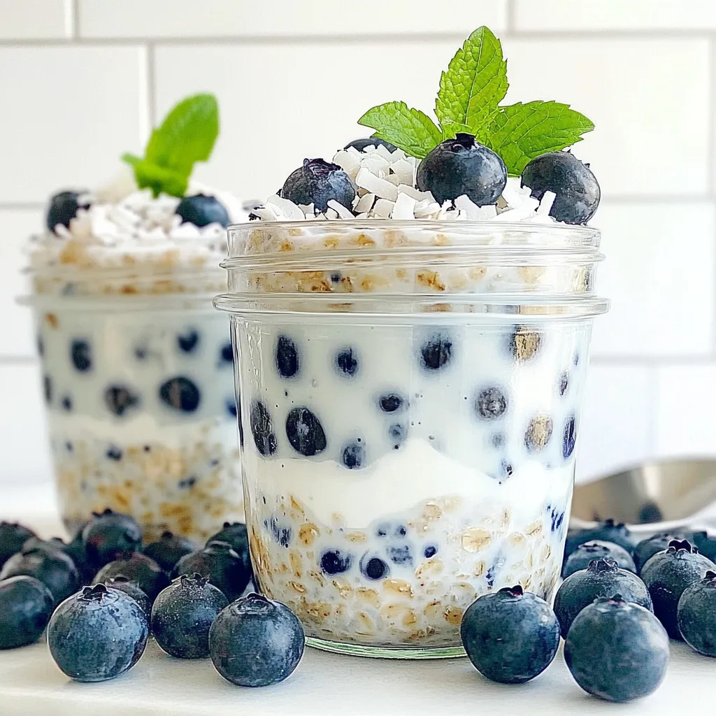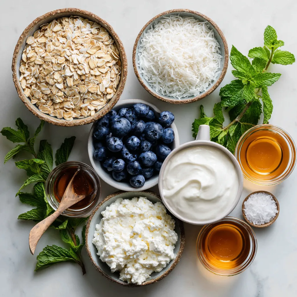 Gather these simple ingredients. They create a tasty, healthy breakfast. Rolled oats form the base. Coconut milk gives a creamy texture. Greek yogurt adds protein. Blueberries bring sweetness and color. Shredded coconut enhances the tropical vibe. Maple syrup or honey offers natural sweetness. Vanilla extract boosts flavor. A pinch of salt balances everything out. Mint leaves are a fun touch for garnish. This mix is not just healthy; it’s delicious and fun to make!