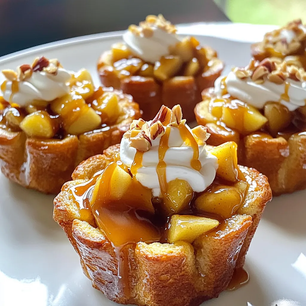 - 6 slices of bread (preferably challah or brioche) - 4 large eggs - 1 cup milk - 1 teaspoon vanilla extract - 1 teaspoon ground cinnamon - 2 tablespoons brown sugar - 2 apples, peeled, cored, and diced - 1 tablespoon butter - ½ cup caramel sauce - Whipped cream (optional) - Chopped nuts (optional) For the best results, I like to use challah or brioche bread. These breads are soft and soak up the egg mixture well. You need four large eggs for a rich custard. One cup of milk adds creaminess, but you can use any milk you prefer. To enhance flavor, add one teaspoon of vanilla extract and one teaspoon of ground cinnamon. The brown sugar, two tablespoons, will sweeten the mixture and balance the tartness of the apples. For the apple filling, two apples, peeled, cored, and diced, bring a fresh taste. I use a tablespoon of butter to sauté the apples, which makes them tender and sweet. Half a cup of caramel sauce is essential. You can use store-bought or homemade caramel. Finally, consider adding whipped cream and chopped nuts as toppings. They add fun textures and flavors. These ingredients come together to make a delightful treat everyone will love! 1. Preheat your oven to 350°F (175°C). This helps cook the cups evenly. 2. Grease a muffin tin with cooking spray or butter. This prevents sticking. 3. Cut each slice of bread into quarters. This creates small pieces for cups. 4. Gently press the bread pieces into the muffin tin. Make a cup shape. 1. In a mixing bowl, whisk together the eggs, milk, vanilla extract, ground cinnamon, and brown sugar. Mix until smooth. 2. In a skillet over medium heat, melt the butter. Add the diced apples and sauté for about 5 minutes. This softens the apples. 3. Stir in half of the caramel sauce. Coat the apples well and then remove from heat. 1. Pour the egg mixture over the bread cups. Ensure each cup is filled. 2. Spoon the caramel apple mixture into each cup. Distribute it evenly for the best flavor. 3. Bake in the preheated oven for 20-25 minutes. The tops should be golden, and the custard should set. 4. Once baked, allow the cups to cool for a few minutes. This makes removal easier. 5. Drizzle the remaining caramel sauce over each cup. Add whipped cream if you like. 6. Garnish with chopped nuts for a nice crunch. Enjoy your delicious treat! - Ensuring cups are evenly filled: When you pour the egg mixture over the bread, fill each cup to the top. This way, every bite is rich and custardy. Use a measuring cup for accuracy. - Avoiding over-baking for a custardy texture: Watch your time closely while baking. Bake for 20 to 25 minutes. Check for a golden top. A little jiggle in the center means it's perfect! - Alternative bread choices: You can use any bread you like! Sourdough, white, or even gluten-free bread works well. Just make sure it's thick enough to hold the filling. - Dairy-free options for milk and eggs: Swap regular milk for almond or oat milk. For eggs, consider using flax eggs or a dairy-free egg substitute. These options still give great flavor and texture. {{image_2}} You can add spices for a twist. Nutmeg and ginger bring warm flavors. Just a pinch can change your cups. Try adding these spices when you mix the egg mixture. You can also switch up the fruits. Pears or berries work great in this recipe. Simply replace the apples with your choice. This keeps things fresh and exciting. Homemade caramel sauce is a must-try. It’s easy to make and tastes amazing. Just melt sugar in a pan, then add cream and butter. Stir until smooth and pour it over your cups. You can also think about other toppings. Chocolate chips add a sweet crunch. Fresh fruit or nuts make great choices too. Get creative and top your French toast cups however you like! To keep your caramel apple French toast cups fresh, store them in an airtight container. Place parchment paper between layers to prevent sticking. You can refrigerate them for up to three days. If you want to keep them longer, consider freezing them. They stay good in the freezer for up to two months. To reheat, I recommend using an oven. Preheat it to 350°F (175°C). Place the cups on a baking sheet and cover them with foil. Heat for about 10-15 minutes. This method keeps the texture nice and helps avoid sogginess. You can also microwave them for quick warmth, but be careful not to overheat. Enjoy your delicious brunch treat! Yes, you can prepare the caramel apple French toast cups ahead of time. To do this, follow all the steps up to baking. Once you fill the muffin tin, cover it with plastic wrap and store it in the fridge. You can bake them the next morning. This way, you save time and still enjoy a fresh treat. I recommend using challah or brioche for this recipe. Both breads are soft, rich, and hold the custard well. You can also use other bread types like French or Texas toast if you prefer. Just make sure the bread is not too dry, or it might not absorb the custard properly. Yes, you can freeze the cups after baking. Let them cool completely, then place them in an airtight container. They will stay good for about one month. To reheat, just pop them in the oven at 350°F (175°C) for about 10 to 15 minutes. This keeps them warm and tasty. This blog post shared a fun recipe for caramel apple French toast cups. You learned about all the necessary ingredients, step-by-step instructions, and helpful tips. I also discussed tasty variations and safe storage methods. By following this guide, you can create a warm, delicious treat. Enjoy making these cups for breakfast or as a dessert. Share them with friends for a sweet surprise! Remember, experimenting with flavors can lead to new favorites. Happy baking!