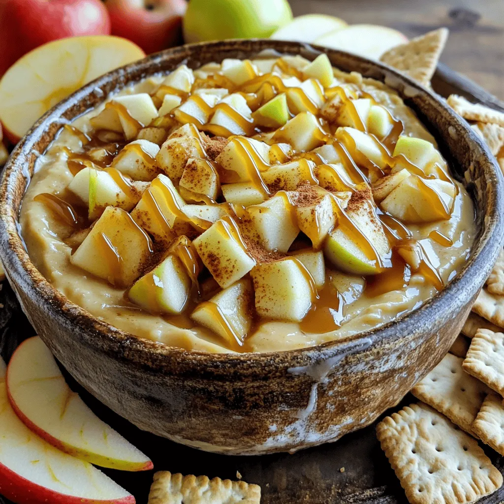 Transfer your dip to a serving bowl. For a nice touch, drizzle some extra caramel sauce on top. Serve it right away with graham crackers or apple slices. I love to present it in a rustic bowl, garnished with extra diced apples and a sprinkle of cinnamon. Arrange the graham crackers and apple slices around the bowl for a fun snack platter. Enjoy your creamy, sweet treat!