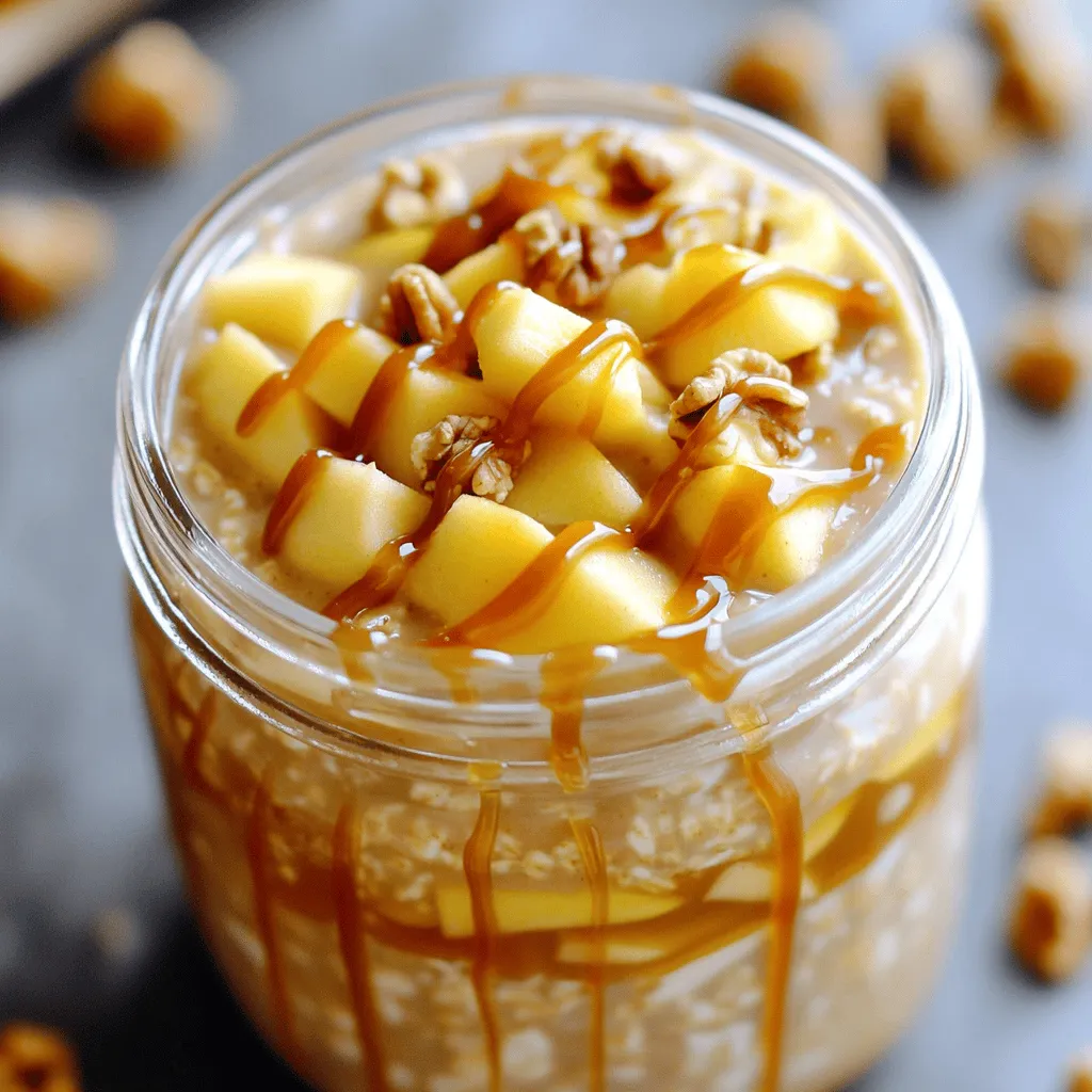 - 1 cup rolled oats - 1 ½ cups unsweetened almond milk (or milk of choice) - 1 medium apple, peeled, cored, and diced - 2 tablespoons caramel sauce (store-bought or homemade) - 1 tablespoon maple syrup (optional, for sweetness) - 1 teaspoon ground cinnamon - ½ teaspoon vanilla extract - ¼ cup Greek yogurt (optional, for creaminess) - Chopped nuts (walnuts or pecans) for topping - Additional caramel sauce for drizzling on top Gathering the right ingredients is key. I love using rolled oats because they soak up the flavors well. Almond milk works great, but any milk you prefer is fine too. For sweetness, I usually add caramel sauce and maple syrup. If you want more flavor, cinnamon and vanilla are must-haves. Don't forget the apple! A fresh, chopped apple gives the oats a nice crunch. Greek yogurt adds creaminess, but you can skip it if you want. Toppings like chopped nuts make each bite special, and a drizzle of caramel sauce on top is the perfect finish. This simple list of ingredients makes for a tasty breakfast treat. You can customize it to your liking, making it fun to experiment. Start with this base and let your creativity shine! - In a large bowl, combine 1 cup of rolled oats with 1 ½ cups of almond milk. - Stir well to ensure all oats are soaked. - Add 1 diced apple, 2 tablespoons of caramel sauce, 1 tablespoon of maple syrup, 1 teaspoon of ground cinnamon, ½ teaspoon of vanilla extract, and ¼ cup of Greek yogurt if you want extra creaminess. - Mix everything until it is well blended. - Divide the mixture into two jars or airtight containers. - Seal the jars and place them in the fridge overnight. This helps the oats soften and absorb flavors. - In the morning, take the jars out and stir the oats well. - If the mixture feels too thick, add a splash of almond milk to make it creamy. - Top your oats with chopped nuts and an extra drizzle of caramel sauce for a sweet finish. - Make sure your oats are fully submerged in the milk. This helps them soften well overnight. - You can adjust the sweetness with maple syrup. A little goes a long way, so add as needed. - Try using different types of apples. Granny Smith gives a tart bite, while Fuji adds sweetness. - Experiment with toppings like chopped nuts, seeds, or dried fruits. Each adds a new flavor and crunch. {{image_2}} You can switch things up with different types of milk. Try cow's milk or oat milk. Each will give a unique taste. You can also swap Greek yogurt for dairy-free options. Coconut yogurt works well for a creamy texture. For extra spice, add nutmeg or ginger. Just a pinch can change the flavor. If you love chocolate, toss in some chocolate chips. Dried cranberries can also add a nice chewiness. These small additions can make your oats even more delightful. You can keep leftover caramel apple pie overnight oats in the fridge for up to three days. Use airtight containers to keep them fresh. I recommend glass jars for storing. They help you see the oats and keep flavors intact. Plastic containers work too, but glass is best. You can prepare these oats ahead for busy mornings. Just make the oats the night before and let them soak. If you want to store them longer, you can freeze them. To freeze, divide the mixture into jars, seal them well, and place them in the freezer. When you're ready to eat, move a jar to the fridge the night before. Let it thaw overnight, and it will be ready in the morning. Overnight oats last up to three days in the fridge. Store them in airtight containers to keep them fresh. I suggest using glass jars. They help you see the oats and look nice, too. If you notice any changes in smell or texture, it’s best to throw them out. You can use quick oats, but they change the texture. Quick oats soak up liquid faster, making the dish mushy. Rolled oats give a nice chewy bite. For the best taste, stick to rolled oats when making caramel apple pie overnight oats. To make this recipe vegan, swap Greek yogurt for a plant-based option. Use almond milk or any non-dairy milk. You can also use maple syrup as your sweetener. This way, you keep all the flavor without any animal products. Enjoy your delicious vegan caramel apple pie overnight oats! This blog post covered delicious overnight oats. We looked at ingredients, step-by-step prep, and storage tips. You can customize flavors and adjust sweetness to fit your taste. Remember, these oats are easy to make ahead for busy mornings. They last for three days, making them a perfect choice for quick breakfasts. Enjoy experimenting with different fruits and toppings for variety. This simple dish is healthy and flexible, so get creative and make it your own!