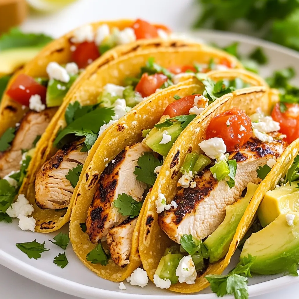 Warm your corn tortillas in the same pan for a bit. Just 30 seconds on each side works well. Assemble your tacos by placing sliced chicken on each tortilla. Add shredded lettuce, diced tomatoes, and avocado slices. If you like, sprinkle on crumbled feta cheese. Finish with fresh cilantro and a squeeze of lime juice. Serve right away with lime wedges on the side. Enjoy every flavorful bite!