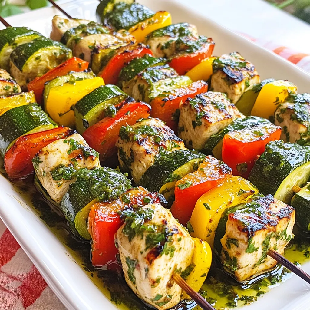Delicious chicken skewers marinated in a vibrant chimichurri sauce, grilled to perfection with colorful vegetables.