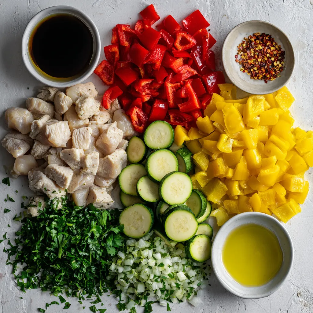 Next, prepare your veggies. Cut 1 red bell pepper and 1 yellow bell pepper into 1-inch pieces. Slice 1 medium zucchini into thick rounds. Toss them in a drizzle of olive oil, salt, and pepper. Now, take your skewers. Thread the marinated chicken, bell peppers, and zucchini onto the skewers. Alternate the ingredients for a colorful look.