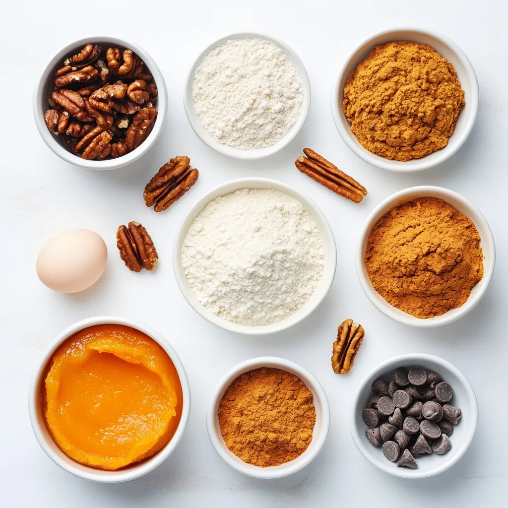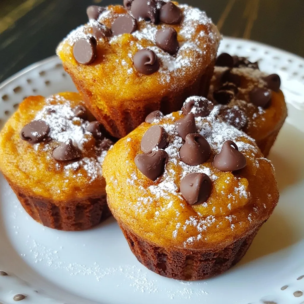 - 1 cup canned pumpkin puree - 1/2 cup granulated sugar - 1/2 cup brown sugar, packed - 1/3 cup vegetable oil The star of this recipe is the canned pumpkin puree. It brings moisture and a lovely flavor. The sugars, both granulated and brown, add sweetness and depth. The vegetable oil keeps the muffins soft and tender. - 1 1/2 cups all-purpose flour - 1 teaspoon baking soda - 1/2 teaspoon baking powder - 1 teaspoon ground cinnamon - 1/2 teaspoon ground nutmeg - 1/4 teaspoon ground ginger - 1/4 teaspoon salt These dry ingredients work together to create the perfect muffin structure. The all-purpose flour gives it body. Baking soda and baking powder help the muffins rise. The spices bring warmth and fall flavor. - 1 cup chocolate chips (semi-sweet or dark) - Optional: 1/2 cup chopped nuts (walnuts or pecans) Chocolate chips make these muffins extra special. You can choose semi-sweet or dark for your taste. If you like a crunch, add chopped nuts. Walnuts or pecans add nice texture. {{ingredient_image_1}} First, you need to preheat your oven to 350°F (175°C). This ensures even baking. While the oven heats, prepare your muffin tin. You can line it with paper liners or grease it with cooking spray. Next, grab a large mixing bowl. Combine 1 cup of canned pumpkin puree, 1/2 cup of granulated sugar, and 1/2 cup of packed brown sugar. Mix these ingredients until the mixture is smooth. Then, add 1/3 cup of vegetable oil, 2 large eggs, and 1 teaspoon of vanilla extract. Beat everything together until it is fully combined and creamy. In another bowl, whisk together 1 1/2 cups of all-purpose flour, 1 teaspoon of baking soda, and 1/2 teaspoon of baking powder. Add in 1 teaspoon of ground cinnamon, 1/2 teaspoon of ground nutmeg, 1/4 teaspoon of ground ginger, and 1/4 teaspoon of salt. Make sure all the dry ingredients are well mixed. Now, gradually fold the dry ingredients into the wet mixture. Stir until just combined. It’s okay if there are a few lumps; don’t overmix. Finally, gently fold in 1 cup of chocolate chips. If you want, you can also add 1/2 cup of chopped nuts for extra crunch. Now it’s time to fill the muffin cups. Divide the batter evenly among the 12 cups, filling each about 2/3 full. This allows space for the muffins to rise. Bake in the preheated oven for 18-20 minutes. To check for doneness, insert a toothpick into the center of a muffin. If it comes out clean, your muffins are ready. After baking, allow the muffins to cool in the tin for about 5 minutes. Then, transfer them to a wire rack to cool completely. To get the perfect muffin texture, focus on your mixing. Combine wet and dry ingredients just until they blend. This keeps muffins light and fluffy. If your batter looks a bit lumpy, that’s okay! It helps keep them soft. Prevent overmixing by using a gentle hand. Stir slowly, and stop mixing as soon as you see no dry flour. The less you mix, the better your muffins will be. For serving, dust your muffins with powdered sugar for a sweet touch. You can also add a dollop of whipped cream on top. This makes them feel extra special. Store your muffins in an airtight container at room temperature. They stay fresh for a few days. If you want to save them longer, freeze them. Just thaw them at room temperature when you’re ready to enjoy. If your muffins turn out too dry, it may be from overbaking. Keep an eye on them in the oven. A toothpick should come out clean but not dry. Muffins can also be dense if you mix too much. Remember, lumps are okay! If they still seem heavy, check your baking powder and soda. Make sure they are fresh for the best rise. Pro Tips Use Fresh Pumpkin: For a richer flavor, consider using fresh pumpkin instead of canned. Roast and puree your pumpkin for a homemade touch. Storage Tips: Keep your muffins in an airtight container at room temperature for up to 3 days, or freeze them for longer storage. Variations: Experiment with different add-ins like dried cranberries, coconut flakes, or white chocolate chips for unique flavor combinations. Check for Doneness: To ensure your muffins are perfectly baked, perform the toothpick test; it should come out clean or with a few moist crumbs. {{image_2}} You can easily change the flavor of these muffins. Try adding spices like cloves or allspice. These spices boost the cozy taste of pumpkin. You can also use different types of chocolate. If you prefer, switch to milk chocolate or white chocolate. Each choice gives a unique twist to the muffins. Experimenting with flavors makes each batch special. If you need gluten-free options, replace all-purpose flour with a gluten-free blend. Many brands work well in baking. For vegan substitutions, use flax eggs instead of regular eggs. Mix one tablespoon of ground flaxseed with three tablespoons of water for each egg. You can also swap dairy with plant-based milk or oil. These changes keep the muffins tasty and suitable for everyone. If you enjoy nuts, walnuts or pecans add great crunch. Just chop them up and fold them into the batter. If you want a nut-free version, simply leave them out. The muffins still taste amazing without nuts. You can also try seeds like pumpkin or sunflower for extra texture. This way, you can customize the muffins to fit your needs. To store your chocolate chip pumpkin muffins at room temperature, let them cool completely first. Place them in an airtight container. This keeps the muffins soft and fresh. You can leave them out for up to three days. If you want to keep them longer, consider refrigerating them. For long-term storage, freezing muffins works best. First, wrap each muffin tightly in plastic wrap. Then place the wrapped muffins in a freezer bag or container. This way, they stay fresh for up to three months. When you're ready to enjoy, just take them out and let them thaw at room temperature. To warm your muffins, preheat the oven to 350°F (175°C). Place the muffins on a baking sheet. Heat for about 10 minutes. This method keeps the muffi