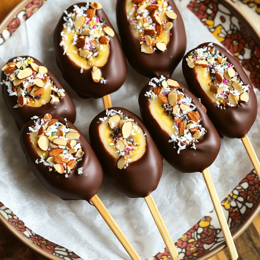 To make these tasty treats, gather these simple ingredients: - 3 ripe bananas - 1 cup dark chocolate chips - 1 tablespoon coconut oil - 1/4 cup crushed nuts (e.g., almonds, walnuts) - 1/4 cup shredded coconut - 1/4 cup sprinkles (optional) - 6 wooden popsicle sticks These ingredients make it easy to create a fun and yummy snack. You can get creative with toppings! Here are some ideas: - Use white or milk chocolate instead of dark chocolate. - Add peanut butter for a creamy twist. - Try crushed cookies for extra crunch. - Use festive sprinkles for holidays or parties. - Drizzle caramel or melted chocolate on top. These options let you make each pop unique and special. Each serving of a Chocolate Covered Banana Pop has: - Calories: Approximately 150 - Total Fat: 7g - Saturated Fat: 4g - Carbohydrates: 22g - Fiber: 2g - Protein: 2g This treat is a fun way to enjoy fruit while adding some extra nutrition! First, peel the ripe bananas. Make sure they are yellow with a few brown spots. Slice each banana in half across the middle. This gives you six pieces. Take a wooden popsicle stick and insert it into each half. Push it in gently but firmly. This stick will help you hold the banana while you dip it in chocolate. Now, grab a microwave-safe bowl. Add one cup of dark chocolate chips and one tablespoon of coconut oil to the bowl. The coconut oil helps the chocolate melt smoothly. Microwave the bowl on medium power for 30 seconds. Take it out and stir. Repeat this process until the chocolate is fully melted and smooth. This should only take a few minutes. Next, take each banana half and dip it into the melted chocolate. Make sure to coat it evenly. Let any extra chocolate drip back into the bowl. You want a nice layer but not too thick. While the chocolate is still wet, roll or sprinkle your banana pops with toppings like crushed nuts, shredded coconut, or colorful sprinkles. Press gently to make sure they stick. Finally, you need to freeze the pops. Take a cup or a freezer-safe container. Stand the banana pops upright in it. Place them in the freezer for at least two hours. This helps the chocolate set and firms up the bananas. Once done, the pops are ready to enjoy! When making chocolate-covered banana pops, there are a few mistakes to dodge. First, do not use bananas that are too ripe. They can become mushy once frozen. Second, avoid rushing the melting process. If you overheat chocolate, it can become thick and hard to use. Lastly, ensure you coat the bananas well. A thin layer of chocolate won’t stick to the banana as well. Melting chocolate requires some care. Use a microwave-safe bowl to avoid burns. Start with medium power for short times. Heat for 30 seconds, then stir. Repeat until smooth. Adding coconut oil helps the chocolate stay shiny and smooth. This also makes it easier to dip the bananas. If you do not have a microwave, use a double boiler. This method allows for gentle heating and reduces the risk of burning. Presentation can make your pops even more fun. Arrange the banana pops on a colorful plate. You can use parchment paper for an easy cleanup. To make them look fancy, drizzle more melted chocolate over the top before serving. Adding a few sprinkles on the plate can brighten up the display. These small touches can impress your guests and make the treat feel special. {{image_2}} You can switch up the chocolate to change the flavor. White chocolate adds a sweet touch. It contrasts well with the banana's natural taste. Milk chocolate offers a creamier option and is a classic choice. Both types melt just like dark chocolate. Just remember to adjust the toppings if you change the coating. Adding flavors can take your pops to another level. You can spread peanut butter on the banana before dipping. This adds a rich and nutty flavor. Mint extract is another great choice. Just add a few drops to the chocolate while melting. Both options give a fun twist to the classic recipe. Make your pops festive with themed toppings. For holidays, use colorful sprinkles that match the occasion. You can also dip them in fruit puree for a fruity flair. Strawberry or raspberry puree pairs well with bananas. These seasonal touches make your treats fun and appealing for any gathering. To keep your chocolate covered banana pops fresh, wrap each pop in plastic wrap. You can also place them in a freezer bag. This prevents freezer burn and keeps them tasty. These pops last up to two months in the freezer. For best taste, eat them within one month. Keep them in a spot where they won’t get squished. Avoid stacking them, as this can ruin their shape. You don’t need to reheat these pops. They are best served cold and frozen. Just take them out of the freezer and let them sit for a few minutes before enjoying. This makes them easier to bite into. Yes, you can use frozen bananas. However, fresh bananas work better. Frozen bananas may get mushy. They can still taste great, but the texture changes. If using frozen bananas, let them thaw slightly before dipping. To stop the chocolate from cracking, make sure you melt it well. Use coconut oil to help the chocolate stay smooth. Dip the bananas while the chocolate is warm. Avoid freezing them for too long. This keeps the chocolate from becoming too hard. You can try white chocolate or milk chocolate. Nut butter like peanut butter is a fun choice too. Yogurt is another option for a creamy dip. You can also dip them in melted dark chocolate with fun flavors added. Chocolate Covered Banana Pops last about one month in the freezer. For best taste, eat them within two weeks. Wrap them well to keep them fresh. Use freezer bags or containers to avoid freezer burn. Chocolate covered banana pops are fun and easy to make. You learned about ingredients, steps, and tips for the best results. I shared ideas for toppings and variations to spark your creativity. Remember to avoid mistakes like chocolate cracking and follow proper storage methods. These pops can be a tasty trea