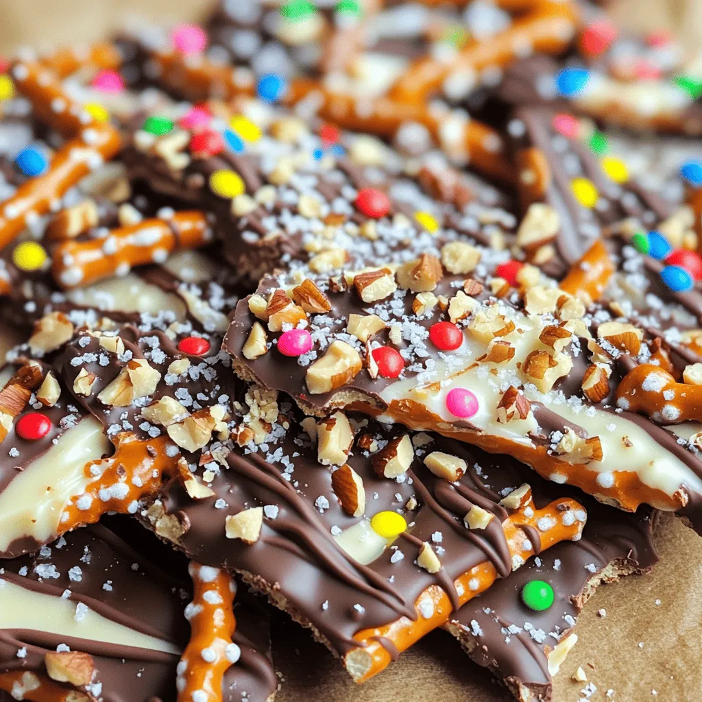 For this chocolate covered pretzel bark, the ingredients are key. The pretzel sticks give a nice crunch, while the chocolate adds sweetness. You can use semi-sweet chocolate chips for a rich flavor. The white chocolate chips provide a nice contrast. Adding nuts, like almonds or peanuts, gives extra texture. Colorful sprinkles make it fun and appealing.
