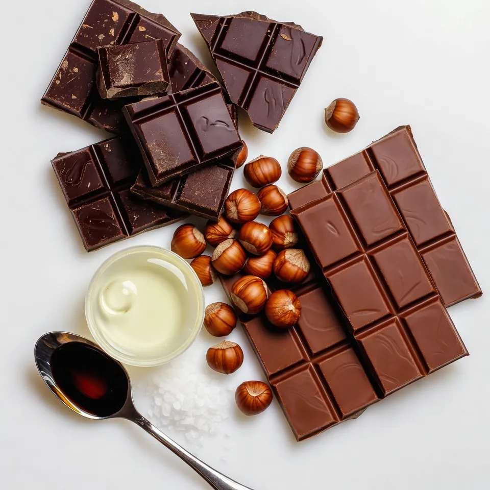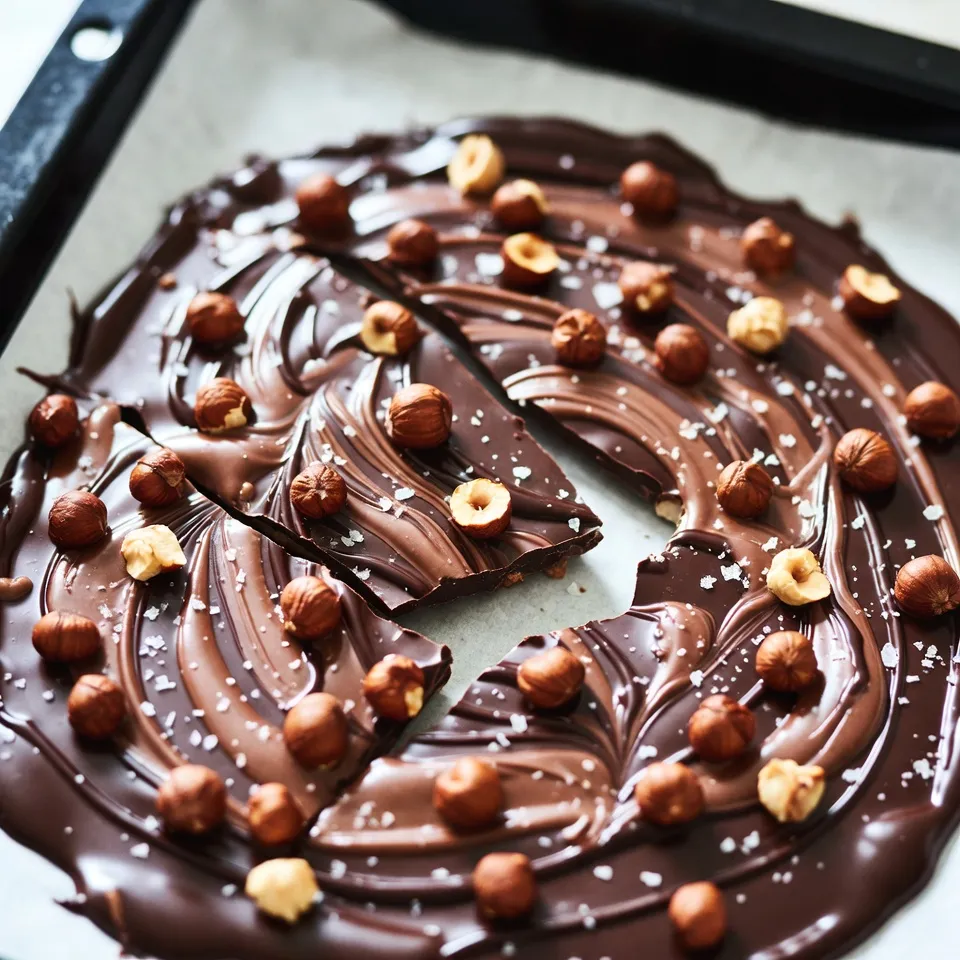 - Chocolate varieties: - 200g dark chocolate (70% cocoa or higher) - 100g milk chocolate - Hazelnuts: - 100g hazelnuts, roasted and roughly chopped - Additional ingredients: - 1 tablespoon coconut oil (optional, for extra shine) - Sea salt flakes, for sprinkling - 1 teaspoon vanilla extract (optional) Chocolate hazelnut bark is simple yet rich in flavor. You can choose dark chocolate for depth and milk chocolate for sweetness. Roasted hazelnuts add a nice crunch and nutty taste. I love using coconut oil. It gives the bark a glossy finish. Sea salt flakes offer a sweet and salty balance. Lastly, vanilla extract boosts the overall flavor. Feel free to customize the ingredients to fit your taste. {{ingredient_image_1}} To start, you need to line your baking tray. Grab an 8x8 inch tray and cut a piece of parchment paper. Make sure it hangs over the edges. This helps when you remove the bark later. If the paper is large enough, it will make lifting the bark easy and clean. Now, let’s melt the chocolate. You can use two methods: a double boiler or a microwave. For the double boiler, fill a pot with water and bring it to a simmer. Place a heatproof bowl on top, ensuring it doesn’t touch the water. This method helps control the heat. If you choose the microwave, put the chocolate in a bowl. Heat it in 30-second bursts. Stir after each burst until it’s smooth. Remember, chocolate can burn easily, so watch the temperature. Stirring is key to keeping it smooth. Once your chocolates are melted, it’s time to layer. First, pour the dark chocolate into the lined tray. Use a spatula to spread it evenly. Next, drizzle the milk chocolate over the dark. Grab a toothpick or skewer and swirl it around. This creates a pretty marbled effect. Now, sprinkle the chopped hazelnuts over the top. Press them down gently so they stick. For the final touch, add a sprinkle of sea salt. This gives a nice sweet and salty contrast. Let it cool in the fridge for at least two hours until set. When ready, lift the bark out and break it into pieces. Enjoy your tasty treat! To achieve the best taste and look, I suggest using dark chocolate with 70% cocoa or higher. This gives your bark a rich, deep flavor. If you want a glossy finish, add one tablespoon of coconut oil when melting the chocolate. The coconut oil adds shine and a hint of flavor. You can also mix in a teaspoon of vanilla extract for extra depth. Sometimes chocolate can turn grainy. If this happens, stir in a tiny bit of coconut oil while melting. This helps smooth it out. To ensure an even spread of chocolate, pour it into the tray and use a spatula to spread it into the corners. Take your time, and don’t rush this step. A smoother surface makes for better presentation. Chocolate hazelnut bark pairs well with many drinks. Try it with coffee or a glass of milk. It also goes great with a scoop of vanilla ice cream. When you present the bark, break it into uneven pieces for a rustic look. Place them on a nice plate, and sprinkle a few extra hazelnuts on top for a beautiful touch. Pro Tips Use Quality Chocolate: The flavor of your bark will greatly depend on the quality of chocolate you use. Opt for high-quality dark and milk chocolate for the best results. Temperature Matters: Be sure to let the melted chocolate cool slightly before pouring it into the tray. This helps prevent the layers from mixing too much. Experiment with Toppings: Feel free to add other toppings like dried fruits, seeds, or even a drizzle of caramel for a unique twist on your bark. Storage Tips: Store the bark in an airtight container in a cool place to maintain its texture and flavor. It can last up to two weeks if kept properly. {{image_2}} You can change the chocolate types to fit your taste. Use white chocolate instead of dark for a sweeter twist. You can also try other nuts like almonds or pecans. Adding spices like cinnamon or a hint of chili can create a new flavor adventure. You can even mix in extracts like almond or orange for a fun twist. If you're looking for vegan options, use dark chocolate with no milk. You can swap the milk chocolate for a vegan chocolate brand. For a gluten-free treat, just make sure your chocolate does not contain any gluten. Most dark and milk chocolates are gluten-free, but always check the label. For holidays, add colorful sprinkles or festive decorations. You can make it themed for Halloween by adding orange and black sprinkles. For Christmas, try crushed peppermint candies on top. These small changes make your bark great for parties or gifts. Get creative and let the season inspire your designs! Keep your chocolate hazelnut bark fresh by storing it in a cool place. Use an airtight container to avoid moisture. A glass jar or plastic container works well. Make sure to keep it away from heat sources, like the stove or direct sunlight. If it’s warm, place the container in the fridge. This helps prevent melting. However, let it sit at room temperature for a bit before eating. This way, you enjoy its rich taste and smooth texture. Chocolate hazelnut bark can last up to two weeks when stored properly. After two weeks, it may start to lose its flavor. Look for signs of spoilage. If it looks dull or develops a white film, it may not taste good anymore. Discard any bark that smells off or feels sticky. Always trust your senses! You can skip coconut oil if you want. The chocolate will still taste great. To get a nice shine, melt your chocolate slowly. Stir it well while melting. This helps keep it smooth. You can also add a little bit of butter for shine. Yes, you can use pre-roasted hazelnuts. They save time and add a nice flavor. However, fresh hazelnuts can have a richer taste. Pre-roasted nuts may also have a crunchier texture. If you prefer a softer bite, roast your own nuts at home. You can get creative with toppings! Try adding dried fruits like cranberries or apricots. Chopped nuts like almonds or pistachios work well too. You can even sprinkle som
