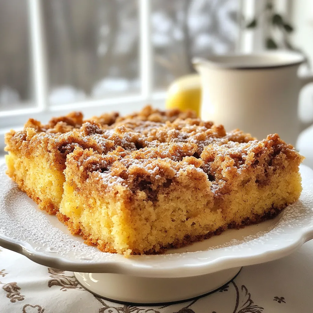 A delicious coffee cake topped with a cinnamon streusel, perfect for pairing with your favorite coffee.