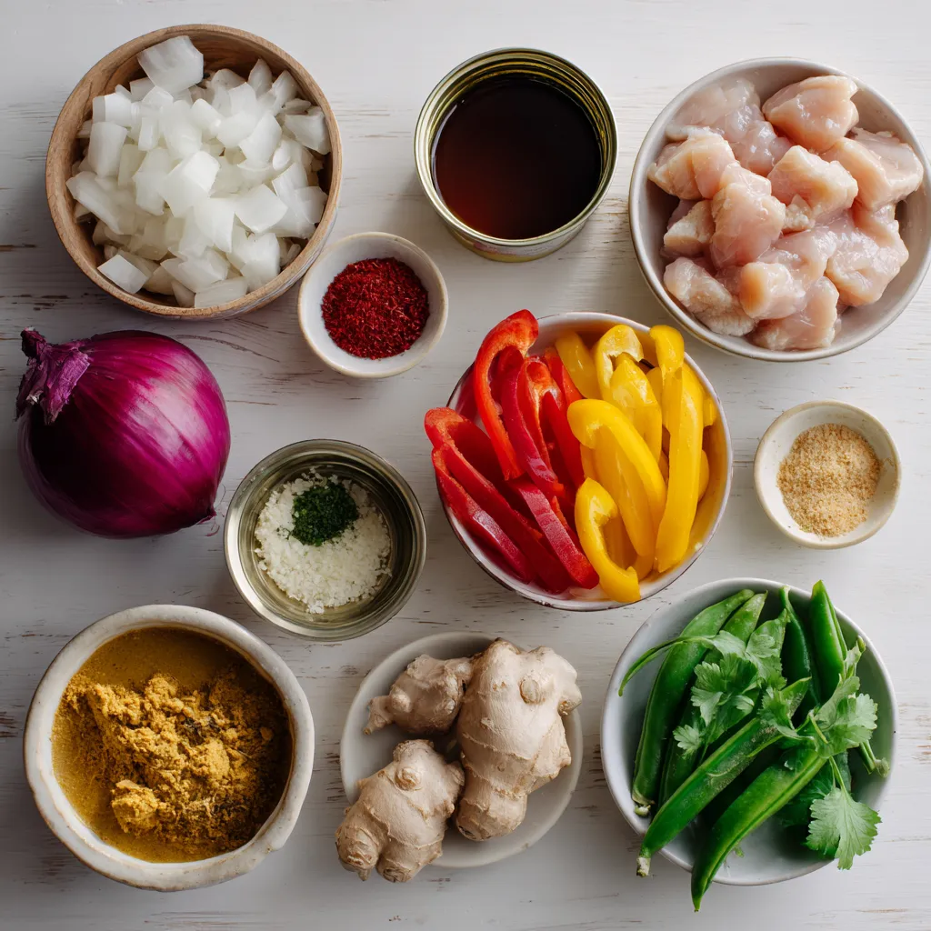 To start, gather your ingredients. You need one pound of boneless chicken thighs. Cut them into small pieces. Next, finely chop one medium onion. Mince three cloves of garlic and grate one tablespoon of fresh ginger. Slice one bell pepper and prepare one cup of snap peas. Finally, measure out your curry paste, coconut milk, fish sauce, and brown sugar.