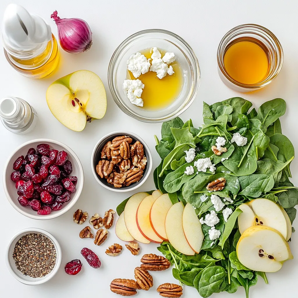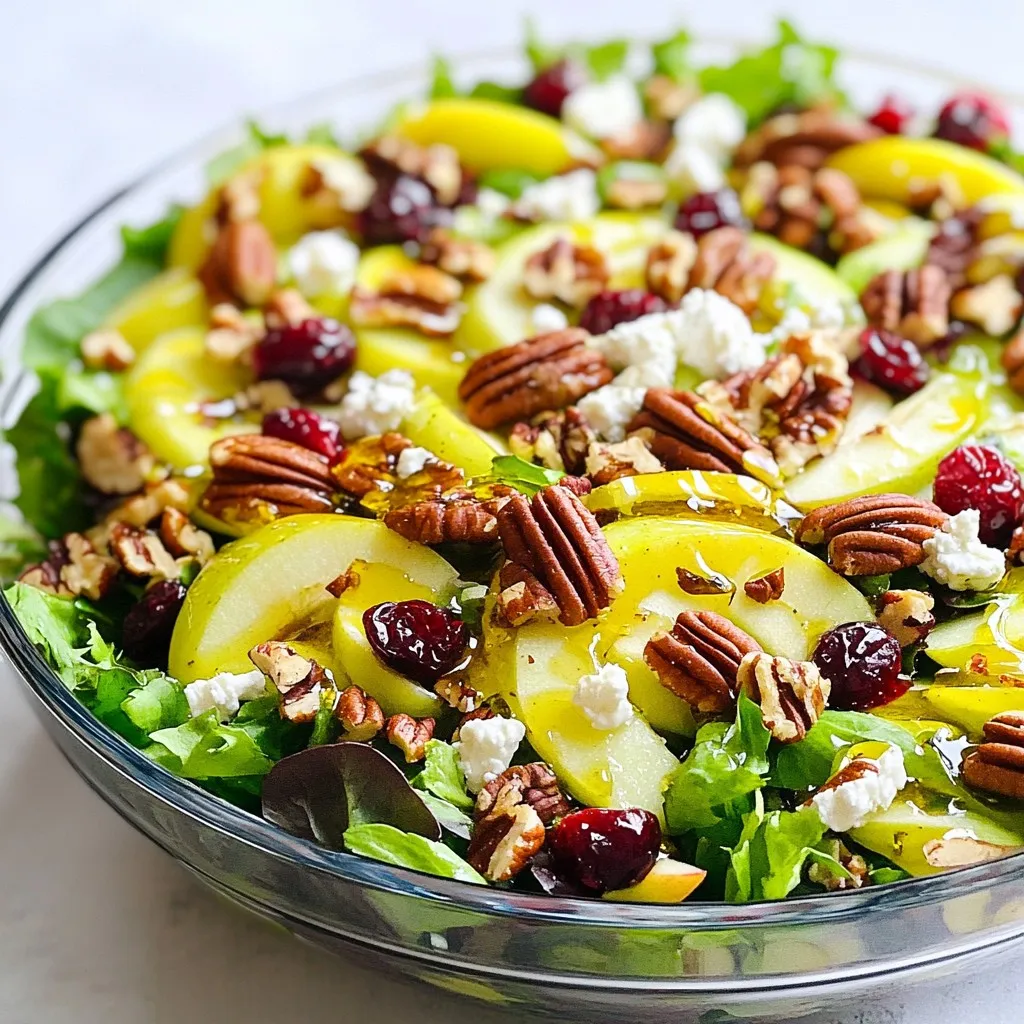 - 4 cups mixed salad greens (spinach, arugula, kale) - 1 large apple, cored and thinly sliced (preferably Honeycrisp or Fuji) - 1 cup fresh cranberries (or dried if out of season) - 1/2 cup pecans, toasted - 1/4 cup feta cheese, crumbled (optional) - 1/4 cup red onion, thinly sliced - 1/4 cup olive oil - 2 tablespoons apple cider vinegar - 1 tablespoon maple syrup - Salt and pepper to taste This salad is a bright mix of flavors and colors. The greens bring a fresh crunch. For the apple, I suggest using a Honeycrisp or Fuji. They add a sweet and juicy bite. If apples are not in season, you can use dried cranberries. Just make sure they are unsweetened to keep the taste balanced. The pecans add a toasty crunch. Toast them in a dry pan over low heat for about 5 minutes. You want them fragrant but not burnt. If you like cheese, you can add feta for a creamy touch. For the dressing, you need olive oil, apple cider vinegar, maple syrup, and some salt and pepper. This mix ties everything together and makes the salad pop. Each ingredient plays a role in creating a tasty and healthy dish. {{ingredient_image_1}} First, rinse and dry the fresh cranberries. This will help remove any dirt and enhance their taste. If you prefer dried cranberries, make sure they are unsweetened. This keeps the balance of flavors just right. Next, let’s toast the pecans. Place them in a dry skillet over medium heat. Stir them for about five minutes until they smell fragrant. Keep an eye on them to avoid burning. Toasted pecans add a warm, nutty flavor to the salad. When slicing the apple, use a sharp knife for clean cuts. I love using Honeycrisp or Fuji apples. These varieties are sweet and crisp. Slice the apple thinly to ensure every bite has a bit of the juicy flavor. Now, let's make the dressing. In a small bowl, whisk together olive oil, apple cider vinegar, and maple syrup. This mix brings a sweet and tangy taste. Don’t forget to add salt and pepper for extra flavor. Taste it and adjust as needed. You want it to be just right. For the best flavor, layer your ingredients. Start with the mixed salad greens at the bottom. Next, add the sliced apple, cranberries, and toasted pecans. If you choose to use feta cheese, sprinkle it on top. This adds a creamy contrast to the crunchy salad. When serving, you have two great options. You can divide the salad into individual plates for a nice touch. Or, serve it family-style in a big bowl. This makes it easy for everyone to help themselves. For a special look, arrange the salad in layers. A clear bowl shows off the colorful ingredients beautifully. Choosing the right apple makes a big difference. Honeycrisp apples are sweet and crunchy. Fuji apples also have a nice sweetness. Granny Smith apples are tart and great for a different flavor. Each type gives a unique taste to the salad. I recommend using Honeycrisp or Fuji for the best results. You can change the dressing if you want. Try using lemon juice instead of apple cider vinegar. This gives a bright flavor. For sweetness, consider agave syrup instead of maple syrup. Both options will keep your salad fresh and tasty. You can mix and match to find your favorite. Making your salad look good is fun! Layer the salad in a clear bowl for a great view. This shows off the bright colors of the cranberries and greens. You can also add extra cranberries and pecans on top for a fancy touch. This small step makes your dish look more inviting and appetizing. Pro Tips Choose the Right Apple: Opt for sweet and crisp varieties like Honeycrisp or Fuji for a refreshing crunch. Toast the Pecans: To enhance their flavor, toast the pecans until they are fragrant. This adds depth to the salad. Dress Just Before Serving: To keep the greens crisp, add the dressing right before serving the salad. Experiment with Cheese: Try goat cheese or blue cheese instead of feta for different flavor profiles that complement the salad. {{image_2}} You can boost the Cranberry Apple Pecan Salad with protein. Try adding grilled chicken for a savory twist. Simply slice it thin and toss it in. You can also use chickpeas or black beans for a plant-based option. These additions make the salad more filling and satisfying. Adapting this salad for different seasons makes it fun. In spring, add fresh strawberries for a sweet touch. In summer, include peach slices for a juicy bite. In fall, swap the apple for a pear. You can change the dressing too. A citrus vinaigrette can brighten up the winter months. Making this salad vegan is easy. Skip the feta cheese and use a vegan dressing. For gluten-free eaters, ensure your dressing does not contain gluten. You can also check for gluten-free beans if you add them. These changes keep everyone happy at the table. To keep your salad fresh, store it in an airtight container. This helps avoid wilting. If possible, separate the dressing from the salad until you are ready to eat. Mixing the dressing in too early makes greens soggy. Use a clean spoon each time you serve to keep it fresh. When stored properly, your salad lasts about three days in the fridge. The greens may start to lose their crispness after a day or two. The apples can brown quickly, so eat them sooner. Cranberries and pecans stay good longer, about a week. You can make parts of this salad ahead of time. Wash and dry the greens, then keep them in the fridge. Slice the apples just before serving to keep them crisp and fresh. You can also prepare the dressing a day ahead. Just shake it well before using to mix it back up. To make this salad vegan, skip the feta cheese. You can use a vegan cheese or leave it out completely. For the dressing, replace the maple syrup with agave syrup, if desired. Check that your olive oil is pure and free of animal products. Yes, you can use dried cranberries. They will add a sweet flavor. However, dried cranberries may change the salad's texture. Fresh cranberries provide a nice tart bite, while dried ones are sweeter and chewier. You can 