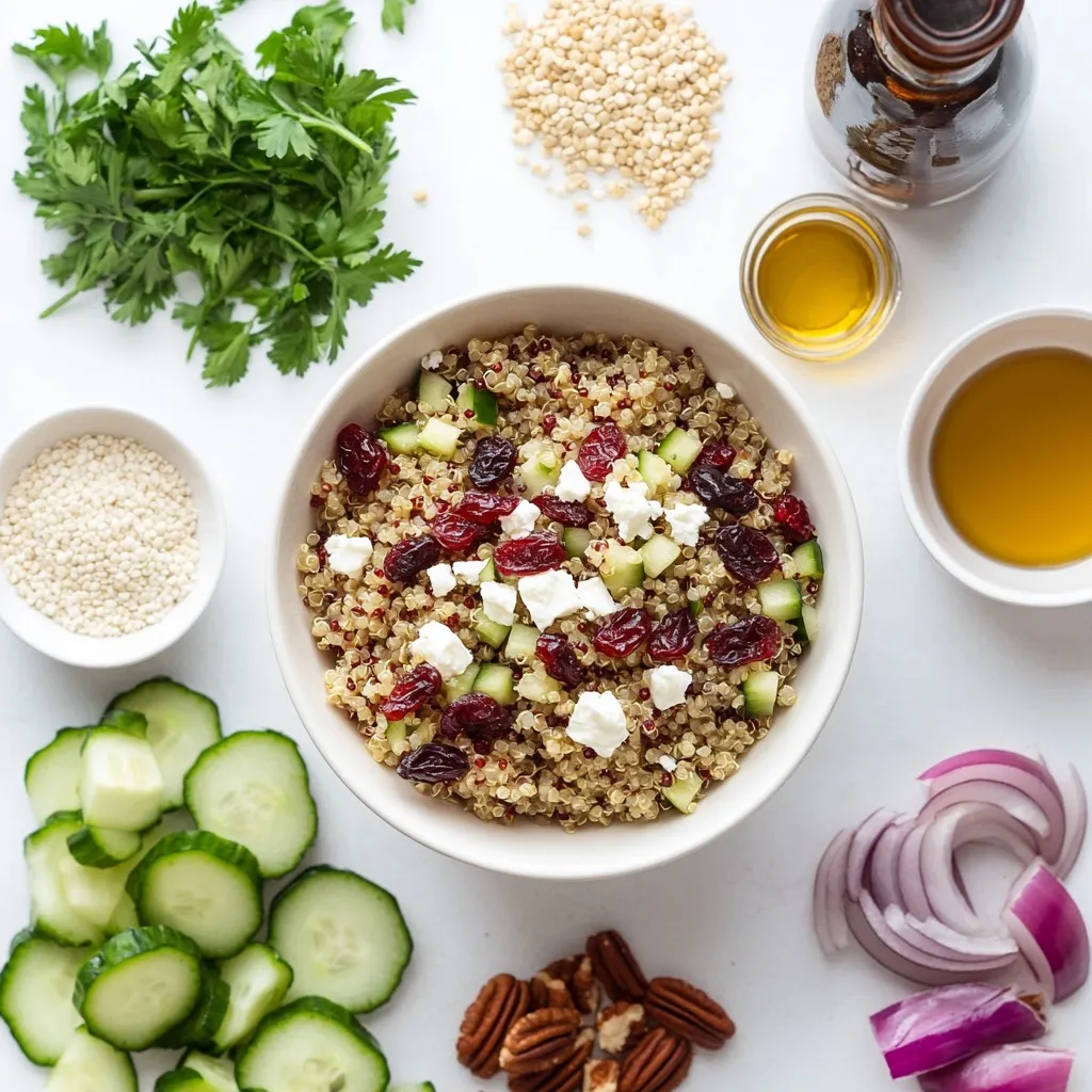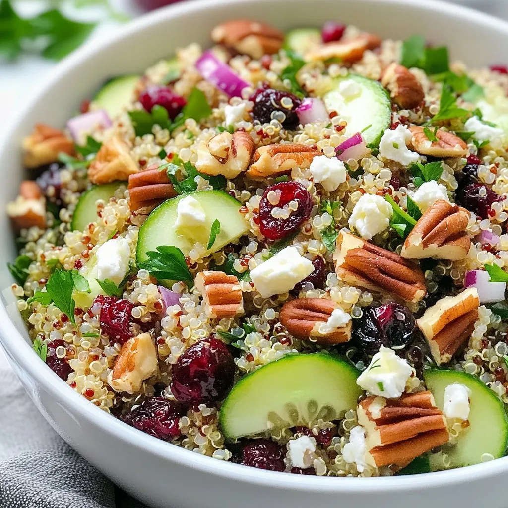 - 1 cup quinoa, rinsed - 2 cups vegetable broth or water - 1/2 cup dried cranberries - 1/2 cup pecans, toasted and roughly chopped - 1/2 cup diced cucumber - 1/4 cup finely chopped red onion - 1/4 cup feta cheese, crumbled (optional) - 2 tablespoons olive oil - 1 tablespoon apple cider vinegar - 1 tablespoon maple syrup - Salt and pepper to taste - Fresh parsley, chopped for garnish The main star of this salad is quinoa. It brings protein and fiber. The dried cranberries add a sweet touch, while toasted pecans give crunch. Diced cucumber offers a fresh bite, and red onion adds zing. Feta cheese is optional but brings creaminess. Olive oil and vinegar create a simple dressing that ties it all together. You can add ingredients to make the salad even better. Try adding diced bell peppers for a sweet crunch. Avocado can make it creamy. Fresh herbs like mint or basil can give a fresh taste. A dash of lemon juice can brighten the flavors. If you need to avoid certain allergens, there are easy swaps. For a nut-free option, skip the pecans or use seeds like pumpkin. If you're dairy-free, leave out the feta cheese. To make it gluten-free, ensure your quinoa is certified gluten-free. You can also use apple juice instead of vinegar for a sweeter dressing. {{ingredient_image_1}} To start, rinse 1 cup of quinoa under cold water. This step removes any bitter taste. In a medium saucepan, combine the rinsed quinoa with 2 cups of vegetable broth or water. Place the saucepan on the stove over medium-high heat. Bring the mixture to a boil. Once it starts boiling, reduce the heat to low. Cover the saucepan and let it simmer for about 15 minutes. The quinoa is done when it absorbs all the liquid and looks fluffy. After cooking, remove the saucepan from heat and let it cool for a few minutes. In a large mixing bowl, add the cooled quinoa. Next, toss in 1/2 cup of dried cranberries, 1/2 cup of toasted pecans, and 1/2 cup of diced cucumber. Add 1/4 cup of finely chopped red onion and 1/4 cup of crumbled feta cheese, if you want a creamy touch. Gently stir these ingredients together. Make sure everything is well mixed. This step helps the flavors blend nicely. For the dressing, grab a small bowl. Whisk together 2 tablespoons of olive oil, 1 tablespoon of apple cider vinegar, and 1 tablespoon of maple syrup. Add salt and pepper to taste. Mix until the dressing is smooth and well combined. Pour this dressing over the quinoa mixture. Toss everything gently to coat the salad evenly. Taste your salad and adjust the seasoning if needed. Let it sit for at least 15 minutes. This resting time allows the flavors to meld together. Before serving, sprinkle fresh chopped parsley on top for a bright finish. To cook quinoa just right, start by rinsing it well. This removes the bitter coating. Use two cups of vegetable broth or water for each cup of quinoa. Bring the liquid to a boil over medium-high heat. Once it boils, lower the heat to a simmer and cover it. Let it cook for about 15 minutes. The quinoa will absorb all the liquid and become fluffy. After cooking, let it cool for a few minutes before using it in your salad. Toasting pecans adds a rich flavor. Start by preheating your oven to 350°F (175°C). Spread the pecans in a single layer on a baking sheet. Bake them for about 8-10 minutes. Keep an eye on them to avoid burning. Stir them halfway through for even toasting. Once they are golden and fragrant, let them cool before chopping. This step makes a big difference in your salad. You can easily tweak this salad to suit your taste. For a tangy kick, add more apple cider vinegar. If you like sweetness, drizzle in extra maple syrup. Fresh herbs like basil or mint can brighten the dish. To make it heartier, toss in some cooked chicken or chickpeas. Always taste the salad before serving and adjust the seasoning with salt and pepper. This way, you ensure the flavors are just right. Pro Tips Rinse the Quinoa: Rinsing quinoa before cooking removes its natural coating, called saponin, which can make it taste bitter. Always rinse under cold water for the best flavor. Toast the Pecans: Toasting pecans enhances their flavor and adds a delightful crunch to the salad. Simply place them in a dry skillet over medium heat for a few minutes until fragrant. Let It Marinate: Allowing the salad to sit for at least 15 minutes before serving helps the flavors meld together, creating a more harmonious dish. Customize Your Add-ins: Feel free to mix in other ingredients like diced apples, olives, or even cooked chickpeas for additional flavor and texture. Get creative! {{image_2}} You can boost the protein in your Cranberry Pecan Quinoa Salad easily. Adding cooked chicken is a great choice. Just shred or cube it and mix it in. Chickpeas are another option. Rinse canned chickpeas and toss them in. Both options make the salad heartier and more filling. Seasonal veggies add flavor and color to your salad. In spring, try adding asparagus or peas. Summer brings fresh tomatoes or bell peppers. In the fall, roasted sweet potatoes taste great. You can even use winter squash for a unique twist. Feel free to mix and match based on what you have. This salad is naturally gluten-free due to quinoa. To keep it vegan, skip the feta cheese. You can replace it with avocado for creaminess. Another option is to use a nut-based cheese. These swaps keep the salad healthy while catering to different diets. Enjoy customizing it to fit your needs. To store leftover cranberry pecan quinoa salad, place it in an airtight container. Make sure to cool the salad first. This helps keep it fresh. You can store it in the fridge for up to four days. If you have any extra dressing, keep it separate to prevent sogginess. The salad tastes best when fresh, but leftovers are still good. If you want to freeze it, place the salad in a freezer-safe bag. It can last up to three months in the freezer. When you are ready to eat it, just thaw it in the fridge overnight. I recommend eating