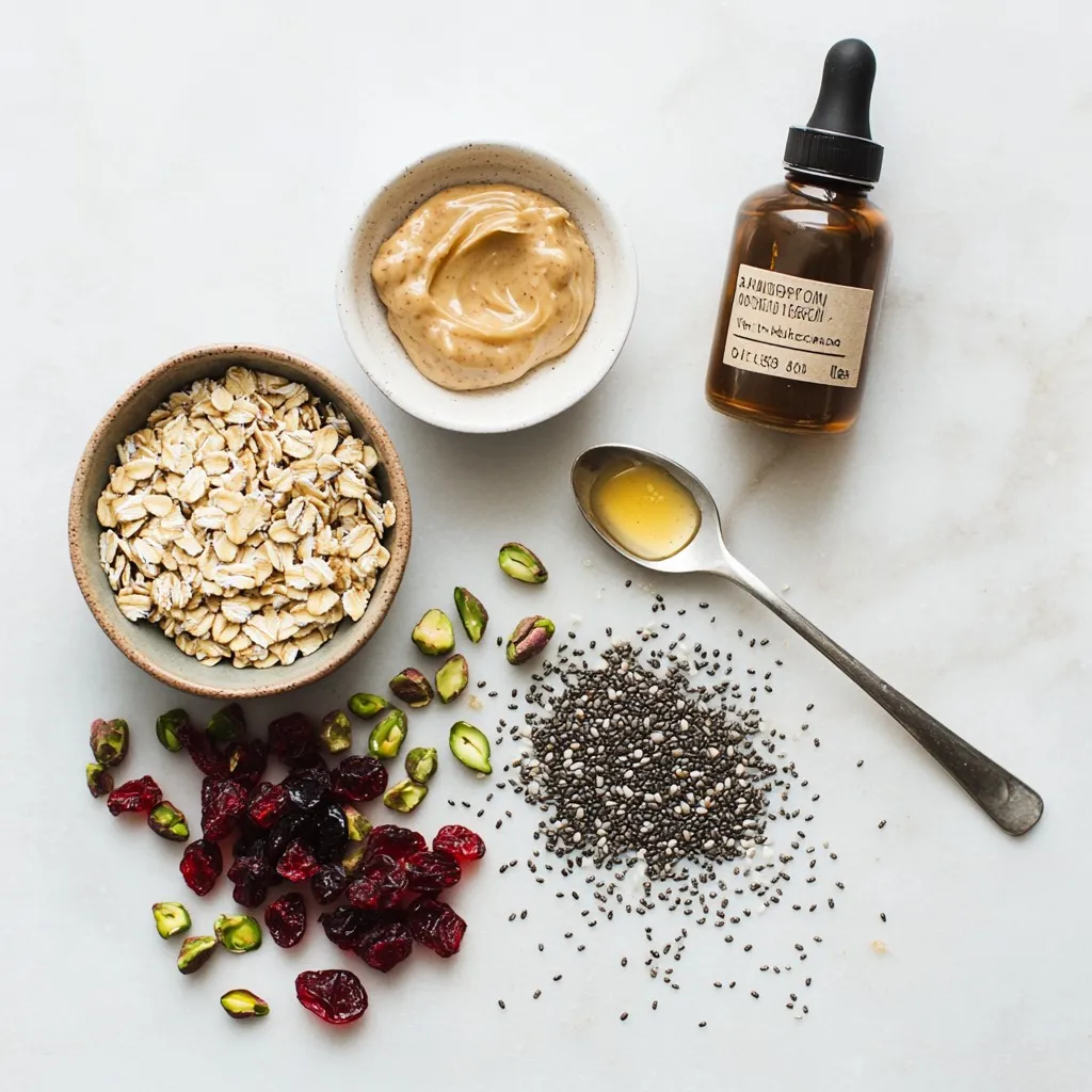 To start, grab a large mixing bowl. Add 1 cup of rolled oats, 1/2 cup of almond butter, and 1/3 cup of honey or maple syrup. Stir everything together. You want it to be sticky and mixed well. Next, add 1 cup of chopped dried cranberries and 1/2 cup of chopped unsalted pistachios. Then mix in 1/4 cup of chia seeds. Don’t forget to add 1 teaspoon of vanilla extract and a pinch of salt. Mix until all ingredients are blended together.