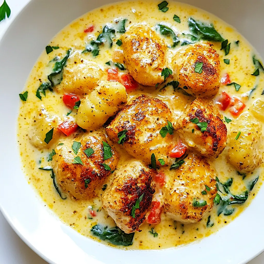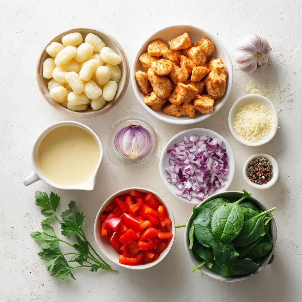 - 1 pound gnocchi - 2 boneless, skinless chicken breasts, cut into bite-sized pieces - 2 tablespoons Cajun seasoning - 2 tablespoons olive oil - 1 medium onion, finely chopped - 3 cloves garlic, minced - 1 red bell pepper, diced - 1 cup heavy cream - 1 cup chicken broth - 1 cup spinach, roughly chopped - 1/2 cup grated Parmesan cheese - Salt and pepper to taste - Fresh parsley for garnish Gnocchi is the star here. It cooks quickly and adds a nice chewy texture. You can find it in most grocery stores. I use 1 pound, which serves about four people. The chicken provides protein and absorbs the Cajun flavors well. I take two boneless, skinless chicken breasts and cut them into bite-sized pieces. Cajun seasoning is crucial. It brings that spicy, earthy flavor. I use 2 tablespoons, but you can adjust it to your taste. For the additional ingredients, olive oil helps to sear the chicken and sauté the veggies. I chop 1 medium onion and add 3 minced garlic cloves. These aromatics build a great base. Next, I dice 1 red bell pepper for sweetness and color. Heavy cream creates that rich sauce, while chicken broth adds depth. I usually grab 1 cup of each. Spinach offers a fresh touch and a pop of green. I chop 1 cup roughly. Parmesan cheese adds creaminess and flavor, so I use 1/2 cup grated. Lastly, salt and pepper to taste, plus fresh parsley for a bright garnish. With these ingredients, you will create a delicious and comforting dish that is easy to make! {{ingredient_image_1}} To cook the gnocchi, start by bringing a large pot of salted water to a boil. Add the gnocchi and watch closely. They will float when they are done, usually in about 2-3 minutes. Use a slotted spoon to remove them and set them aside. For the best texture, don’t overcook them. They should be soft but still have a slight bite. Next, season your chicken. In a bowl, mix the chicken pieces with Cajun seasoning. Make sure each piece is coated well. Heat olive oil in a large skillet over medium-high heat. Sear the chicken for 5-7 minutes until it is browned and cooked through. Remove the chicken from the pan and set it aside. The chicken should be juicy and flavorful. In the same skillet, add the chopped onion and diced red bell pepper. Sauté them for about 3-4 minutes until the onions become translucent. This step builds great flavor. Add minced garlic and cook for another minute. The garlic should smell very fragrant but not burn. Pour in the chicken broth to deglaze the pan. Scrape any browned bits off the bottom. This adds depth to your sauce. Bring the broth to a simmer, then reduce the heat. Stir in the heavy cream and let it simmer gently. This should take just a few minutes. The sauce will get rich and creamy. Now it’s time to put it all together. Add the cooked chicken, chopped spinach, and gnocchi to the sauce. Stir well to combine. Finally, mix in the grated Parmesan cheese. Keep stirring until the cheese melts and everything is creamy. If the sauce is too thick, add a splash of chicken broth. Serve your creamy Cajun chicken gnocchi hot. For a nice touch, garnish with fresh parsley. This adds a pop of color and freshness. Make sure to serve it warm for the best taste. Enjoy your delicious meal! - Adjusting spice levels: Start with two tablespoons of Cajun seasoning. This gives a nice kick. If you prefer less heat, use one tablespoon. For more spice, add another half tablespoon. Taste as you go to find your sweet spot. - Making a homemade Cajun seasoning: Mix these spices for a quick blend: one tablespoon paprika, one teaspoon garlic powder, one teaspoon onion powder, one teaspoon thyme, and a pinch of cayenne. This mix is fresh and full of flavor. You can tweak it based on what you like. - Common mistakes to avoid: Always cook gnocchi in salted boiling water. Don’t overcrowd the pot. This helps them cook evenly. Watch for the gnocchi to float. Once they do, they're ready. Finally, don’t overcook them, or they can turn mushy. - Alternative cooking methods: You can pan-fry cooked gnocchi for extra flavor. Heat some olive oil in a skillet and add the gnocchi. Cook until golden brown for a nice texture. - Substitutes for heavy cream: If you want a lighter dish, use half-and-half. You can also mix milk with a bit of cornstarch to thicken it. Another option is to use coconut cream for a unique twist. - Adding yogurt or cream cheese options: For a tangy flavor, stir in plain Greek yogurt. It adds creaminess without too many calories. Cream cheese is another great choice. Just mix it into the sauce until it melts and thickens. Pro Tips Perfect Gnocchi Cooking: Always cook gnocchi in salted boiling water until they float to the top, indicating they are done. This ensures a light and fluffy texture. Chicken Browning: For best results, ensure the chicken pieces are not overcrowded in the skillet. This allows for proper browning and enhances flavor. Adjusting Spice Levels: If you prefer a milder dish, reduce the Cajun seasoning or add a bit of cream to tone down the heat without losing flavor. Fresh Spinach Addition: Add spinach towards the end of cooking to retain its vibrant color and nutrients, ensuring it wilts perfectly without overcooking. {{image_2}} You can switch up the protein in this dish to keep it fresh. - Shrimp: Use peeled shrimp instead of chicken. Cook them quickly in the skillet. They take about 3-4 minutes to turn pink. - Sausage: Try andouille or chicken sausage for a different flavor. Slice the sausage and cook it until browned. - Vegetarian Alternatives: Use mushrooms or tofu for a plant-based option. Both absorb flavors well and add great texture. If you need gluten-free, there are great options. - Gluten-Free Gnocchi Brands: Look for brands like Capello's or Buitoni. They offer tasty gluten-free gnocchi. - Alternative Thickening Methods: Use cornstarch or arrowroot powder to thicken the sauce. Mix it with a bit of water before adding to the skillet. Adding more veggies can make this dish even better