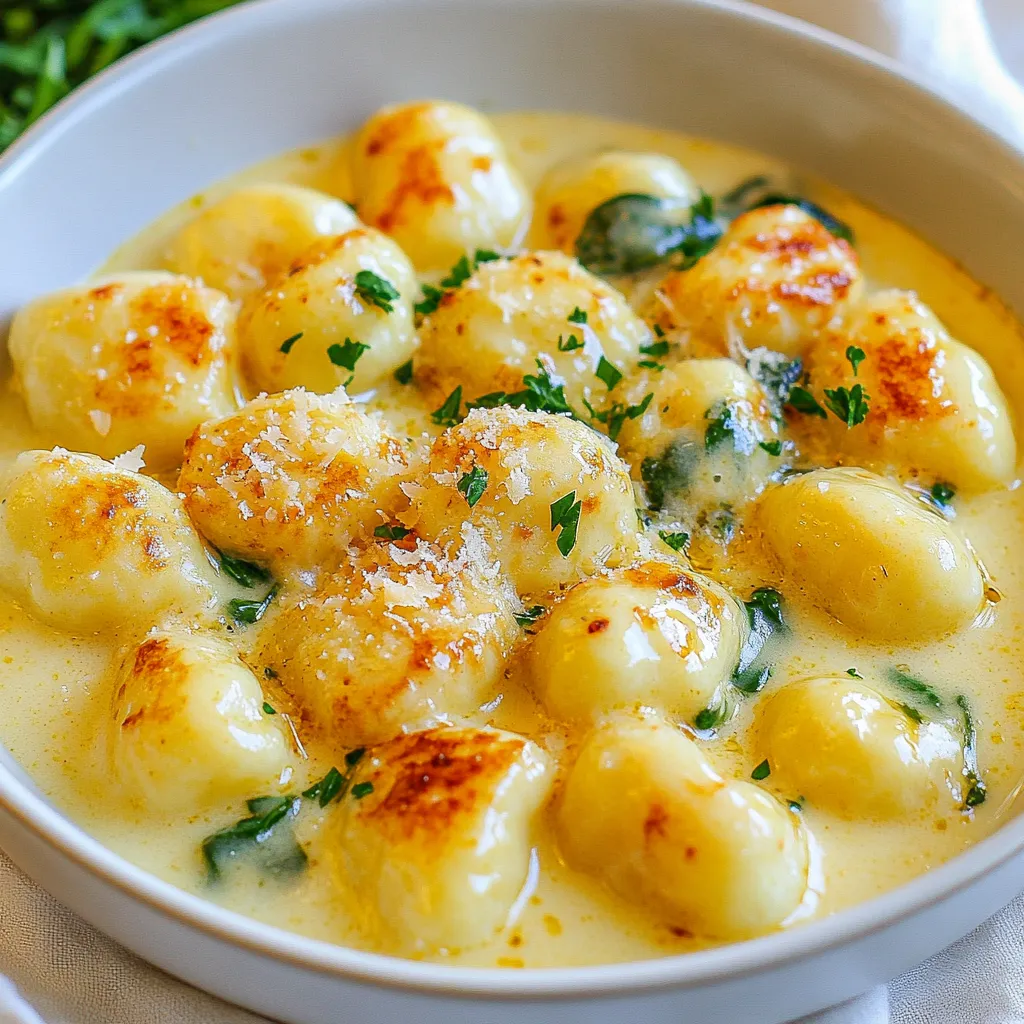 - 1 package (16 oz) potato gnocchi - 4 tablespoons unsalted butter - 4 cloves garlic, minced Potato gnocchi is the star of this dish. It has a soft, pillowy texture. I always choose the best quality for great flavor. Next, unsalted butter adds richness. It melts perfectly, bringing all flavors together. Minced garlic gives a strong, fragrant kick. Make sure not to burn it while cooking. - 1 cup heavy cream - 1 cup freshly grated Parmesan cheese Heavy cream makes the sauce incredibly smooth. It creates a rich base that coats the gnocchi well. Freshly grated Parmesan cheese adds depth. It melts nicely, giving a savory flavor. I recommend grating it fresh for the best taste. - 1 teaspoon Italian seasoning - Salt and pepper to taste - 1 cup fresh spinach, chopped (optional) - Fresh parsley, chopped for garnish Italian seasoning adds a blend of herbs. It enhances the dish's flavors without overpowering them. Salt and pepper are key for balancing taste. Feel free to adjust these to your liking. Fresh spinach is a great optional add-in. It wilts down and adds color. Finally, garnish with fresh parsley. It brightens the dish and makes it look appealing. {{ingredient_image_1}} To cook the gnocchi, first bring a large pot of salted water to a boil. This is important for flavor. Add the gnocchi to the boiling water. They will sink to the bottom at first. Watch closely; when they float to the top, they are ready. This usually takes about 2-3 minutes. Once they float, drain the gnocchi and set them aside. For proper cooking, do not overcrowd the pot. If you add too many gnocchi, they may stick together. You can cook them in batches if needed. Now, let’s make the sauce. In a large skillet, melt 4 tablespoons of unsalted butter over medium heat. This adds richness to the sauce. Add the minced garlic and sauté for 1-2 minutes. Watch carefully to avoid burning the garlic; burnt garlic can ruin the flavor. Next, pour in 1 cup of heavy cream. Bring the mixture to a gentle simmer. Stir occasionally for about 2-3 minutes. This helps the flavors blend. Slowly add 1 cup of freshly grated Parmesan cheese and 1 teaspoon of Italian seasoning. Stir continuously until the cheese melts and the sauce becomes creamy. Season with salt and pepper to taste. Once your sauce is ready, gently add the cooked gnocchi to the skillet. Stir to coat them well with the creamy sauce. If you want, add 1 cup of fresh chopped spinach at this stage. Stir until the spinach wilts and brightens the dish. For serving, use shallow bowls. This gives a nice look. Drizzle a bit of extra Parmesan on top and sprinkle fresh parsley for color. You can also add cracked black pepper for a little kick. Enjoy your creamy garlic Parmesan gnocchi! To get that perfect creamy sauce, focus on the cream’s temperature. Heat the heavy cream gently. If you boil it, the sauce can split. Stir often to keep it smooth. Burnt garlic can ruin your dish. Cook the minced garlic for just 1-2 minutes. Watch it closely. Once it smells good, it’s ready. If it turns dark, start over. To prevent your gnocchi from getting soggy, use a large pot. Boil plenty of salted water. This helps the gnocchi cook evenly. When they float, they are done. Drain them right away. For best results, cook gnocchi in batches. Don't overcrowd the pot. This will keep them light and fluffy. You can try different garnishes. Fresh basil or grated cheese can add flavor. Cracked black pepper adds a nice kick, too. To turn this dish into a fuller meal, serve with a side salad or garlic bread. This adds freshness and balance to your meal. Pro Tips Use Fresh Ingredients: Opt for fresh garlic and high-quality Parmesan cheese to enhance the flavor of your dish significantly. Don't Overcook Gnocchi: Keep an eye on the gnocchi while boiling; they are done as soon as they float to the surface to maintain their texture. Add a Touch of Acid: A splash of lemon juice or a sprinkle of lemon zest can brighten the creamy sauce and balance the richness. Customize Your Greens: Feel free to substitute or add other greens like kale or arugula for added nutrition and color. {{image_2}} You can easily make this dish your own. Try adding proteins like chicken or shrimp. Cook the chicken in the skillet before adding the garlic. For shrimp, add them to the sauce at the same time as the gnocchi. This adds great flavor and makes the dish heartier. You can also incorporate different vegetables. Fresh spinach adds color and nutrients. You can try peas, broccoli, or bell peppers too. Just add them in with the garlic to cook slightly. This adds a nice crunch and boosts the meal's nutrition. If you're looking for dairy-free options, there are great substitutes. Instead of heavy cream, use coconut cream or cashew cream. Both give you a rich feel without dairy. Just blend soaked cashews with water until smooth for a tasty option. For cheese, look for non-dairy cheese alternatives that melt well. Many brands offer products made from nuts or soy. Check the labels to find one that suits your taste. For gluten-free diets, use gluten-free gnocchi. These are often made from rice or potato flour. They cook just like regular gnocchi, so follow the package instructions. You can also swap out any other ingredients that contain gluten. Ensure your seasonings and any added sauces are gluten-free. This way, everyone can enjoy this creamy dish without worry. To store your creamy garlic parmesan gnocchi, first cool it to room temperature. Then, place it in an airtight container. This helps keep the flavors fresh. You can store it in the fridge for about three days. After this time, the texture may change. It’s best to eat it sooner rather than later. When you’re ready to enjoy leftovers, reheat slowly. You can use a skillet on low heat. Add a little cream or butter to help the sauce stay smooth. Stir often to keep everything from sticking. For best results, avoid the microwave. It can make the gnocchi tough and the sauce grainy. To freeze