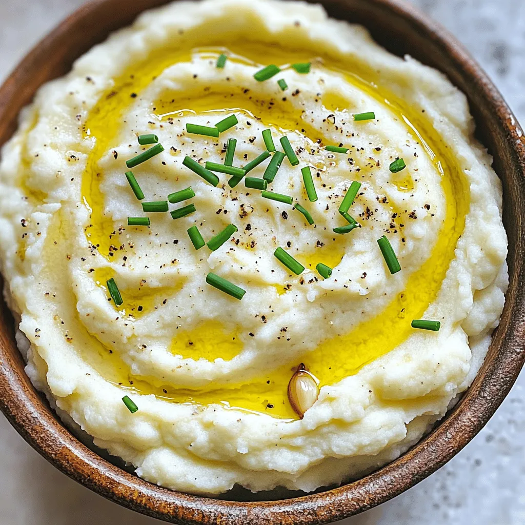 - 1 medium head of cauliflower, cut into florets - 5 cloves of garlic, peeled - 3 tablespoons olive oil - 1/2 cup cream cheese, softened - 1/4 cup milk (or dairy-free alternative) - 1/4 teaspoon nutmeg - Fresh chives, finely chopped For a dairy-free option, use a nut-based cream cheese. You can also swap milk for almond or soy milk. If you want different flavors, try adding spices like paprika or garlic powder. For a twist, mix in a little cheese like Parmesan or cheddar. 1. First, preheat your oven to 400°F (200°C). This heat makes the cauliflower soft and sweet. 2. Next, take a medium head of cauliflower and cut it into florets. 3. In a baking dish, toss the cauliflower florets and 5 peeled garlic cloves with 2 tablespoons of olive oil. 4. Spread the mixture out into an even layer. This helps the cauliflower roast evenly. 1. Roast the cauliflower and garlic in the preheated oven for 25-30 minutes. The goal is for the cauliflower to become tender and the garlic to turn golden brown. 2. After roasting, allow the garlic to cool slightly. Squeeze the garlic cloves out of their skins into a mixing bowl. 3. Add the roasted cauliflower, 1/2 cup of softened cream cheese, and 1/4 cup of milk to the bowl. 4. Use a potato masher or hand mixer to mash everything together until it is creamy and smooth. 1. Season the mixture with salt, pepper, and 1/4 teaspoon of nutmeg if you want. 2. Mix well to combine all flavors. 3. For a little extra flavor, drizzle the remaining 1 tablespoon of olive oil on top before serving. 4. Transfer the creamy mix to a serving dish and garnish with fresh chives, finely chopped. This adds a nice touch of color and flavor. To get that creamy consistency, start with roasted cauliflower. Roasting brings out its sweet flavor. Use a potato masher for a slightly chunky texture or a hand mixer for super smooth results. I love using a hand mixer because it makes the cauliflower light and fluffy. Try adding different seasonings to boost the flavor. You can use garlic powder or smoked paprika for a twist. Fresh herbs like thyme or rosemary work great too. They add freshness and depth. I often sprinkle in fresh chives for a bright touch. For a beautiful presentation, serve the mashed cauliflower in a rustic bowl. Drizzle with olive oil and sprinkle fresh chives on top. It looks lovely! This dish pairs well with grilled chicken or roasted fish. You can also serve it with a hearty stew or as a side for your favorite meat. {{image_2}} You can easily change the taste of creamy roasted garlic mashed cauliflower. One great way is to add cheese. Try sharp cheddar for a strong flavor or cream cheese for richness. Mixing with other vegetables also adds fun. For example, include steamed broccoli or carrots for color and taste. If you want a low-carb or keto version, skip the cream cheese. Use pureed cauliflower and a bit of butter instead. For a vegan option, swap cream cheese with soaked cashews or vegan cream cheese. This keeps the dish creamy without dairy. You can easily scale this recipe. For more servings, just double or triple the ingredients. Adjust the garlic and cream cheese to fit your taste. Want it creamier? Add more milk or cream cheese. Enjoy making it your own! Once you have your creamy roasted garlic mashed cauliflower, store any leftovers in the fridge. Place them in an airtight container to keep them fresh. This dish stays good for about three days. If you want to avoid spills, use a container with a tight lid. To freeze your mashed cauliflower, let it cool first. Then, put it in a freezer-safe container. Leave some space at the top for expansion. It can last up to three months in the freezer. When you need it, thaw it overnight in your fridge. Reheat it in a pot on low heat or in the microwave. Add a splash of milk if it seems dry. For the best taste, eat your creamy mashed cauliflower within three days if refrigerated. If it starts to smell sour or has a change in color, it’s time to toss it. Always check for signs of spoilage. Eating fresh food keeps you healthy and happy! Creamy roasted garlic mashed cauliflower has a rich and smooth flavor. The roasted garlic adds a sweet, nutty taste that blends well with the creamy texture. You will enjoy a comforting dish that feels like a warm hug. The hint of nutmeg, if used, gives a gentle spice that makes it even better. Yes, you can easily make this recipe vegan. Use dairy-free cream cheese and a plant-based milk alternative. The flavor will stay rich and creamy, even without dairy. Just make sure to choose a vegan cream cheese that you like. This way, everyone can enjoy this delightful dish. To adjust the creaminess, you can add more cream cheese or milk. If you want it thicker, use less milk. If you like it creamier, add more cream cheese or milk gradually. Using a hand mixer will also help achieve the perfect smoothness. Play around with the amounts until you find your ideal texture. Yes, you can use frozen cauliflower instead of fresh. Just make sure to thaw and drain it well before mashing. Frozen cauliflower may be softer, so adjust your cooking time. It may also need less roasting time since it’s already cooked. This swap can save time and still give you a tasty dish. This blog post covered how to make creamy roasted garlic mashed cauliflower. You learned about the main and optional ingredients, along with useful substitutions. I walked you through preparation, cooking, and final touches for great flavor. You also got tips for texture, flavor boosts, and serving ideas. Variations let you mix in your favorites, while storage info helps you keep leftovers fresh. Now, it's your turn to create and enjoy this dish!