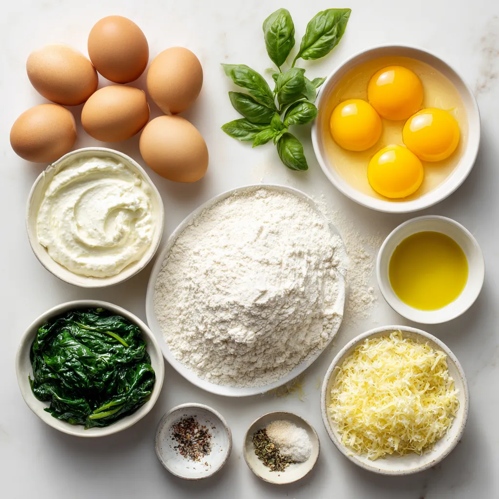 For the ravioli, I focus on fresh ingredients to enhance flavor. Spinach and ricotta cheese create a creamy filling. The eggs bind the dough and add richness. I choose all-purpose flour for a nice texture. Parmesan cheese adds a savory touch. Garlic powder and nutmeg give the filling a warm, aromatic flavor. I always add salt and pepper to bring everything together.