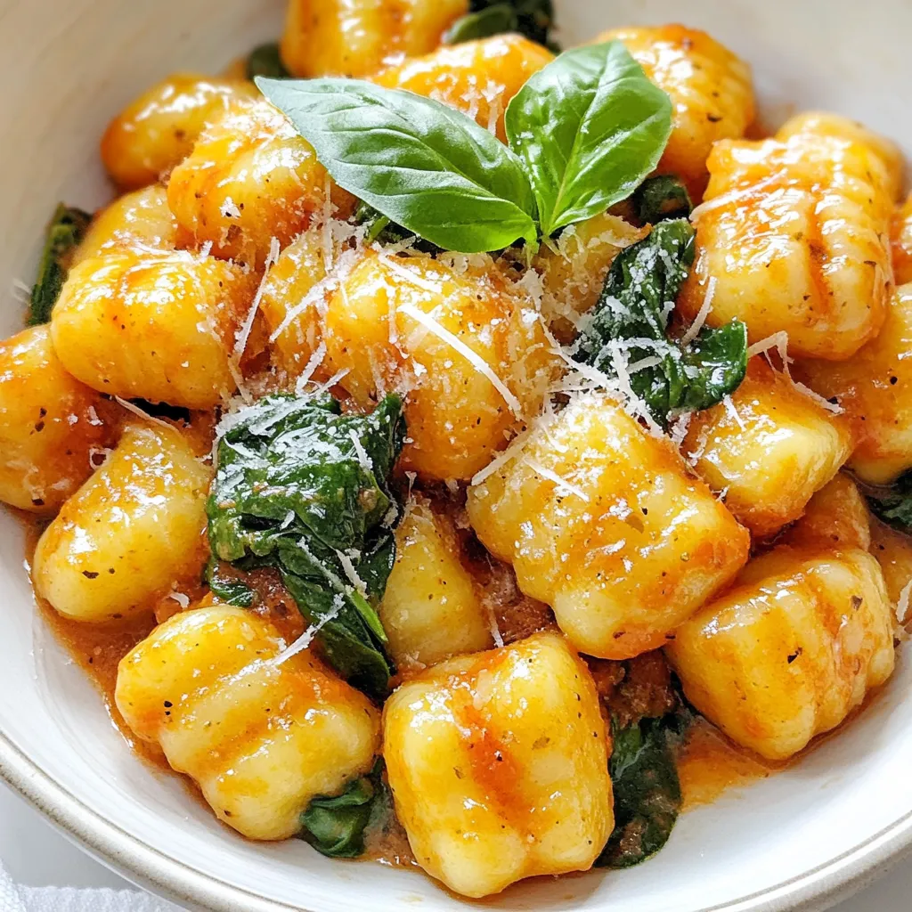 - 1 package (16 oz) potato gnocchi - 2 tablespoons olive oil - 3 cloves garlic, minced Potato gnocchi serves as the base of this dish. They are soft and pillowy, making every bite delightful. Olive oil adds richness and flavor. Garlic gives the dish a lovely aroma and taste. - 1 can (14 oz) crushed tomatoes - 1 cup heavy cream - 2 cups fresh spinach, chopped - 1 teaspoon Italian seasoning - Salt and pepper to taste - 1/2 cup grated Parmesan cheese - Fresh basil leaves for garnish Crushed tomatoes form the heart of our sauce, providing a rich, tangy base. Heavy cream adds smoothness and a creamy texture. Fresh spinach brings color and nutrients. Italian seasoning gives depth to the flavor. Salt and pepper enhance every taste. Parmesan cheese offers a salty finish, while fresh basil adds a bright touch. Each ingredient plays a key role in making creamy tomato spinach gnocchi a comfort meal. You can feel the love in every bite. {{ingredient_image_1}} Start by bringing a large pot of salted water to a boil. The salt helps add flavor to the gnocchi. Once the water is boiling, add the potato gnocchi. Cook them for about 2-3 minutes or until they float to the top. Floating means they are done! Carefully drain the gnocchi and set them aside. In a large skillet, heat the olive oil over medium heat. Add the minced garlic and sauté for 1-2 minutes. Keep an eye on it; you want it fragrant, not browned. Next, stir in the crushed tomatoes and Italian seasoning. Let it simmer for about 5 minutes. This step helps the flavors mix well. Reduce the heat to low and pour in the heavy cream. Stir until it blends nicely. Allow the sauce to simmer for another 2-3 minutes. It will get a bit thicker. Now, it’s time to add the chopped spinach to the skillet. Cook it for 2-3 minutes until the spinach wilts down. Gently fold the cooked gnocchi into the creamy tomato sauce. Make sure the gnocchi gets coated evenly. Taste and add salt and pepper if needed. Finally, sprinkle the grated Parmesan cheese over the top and stir to combine. Let everything warm through for a minute or two. Serve it hot and garnish with fresh basil leaves. Enjoy your creamy tomato spinach gnocchi! To ensure perfect gnocchi texture, follow these steps: - Cook gnocchi briefly: Boil gnocchi in salted water for just 2-3 minutes. They are done when they float to the top. Overcooking can make them mushy. - Drain well: After cooking, drain the gnocchi and let them sit for a minute. This helps keep them firm. To avoid overcooking spinach, keep these tips in mind: - Add spinach last: Stir in fresh spinach when the sauce is nearly done. This keeps its bright color and nutrients. - Cook briefly: Let the spinach wilt for just 2-3 minutes. This keeps it tender but not soggy. For garnishing options, consider these ideas: - Fresh basil: Add a few leaves on top for a burst of flavor and color. - Extra cheese: Sprinkle more grated Parmesan cheese before serving for a cheesy finish. When it comes to pairing with sides, think about these options: - Salads: A light green salad complements the richness of the gnocchi. - Garlic bread: Serve warm garlic bread on the side for a cozy meal. Feel free to mix and match these tips to make your creamy tomato spinach gnocchi even more delightful! Pro Tips Use Fresh Ingredients: Fresh spinach and high-quality canned tomatoes can elevate the dish's flavor significantly. Customize the Creaminess: For a lighter version, substitute half of the heavy cream with vegetable broth or use Greek yogurt for a tangy twist. Gnocchi Tips: Sauté the cooked gnocchi in the sauce for an additional minute to give them a slight crisp and enhance flavor absorption. Serving Suggestions: Pair with a side salad or garlic bread for a complete meal that balances the creamy texture with fresh flavors. {{image_2}} You can easily change a few ingredients in this recipe. For heavy cream, try using sour cream, yogurt, or coconut milk. These swaps add a nice twist and can fit your needs. Each option gives a different flavor and texture to the sauce. When it comes to cheese, feel free to mix it up. Instead of Parmesan, you might use mozzarella or goat cheese. These cheeses melt nicely and can add a unique taste. You can even try a mix of your favorites for more depth. Want to boost the meal? Adding protein can make it heartier. You can toss in cooked chicken or shrimp to the creamy sauce. Both options cook quickly and soak up the flavors well. This makes the dish more filling and adds extra nutrients. You can also add more vegetables to the mix. Try mushrooms or bell peppers for a colorful twist. These veggies bring in new textures and tastes. Slice them thin and sauté them with the garlic for a lovely base. This way, you can enjoy a rainbow of flavors in every bite. To keep your creamy tomato spinach gnocchi fresh, store leftovers in an airtight container. Place the container in the fridge. Your dish stays good for about three days. If you want to save it longer, consider freezing. For freezing, let the gnocchi cool completely before transferring it to a freezer-safe bag. It can last up to three months in the freezer. Just remember to label the bag with the date to keep track. When it's time to eat your leftovers, reheating properly is key. The best way to reheat gnocchi is on the stovetop. This method helps keep the texture nice and creamy. Just add a splash of water or broth to the pan to help it heat evenly. Stir often to avoid sticking. You can also use a microwave, but this might change the texture. Place the gnocchi in a microwave-safe bowl. Cover it to keep moisture in, and heat in short bursts of about 30 seconds. Stir between each burst to ensure even heating. Choose the method that works best for you, but the stovetop is my favorite! To make gnocchi from scratch, you need few simple items. Start with 2 cups of mashed potatoes. Mix in 1 cup of all-purpose flour and 1 egg. Blend until smooth. Roll the dough into long ropes. Cut them into small 