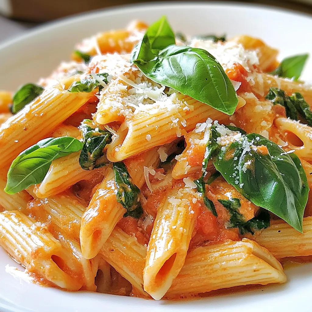 - Penne pasta: This is the main star of the dish. It holds sauce well. - Olive oil: Use this for sautéing garlic. It adds flavor and richness. - Garlic: Fresh minced garlic brings a wonderful aroma and taste. - Diced tomatoes: These provide acidity and sweetness. Canned is easy. - Heavy cream: This makes the sauce creamy and smooth. - Fresh spinach: Adds color and nutrients. It wilts down nicely. - Italian seasoning: This blend enhances the dish’s flavor profile. - Parmesan cheese: Grated cheese adds saltiness and depth. - Fresh basil: This is for garnish. It brightens the dish. - Ounces to cups: 8 ounces of penne is about 2 cups. - Fresh versus canned ingredients: Fresh tomatoes can replace canned. Use about 2 cups if fresh. - Best pasta options: Barilla and De Cecco make great penne pasta. - Quality canned tomatoes: San Marzano or Muir Glen are top picks. - Recommended Parmesan cheese brands: Look for Parmigiano-Reggiano for best flavor. {{ingredient_image_1}} First, take a large pot and fill it with water. Add a good pinch of salt. Bring the water to a boil over high heat. Once boiling, carefully add 8 ounces of penne pasta. Cook it according to the package instructions, usually around 11 to 13 minutes. You want the pasta to be al dente, which means it should be firm yet tender. To check, taste a piece a minute before the time is up. If it has a slight bite, it's ready. Drain the pasta in a colander and set it aside. Next, grab the same pot and heat 1 tablespoon of olive oil over medium heat. Add 3 cloves of minced garlic. Sauté the garlic for about 1 minute. You want to watch it closely. You need the garlic to be fragrant but not brown. If it burns, it will taste bitter. Now it's time to create the sauce. Add the drained diced tomatoes and 1 cup of heavy cream to the pot. Stir in 1 teaspoon of Italian seasoning. Bring this mixture to a gentle simmer. Let it cook for about 3 to 4 minutes. Stir it often to help the sauce thicken. Consistent stirring keeps the sauce smooth and prevents it from sticking to the pot. Once it thickens, add in 2 cups of fresh spinach. Cook for another 2 to 3 minutes until the spinach wilts. To adjust creaminess levels, you can change the amount of heavy cream. If you want it richer, add more cream. For a lighter sauce, use less. Fresh herbs can add great flavor. Try adding chopped basil or parsley right before serving. This gives your dish a fresh taste that brightens every bite. To avoid watery pasta, make sure to drain it well. After cooking, do not rinse the penne. This keeps the starch, helping the sauce stick better. When cooking spinach, add it last to the sauce. This way, it wilts but stays vibrant and fresh. Overcooking can make it lose its nice color and taste. For great pairings, serve this dish with a side salad or crusty bread. A simple green salad works well to balance the flavors. For plating, use a large bowl or plate. Add the penne and garnish with fresh basil. A sprinkle of Parmesan on top also adds a nice touch. This makes the dish look appetizing and fancy. Pro Tips Use Fresh Ingredients: Fresh spinach and high-quality canned tomatoes enhance the flavor and texture of the dish. Adjust Creaminess: For a lighter version, substitute half of the heavy cream with vegetable broth or milk. Perfectly Cooked Pasta: To avoid mushy pasta, make sure to cook the penne just al dente, as it will continue to cook when mixed with the sauce. Garnish Wisely: Fresh basil not only adds color but also a burst of flavor; consider adding a sprinkle of red pepper flakes for a spicy kick. {{image_2}} You can change up the pasta if you want. Try using whole grain or gluten-free penne. These swaps keep the dish tasty while adding extra nutrition. For a dairy-free option, use coconut cream or cashew cream. Both add a nice richness without the dairy. Want to make it heartier? Add cooked chicken or shrimp. These proteins pair well with the creamy sauce. You can also toss in seasonal veggies like zucchini or bell peppers. They add color and flavor to your dish. Spice up your meal with a pinch of red pepper flakes or a splash of hot sauce. This will give it a nice kick! For a twist on the cheese, try using feta or goat cheese. These options create a new taste experience, making your dish even better. To store your creamy tomato spinach penne, let it cool first. Place the leftovers in an airtight container. This helps keep the dish fresh and tasty. It can stay in the fridge for up to 3 days. When you're ready to eat, just reheat it on the stove or in the microwave. If you want to save some for later, you can freeze it! Use a freezer-safe container to store the dish. Make sure to leave some space for the sauce to expand. It can last for about 2 months in the freezer. When you want to enjoy it again, thaw it overnight in the fridge. Reheat gently on the stove or in the microwave until hot. Leftovers can be fun! You can turn them into a pasta bake. Just layer the penne with some extra cheese and bake until bubbly. You can also mix it with scrambled eggs for a tasty breakfast. When reheating, add a splash of cream or tomato juice. This keeps the flavors bright and fresh. Yes, you can use whole grain pasta. Whole grain pasta has more fiber than regular pasta. This means it can help you feel full longer. It also adds a nutty flavor to your dish. Whole grain pasta takes a bit longer to cook, so check the package for timing. If you want a lighter option, try using half-and-half or milk. You can also use coconut cream for a dairy-free choice. Silken tofu blended with a little water can make a nice creamy texture, too. All these options can reduce calories while keeping the sauce rich. To make this recipe vegetarian, simply ensure all your ingredients are plant-based. Use vegetable broth instead of chicken broth, if needed. Check that your Parmesan cheese is made without animal rennet. You can add extra veggies like mushrooms or bell peppers for more flavor. You now have a clear