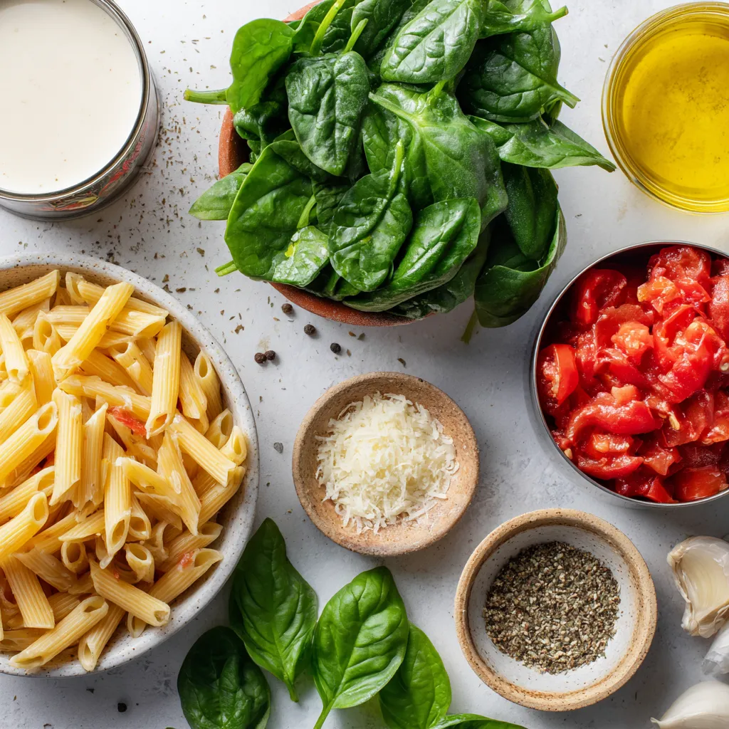 A delicious and creamy pasta dish featuring penne, tomatoes, and fresh spinach.
