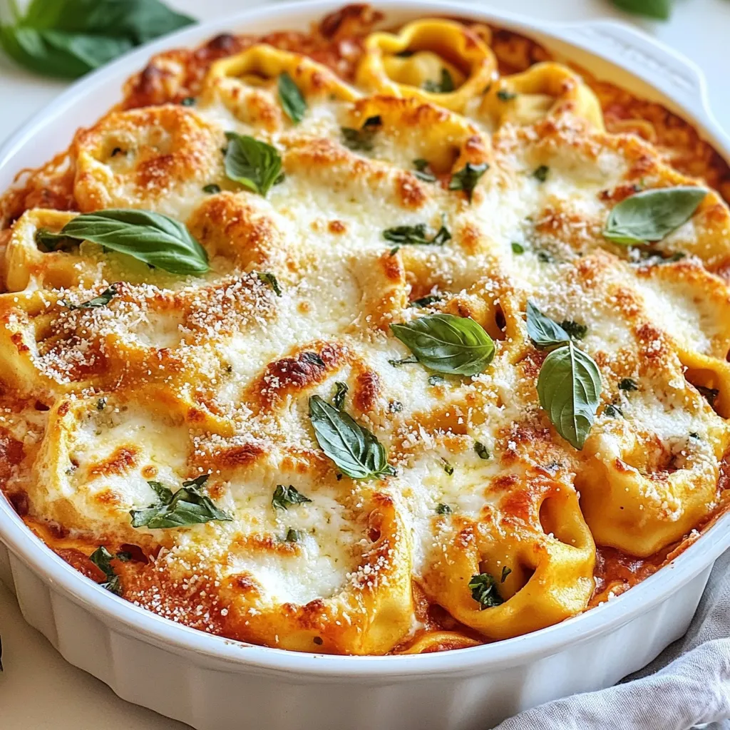 A delicious and creamy baked dish featuring cheese tortellini in a rich tomato sauce, topped with melted mozzarella and Parmesan cheese.