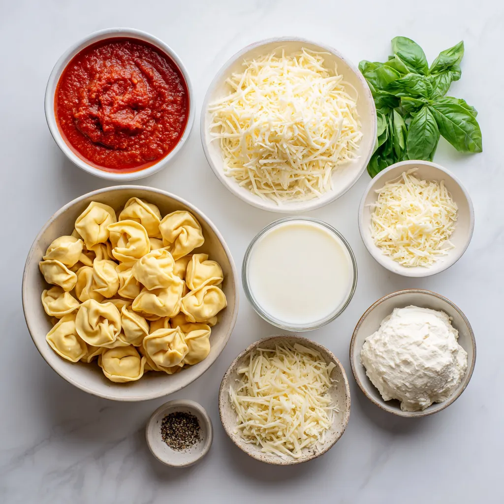 Each ingredient plays a key role. The tortellini adds texture and heartiness. Marinara sauce gives that classic tomato flavor. Heavy cream creates a rich and smooth base. Mozzarella and Parmesan add creaminess and a cheesy crust. Italian seasoning and garlic powder bring depth and warmth. The fresh basil adds a pop of color and freshness at the end.