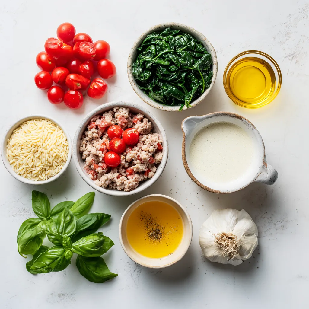 Gather these simple ingredients to make your Creamy Tuscan Orzo with Sausage: