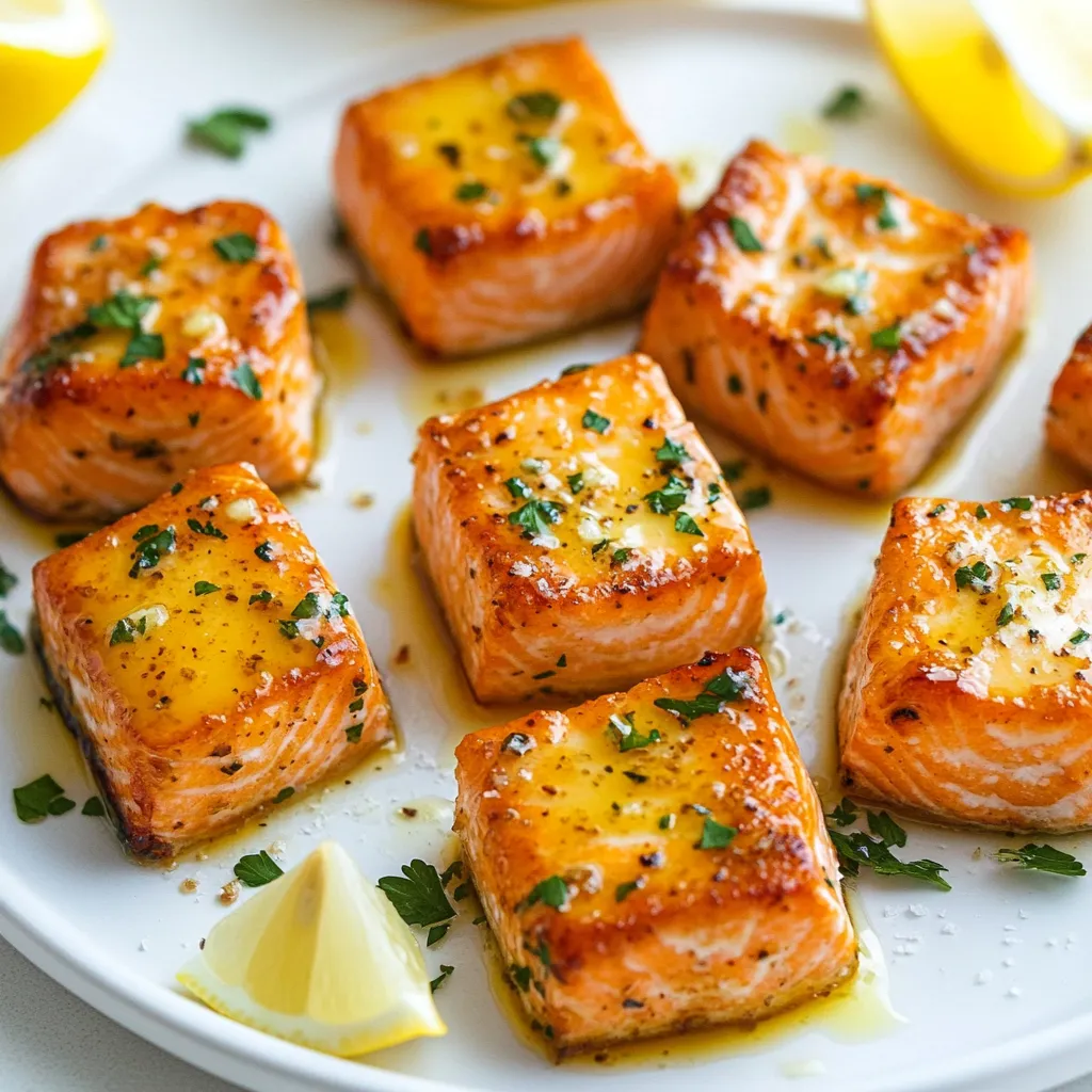 Delicious bite-sized salmon cubes sautéed in garlic butter, perfect as an appetizer or main dish.