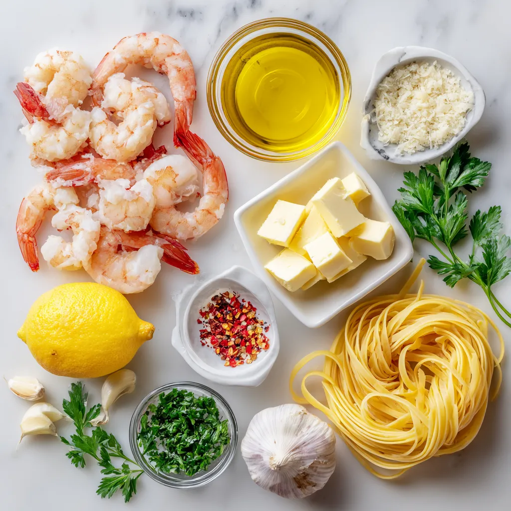 Gather these fresh ingredients for a tasty meal. Start with large shrimp. They add a sweet flavor and nice texture. Use linguine or spaghetti for the perfect pasta base. Unsalted butter gives a rich taste. Olive oil adds depth.