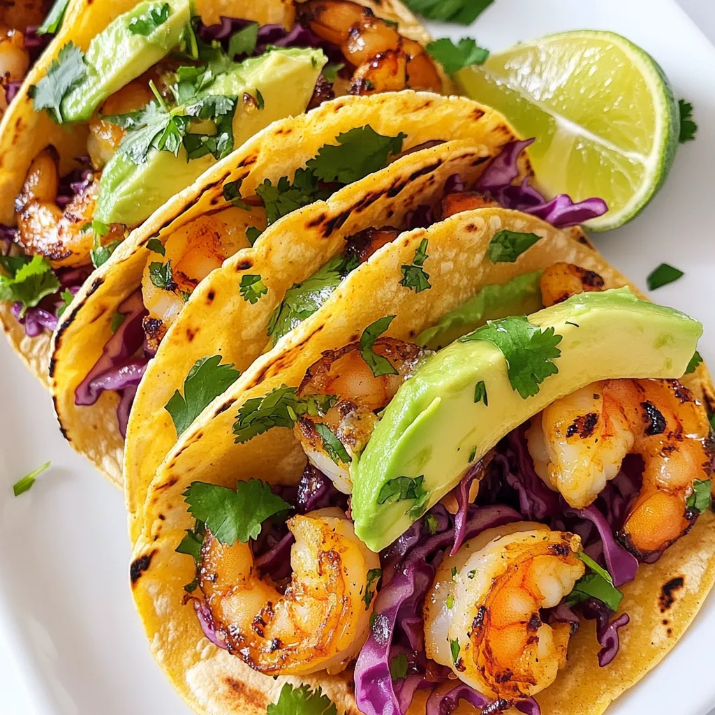 Delicious tacos filled with garlic butter shrimp, fresh cabbage, and avocado.