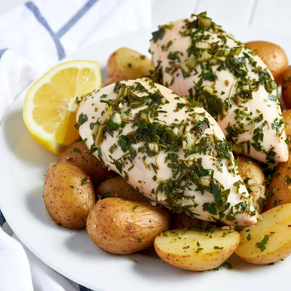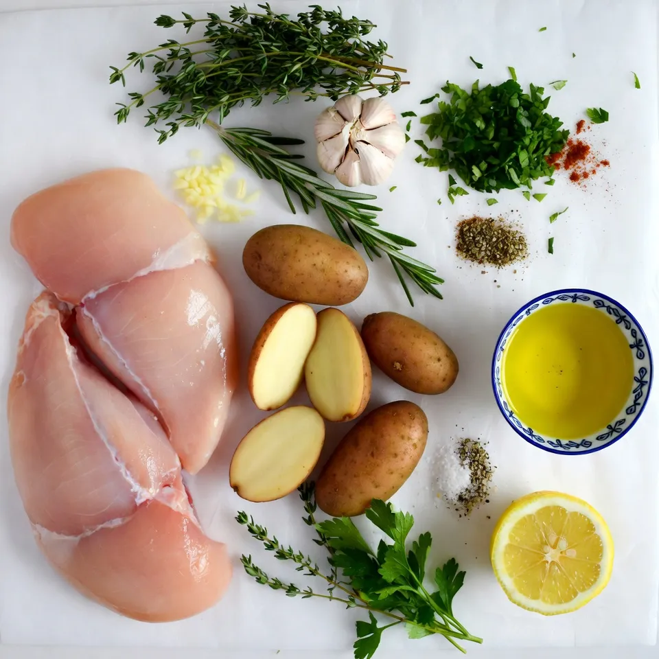 A flavorful dish featuring marinated chicken breasts and roasted baby potatoes, infused with garlic and fresh herbs.