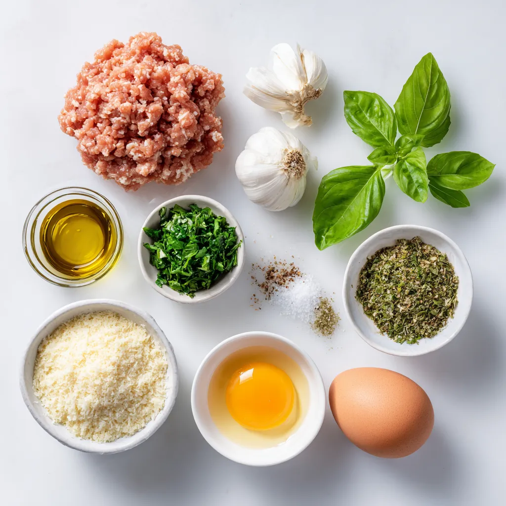 • In a large mixing bowl, combine the ground chicken, minced garlic, chopped parsley, chopped basil, grated Parmesan cheese, breadcrumbs, egg, onion powder, oregano, salt, and pepper. Mix until all ingredients are evenly incorporated.