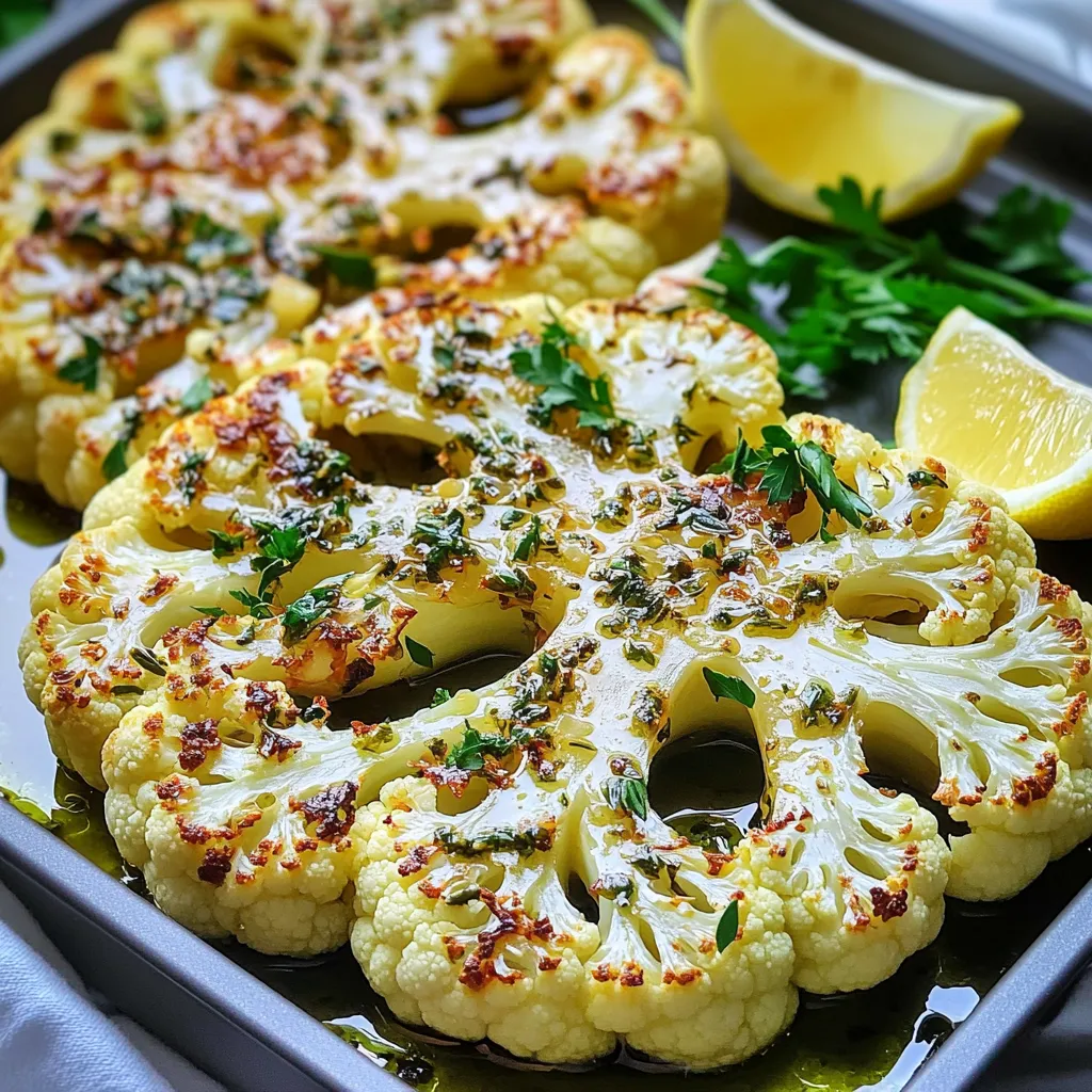 Once done, remove the steaks from the oven. Sprinkle fresh parsley on top for a burst of color and flavor. Serve warm with lemon wedges for a zesty kick. Enjoy your delicious garlic herb roasted cauliflower steaks!
