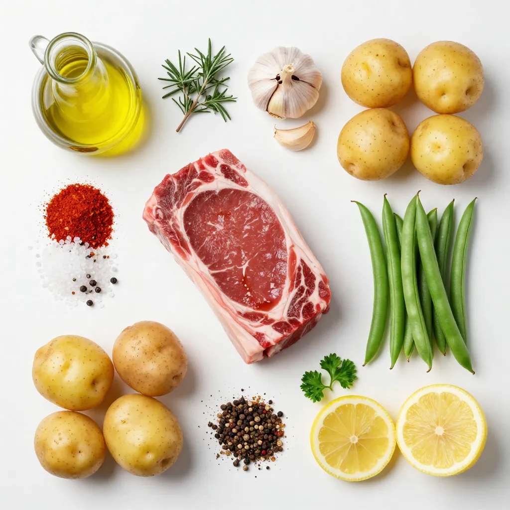 - 1 ½ pounds flank steak - 2 tablespoons olive oil - 4 cloves garlic, minced - 1 pound baby potatoes, halved - 1 pound green beans, trimmed - 2 teaspoons dried rosemary - 2 teaspoons dried thyme - 1 teaspoon smoked paprika - Salt and pepper to taste - 1 lemon, sliced - Fresh parsley for garnish Gather these simple ingredients before you start. The flank steak gives a rich flavor. Olive oil adds moisture and helps the herbs stick. Minced garlic brings a strong taste. Baby potatoes are tender and comforting. Green beans add a nice crunch. For the marinade, dried rosemary and thyme bring depth. Smoked paprika adds a warm, smoky touch. Salt and pepper enhance all the flavors. Fresh lemon slices brighten the dish. Finally, fresh parsley adds color and freshness when you serve. Make sure your ingredients are fresh. Quality matters in every bite. You can find these items at your local store. If you want, use fresh herbs instead of dried ones. This can add even more flavor. Enjoy your cooking! {{ingredient_image_1}} To start, grab a small bowl. Add 2 tablespoons of olive oil. Then, mince 4 cloves of garlic and toss them in. Next, add 2 teaspoons of dried rosemary and 2 teaspoons of dried thyme. Sprinkle in 1 teaspoon of smoked paprika, plus salt and pepper to taste. Mix this well to create a tasty marinade. Now, take your 1 ½ pounds of flank steak. Place it in a large zip-top bag or dish. Pour half of your marinade over the steak. Seal the bag or cover the dish tightly. Let it marinate in the fridge for at least 30 minutes. This step adds great flavor to your steak. While the steak marinates, prepare 1 pound of baby potatoes. Cut them in half and place them on a large baking sheet. Drizzle the remaining marinade over the potatoes. Toss them well to coat every piece. This step makes the potatoes full of flavor. Roast the potatoes in your preheated oven at 400°F (200°C) for about 15 minutes. This gets them nice and tender. After 15 minutes, take the baking sheet out. Now, add 1 pound of trimmed green beans and slices of 1 lemon around the potatoes. This adds freshness and color to your meal. Remove the steak from the marinade. Place it on the baking sheet, right on top of the veggies. This helps the steak soak up some of those great flavors. Return the sheet to the oven. Roast for 15 to 20 minutes. Aim for a temperature of 135°F for medium-rare. Adjust the time if you like it more cooked. Once done, take the baking sheet out. Let the steak rest for 5 minutes before slicing it thinly against the grain. This keeps the meat tender. Serve the steak with the roasted potatoes and green beans. Garnish with fresh parsley for a pop of color and flavor. Enjoy your meal! For this dish, marinate the steak for at least 30 minutes. If you can, let it sit for up to 2 hours. This time helps the flavors soak in well. To enhance flavor, try adding a splash of lemon juice or a dash of soy sauce. Both give a nice twist to the taste. To check steak doneness, use a meat thermometer. Aim for 135°F for medium-rare. For medium, cook until it reaches 145°F. After cooking, always let the steak rest for 5 minutes. This helps keep the juices locked in, making it juicier when you slice it. Pair your steak with roasted potatoes and green beans. They complement the rich flavor of the steak. You can also add a tangy sauce like chimichurri or a drizzle of balsamic glaze. For a nice touch, garnish with fresh parsley and lemon slices on the plate. This makes your meal look vibrant and inviting. Pro Tips Marinate Longer: For a more flavorful steak, consider marinating for 2 hours or even overnight if time allows. Vegetable Variations: Feel free to swap in your favorite seasonal vegetables, like bell peppers or carrots, for a different flavor profile. Resting Time: Always allow your steak to rest after cooking to ensure the juices redistribute, making for a more tender bite. Use a Meat Thermometer: To achieve your preferred doneness, use a meat thermometer; aim for 135°F for medium-rare, 145°F for medium. {{image_2}} You can switch flank steak for chicken or pork. Chicken thighs work well. They stay juicy and soak up flavors nicely. Pork tenderloin is also a great choice. Just thinly slice it to ensure even cooking. For a vegetarian meal, try marinated tofu or tempeh. Both absorb marinades and add protein. Use seasonal vegetables to keep your dish fresh. In spring, add asparagus or zucchini. Summer brings bell peppers or cherry tomatoes. In fall, root veggies like carrots or sweet potatoes shine. For winter, try Brussels sprouts or butternut squash. When roasting root vegetables, cut them into similar sizes for even cooking. Toss them in olive oil and seasoning before roasting. You can change up the spices and herbs in the recipe. Try adding cumin or chili powder for heat. Fresh herbs like basil or cilantro can brighten the dish. Experiment with marinades too. A soy sauce and ginger mix gives an Asian twist. For a smoky flavor, add chipotle peppers in adobo. Mix and match to find your favorite flavor! To keep your Garlic Herb Steak fresh, store leftovers in the fridge. Use airtight containers to prevent moisture loss and keep flavors intact. Make sure the steak and veggies are cool before sealing. This helps them stay fresh for up to three days. To reheat without losing flavor, use the oven. Preheat it to 350°F (175°C). Place the steak and veggies on a baking sheet. Heat for about 10-15 minutes or until warm. If you use a microwave, set it on low power. Heat for short bursts to avoid tough steak. Yes, you can freeze Garlic Herb Steak. Wrap it in plastic wrap or foil, then place it in a freezer bag. This keeps it safe for up to three months. When you’re ready to eat, thaw overnight in the fridge. Reheat in the oven for best results. You should marinate flank steak for at least 30 minutes. This allows the flavors to soak in. For best results, marinate it for 2 to 4 hours. If you have time, marinating overnight will enhance 