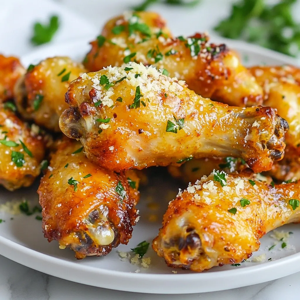 To make Garlic Parmesan Air Fryer Wings, you need fresh and simple ingredients. Each one adds flavor and makes the dish special. Here’s what you’ll need: - 2 pounds chicken wings - 1 tablespoon olive oil - 1 teaspoon garlic powder - 1 teaspoon onion powder - 1 teaspoon smoked paprika - ½ teaspoon salt - ½ teaspoon black pepper - ½ cup grated Parmesan cheese - 2 tablespoons fresh parsley, chopped - Zest of 1 lemon - 1 tablespoon lemon juice These ingredients come together to create a tasty wing dish. The chicken wings are the star, while the seasoning and sauce bring out their best. Using olive oil helps the spices stick and crisp the wings. Garlic powder and onion powder add a savory punch. Smoked paprika gives a subtle smokiness, while salt and black pepper balance the flavors. The Garlic Parmesan sauce is where the magic happens. Grated Parmesan makes it rich. Fresh parsley adds color and freshness. Lemon zest and juice brighten the sauce, making it zesty. Together, these ingredients create a flavorful delight that will have everyone asking for more. {{ingredient_image_1}} 1. Drying the chicken wings: First, use paper towels to pat the chicken wings dry. This step helps them get crispy when cooked. 2. Creating the seasoning mix: In a large bowl, mix the olive oil, garlic powder, onion powder, smoked paprika, salt, and black pepper. Stir until the spices blend well. 3. Tossing the wings in the seasoning: Add the dried wings to the bowl. Toss them in the seasoning mix until every wing is evenly coated. This ensures every bite is flavorful. 1. Preheating the air fryer: Set your air fryer to 400°F (200°C). Preheat it for about 5 minutes. This step helps the wings cook evenly. 2. Air frying the wings: Arrange the seasoned wings in a single layer in the air fryer basket. Cook them for 25 to 30 minutes. Shake the basket halfway through so they cook evenly. 1. Making the garlic parmesan sauce: In a small bowl, mix the grated Parmesan cheese, chopped parsley, lemon zest, and lemon juice. This sauce adds a fresh and zesty flavor. 2. Coating the wings after cooking: Once the wings are golden and crispy, remove them from the air fryer. Immediately toss them in the garlic parmesan sauce until they are fully coated. 3. Serving suggestions: Plate the wings and add some extra parsley and Parmesan cheese on top. This makes them look even more appealing. Enjoy your delicious garlic parmesan wings! To make your wings extra crispy, you need to dry them well. Use paper towels to pat each wing. This step helps remove moisture. Less moisture means better crispiness. Next, you can try a simple trick: let the wings air dry for 30 minutes. This enhances the crispiness even more. When cooking, avoid overcrowding the air fryer. Place wings in a single layer. This allows hot air to circulate. Shake the basket halfway through cooking. This ensures even crisping on all sides. To spice up your wings, think about adding cayenne pepper or smoked paprika. These give a nice kick. You can also use chili powder for a different flavor. For your garlic parmesan sauce, adjust to your taste. Want more garlic? Add a bit more garlic powder or fresh minced garlic. If you like a tangy touch, squeeze in more lemon juice. It brightens the flavor and balances the richness. Feel free to experiment with herbs too. Try adding thyme or oregano for a fresh twist. You can create your own unique version of garlic parmesan wings! Pro Tips Dry Wings for Crispiness: Make sure to pat the wings dry thoroughly before seasoning. This helps achieve that perfect crispy texture when air frying. Shake for Even Cooking: Don’t forget to shake the air fryer basket halfway through cooking. This ensures that all wings get evenly crispy and browned. Fresh Ingredients Matter: Use fresh parsley and freshly grated Parmesan cheese for the best flavor in your Garlic Parmesan sauce. It makes a noticeable difference! Experiment with Spices: Feel free to adjust the seasoning mix according to your taste. Adding a pinch of cayenne pepper can give your wings an extra kick! {{image_2}} To mix things up, try spicy garlic parmesan wings. Add a kick by including cayenne pepper or hot sauce in the seasoning mix. This boosts heat and flavor, perfect for spice lovers. You can also make honey garlic wings. Just add honey to your garlic parmesan sauce. This sweet touch pairs well with the savory cheese and garlic. If you don't have an air fryer, you can bake the wings in the oven. Preheat your oven to 425°F (220°C). Place the seasoned wings on a baking sheet. Bake them for about 40-45 minutes, flipping halfway. This method still gives you crispy wings. Grilling is another tasty option. Preheat your grill to medium-high heat. Place the wings on the grill and cook for about 20-25 minutes. Turn them often to avoid burning. This adds a smoky flavor, making them even more delicious. To keep your garlic parmesan air fryer wings fresh, use proper storage methods. First, let the wings cool to room temperature. This step prevents condensation and sogginess. Next, place the wings in an airtight container. You can use glass or plastic containers with tight lids. These containers will keep the wings safe from air and moisture. If you want to keep them longer, wrap the wings in foil or plastic wrap before putting them in a container. This will add extra protection. When it's time to enjoy your wings again, reheating is key. I recommend using the air fryer for the best results. Set it to 350°F (175°C) and place the wings in the basket. Heat them for about 5-7 minutes. This method keeps them crispy. You can also use an oven. Preheat it to 375°F (190°C) and lay the wings on a baking sheet. Bake for about 10-12 minutes. If you want to avoid dryness, cover them with foil for the first half of reheating. Enjoy your wings just as tasty as the first time! You should air fry chicken wings for 25 to 30 minutes. Set your air fryer to 400°F (200°C). Make sure to shake the basket hal