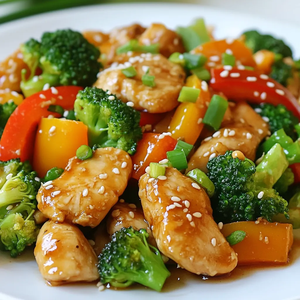 A quick and flavorful stir fry featuring marinated chicken, fresh vegetables, and a savory sauce.