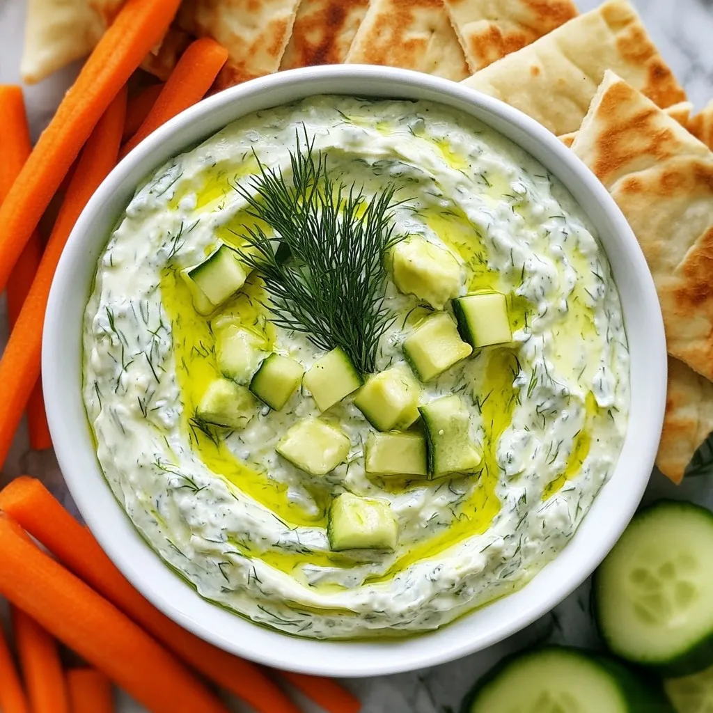 To make Greek Avocado Tzatziki Dip, you will need these main ingredients: - 1 ripe avocado - 1 cup Greek yogurt - 1 small cucumber, grated and water squeezed out - 2 tablespoons fresh dill, chopped - 1 clove garlic, minced - 2 tablespoons lemon juice - Salt and pepper to taste - Olive oil for drizzling - Pita bread or vegetable sticks for serving The ripe avocado gives the dip a creamy texture. Greek yogurt adds tang and protein. The cucumber brightens the flavor and adds crunch. Fresh dill brings a unique aroma, while garlic adds depth. Lemon juice adds a fresh zing, and seasoning brings all the flavors together. You can make your dip even more special with these garnishes: - A sprig of fresh dill - A drizzle of olive oil - Extra lemon zest These garnishes not only add visual appeal but also enhance the flavor. Each ingredient offers unique health benefits: - Avocado: Rich in healthy fats, vitamins, and fiber. It supports heart health. - Greek Yogurt: High in protein and probiotics. It aids digestion and gut health. - Cucumber: Low in calories and hydrating. It helps keep you refreshed. - Dill: Contains antioxidants and may help with digestion. - Garlic: Known for its anti-inflammatory and immune-boosting properties. - Lemon Juice: High in vitamin C. It boosts the immune system and adds flavor. This dip is not just tasty, but also a healthy choice for your snacks or meals. {{ingredient_image_1}} To make Greek Avocado Tzatziki Dip, follow these simple steps: 1. Mash the Avocado: Take a ripe avocado. Cut it in half and remove the pit. Use a fork to mash it in a mixing bowl. Aim for a smooth texture but keep it a bit chunky. This gives the dip a nice feel. 2. Add Greek Yogurt: Next, add 1 cup of Greek yogurt to the mashed avocado. Mix these two together well. The yogurt adds creaminess and a tangy flavor. 3. Incorporate Cucumber: Grate 1 small cucumber. Squeeze out any excess water. This step prevents the dip from becoming too watery. Add the cucumber to the bowl. 4. Mix in Herbs and Garlic: Chop 2 tablespoons of fresh dill and mince 1 clove of garlic. Stir these into the mixture. Dill brings freshness, and garlic adds depth. 5. Season and Combine: Pour in 2 tablespoons of lemon juice. Then, sprinkle salt and pepper to taste. Mix everything together until well combined. Taste and adjust seasoning if needed. 6. Chill the Dip: Place the dip in the fridge for at least 30 minutes. Chilling enhances the flavors. It makes the dip cooler and more refreshing. - Choose the Right Avocado: Make sure your avocado is ripe. A firm avocado will not mash well. It should yield slightly when you press it. - Use a Fork: A fork works best for mashing. It allows you to control the texture easily. Chilling the dip is key. It helps the flavors blend together. A chilled dip tastes fresher and more vibrant. Plus, it feels great on a hot day! Serve it cold with pita bread or veggie sticks. Enjoy! To make the best Greek avocado tzatziki dip, you need to combine the ingredients well. Start by mashing the avocado until it’s smooth but still a bit chunky. This gives the dip a nice texture. Then, gently fold in the Greek yogurt. Use a spatula or a spoon for this; it works better than a whisk. Next, add the grated cucumber. Make sure you squeeze out the excess water. This prevents the dip from getting too watery. Then, mix in the garlic, dill, and lemon juice. These flavors blend well together. Adjust salt and pepper to your taste. If you want more zing, add a bit more lemon juice. For a fun presentation, serve your dip in a shallow bowl. Drizzle some olive oil on top. A sprig of fresh dill makes it look pretty. Arrange pita bread triangles or veggie sticks around the bowl. This not only looks nice but also makes it easy to dip. You want your guests to enjoy both the taste and the look of the dish. Pro Tips Choose Ripe Avocado: Ensure your avocado is perfectly ripe for a creamy texture. A ripe avocado should yield slightly to gentle pressure. Fresh Ingredients Matter: Using fresh dill and lemon juice enhances the flavor of your tzatziki. Avoid dried herbs for the best taste. Chill for Flavor: Letting the dip chill in the refrigerator allows the flavors to meld beautifully. Aim for at least 30 minutes before serving. Perfect Pairings: Serve with warm pita bread or crunchy vegetable sticks for a delightful contrast in texture. {{image_2}} If you want a dairy-free option, you can use coconut yogurt. It gives a creamy texture. You can also try silken tofu blended until smooth. This adds a nice base without dairy. For a twist, add bell peppers or carrots. Grated zucchini can also add freshness. You can mix in some chopped tomatoes for a colorful dip. These extra veggies boost flavor and nutrition. If you love heat, add diced jalapeños or a pinch of cayenne pepper. For more herbs, try mint or parsley. These spices and herbs enhance the taste and make the dip more exciting. To keep your Greek avocado tzatziki dip fresh, follow these tips: - Best Practices for Storing Leftovers: Store the dip in an airtight container. This helps keep it fresh and prevents it from drying out. You can also place a piece of plastic wrap directly on the dip before sealing the lid. - How Long the Dip Lasts: The dip can last in the fridge for about 3 to 5 days. If you notice any browning of the avocado, just stir it gently to mix. The lemon juice helps slow down browning, so it stays fresh longer! - Freezing Options: You can freeze the dip, but it may change texture. To freeze, place it in a freezer-safe container. Leave some space at the top for expansion. It can last up to 3 months in the freezer. When ready to use, thaw it in the fridge overnight. Stir well before serving. By following these steps, you can enjoy this tasty dip at your convenience! Yes, you can make this dip in advance. It tastes even better after chilling. I recommend preparing it a few hours ahead of serving. This allows the flavors to blend nicely. You have many great options 
