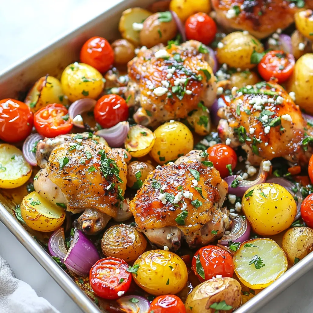 - 4 chicken thighs, bone-in and skin-on - 2 cups baby potatoes, halved - 1 red bell pepper, sliced - 1 yellow bell pepper, sliced - 1 red onion, cut into wedges - 1 cup cherry tomatoes, halved The main ingredients for this Greek chicken sheet pan dinner create a hearty meal. Chicken thighs provide rich flavor and moisture. Baby potatoes add a satisfying texture. Bell peppers and red onions bring color and sweetness. Cherry tomatoes add a burst of freshness in every bite. - 4 cloves garlic, minced - 1 teaspoon dried oregano - 1 teaspoon dried thyme - 1 teaspoon smoked paprika - 2 tablespoons olive oil Spices and seasonings are key to the dish's flavor. Garlic gives a strong, fragrant base. Oregano and thyme add depth and warmth. Smoked paprika introduces a subtle smokiness. Olive oil is essential for marinating and roasting, enhancing all the flavors. - Juice of 1 lemon - Salt and pepper to taste - Fresh parsley, chopped for garnish - Feta cheese, crumbled for serving (optional) For added zing, lemon juice brightens the dish. Salt and pepper balance the flavors, making everything pop. Fresh parsley adds a nice touch and color. Feta cheese is optional but brings a creamy, salty finish that makes the meal special. {{ingredient_image_1}} - Preheat the oven: Set your oven to 425°F (220°C). This gives a nice heat for roasting. - Marinate the chicken: In a large bowl, mix chicken thighs with olive oil, lemon juice, minced garlic, dried oregano, thyme, smoked paprika, salt, and pepper. Coat the chicken well. - Toss the vegetables: Add halved baby potatoes, sliced bell peppers, and onion wedges into the bowl. Stir until all veggies are covered in oil and spices. - Arrange on the baking sheet: Spread the marinated chicken and veggies evenly on a large baking sheet. Scatter cherry tomatoes on top for extra flavor. - Bake the dish: Place the baking sheet in the oven. Bake for 35-40 minutes. The chicken should reach an internal temperature of 165°F (75°C), and the veggies will be tender. - Check for doneness: Use a meat thermometer to check the chicken. The juices should run clear, not pink. - Resting the dish: After baking, let the dish sit for a few minutes. This helps the juices settle in the chicken. - Garnishing options: Consider adding crumbled feta cheese and chopped parsley on top. This gives a fresh touch. - Serving suggestions: You can serve directly from the sheet pan for a rustic look. Or, plate the chicken and veggies on a large dish. Sprinkle with more parsley and feta for a nice finish. - To ensure even cooking, arrange the chicken and veggies in a single layer. This helps them roast well. - You can marinate the chicken overnight for deeper flavor. If short on time, let it sit for at least 30 minutes. - Adjust spices to taste. If you like heat, add a pinch of cayenne pepper. For more herb flavor, increase the oregano and thyme. - Serve directly from the sheet pan for a fun, rustic style. It adds charm to your meal. - Pair the dish with warm pita bread or a side salad. Greek salad is a great choice. - Ideal accompaniments include tzatziki sauce or a squeeze of fresh lemon. These add a refreshing touch. - Store leftovers in an airtight container in the fridge. They last about 3-4 days. - Reheat in the oven at 350°F (175°C) until warm. This keeps the chicken crispy. - For longer storage, freeze the dish in a freezer-safe container. It stays good for up to 3 months. Pro Tips Marinating Time: For deeper flavor, let the chicken marinate for at least 30 minutes or even overnight in the refrigerator. Vegetable Variations: Feel free to mix in other seasonal vegetables like zucchini or asparagus for added variety and nutrition. Resting Period: Allow the chicken to rest for a few minutes after baking. This helps the juices redistribute for a more tender bite. Feta Serving: Crumbling the feta cheese just before serving keeps it fresh and enhances its flavor profile; consider using a mix of different feta types for added complexity. {{image_2}} You can easily change the chicken. Use chicken breasts or drumsticks if you prefer. They cook well and taste great. Swap in seasonal veggies, too. Try zucchini, asparagus, or carrots for a fresh twist. You can also use different spices. For a kick, add cumin or coriander. This keeps the dish exciting and new. If you need gluten-free options, this recipe is perfect! All the ingredients are naturally gluten-free. For low-carb alternatives, replace potatoes with cauliflower. This keeps the meal light and healthy. Want a vegetarian version? Use chickpeas or tofu instead of chicken. Add more veggies for a hearty meal that everyone will enjoy. Explore Mediterranean twists by adding olives or artichokes. This brings a rich flavor to the dish. You can also draw from other cultures. Use soy sauce and ginger for an Asian flair. For a Latin touch, sprinkle cumin and lime juice. Flavor enhancers like fresh herbs or a squeeze of citrus can elevate your meal. Don't be afraid to experiment! How long can I store leftovers? You can store leftovers for up to three days. Keep them in an airtight container in the fridge. Reheat them in the oven or microwave when ready to eat. Can I use boneless chicken thighs? Yes, boneless chicken thighs work well. They will cook faster, so check them around 25-30 minutes. What to serve with Greek chicken sheet pan dinner? You can serve it with rice or a fresh salad. Pita bread also makes a nice side. What if I don't have smoked paprika? If you don’t have smoked paprika, use regular paprika. You can also add a pinch of cayenne for some heat. How do I know when the chicken is done? The chicken is done when it reaches 165°F (75°C). Use a meat thermometer in the thickest part. Can I prepare this dish in advance? Yes, you can marinate the chicken and veggies a day ahead. Keep them in the fridge until ready to cook. How can I make this dish spicier? Add more smoked paprika or some red pepper flakes. You can also use hot sauce for extra he