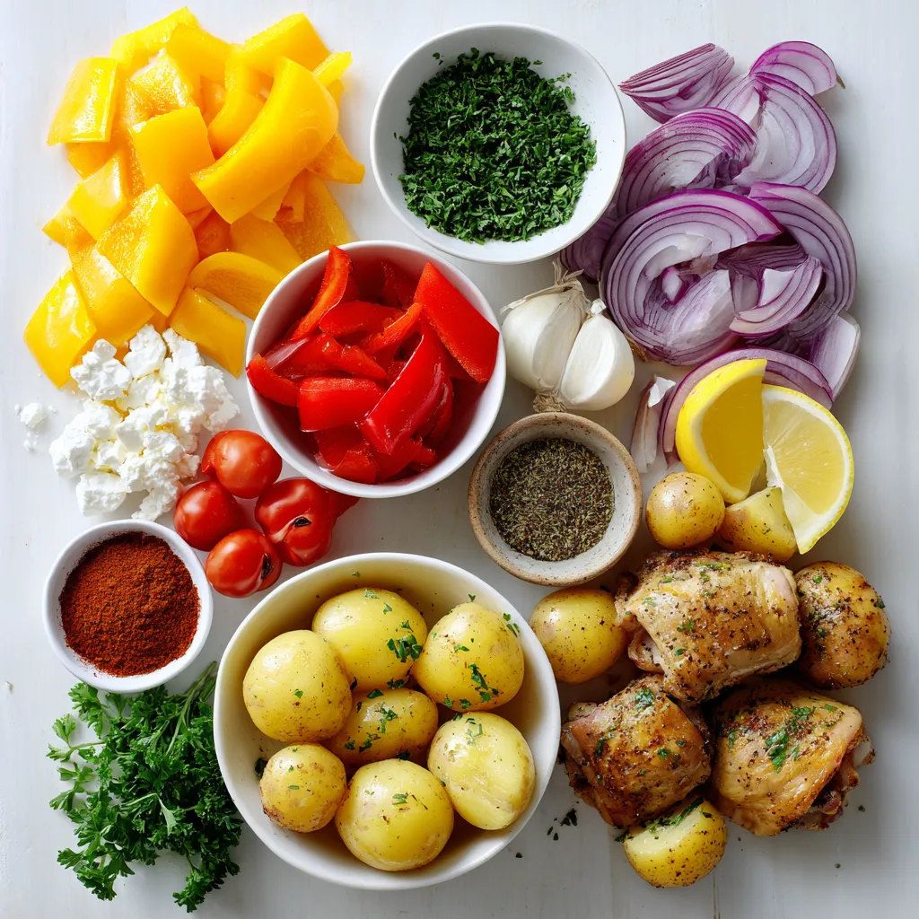 The main ingredients for this Greek chicken sheet pan dinner create a hearty meal. Chicken thighs provide rich flavor and moisture. Baby potatoes add a satisfying texture. Bell peppers and red onions bring color and sweetness. Cherry tomatoes add a burst of freshness in every bite.