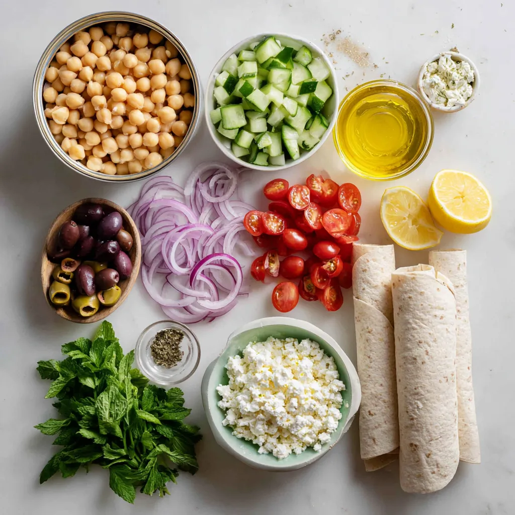 The key ingredients for Greek chickpea wraps are chickpeas, fresh veggies, and feta cheese. Chickpeas give protein and texture. Fresh cucumber and tomatoes add crunch and color. Red onion brings a mild bite. Feta cheese adds creaminess and saltiness, while Kalamata olives offer a briny flavor that makes your wraps pop.