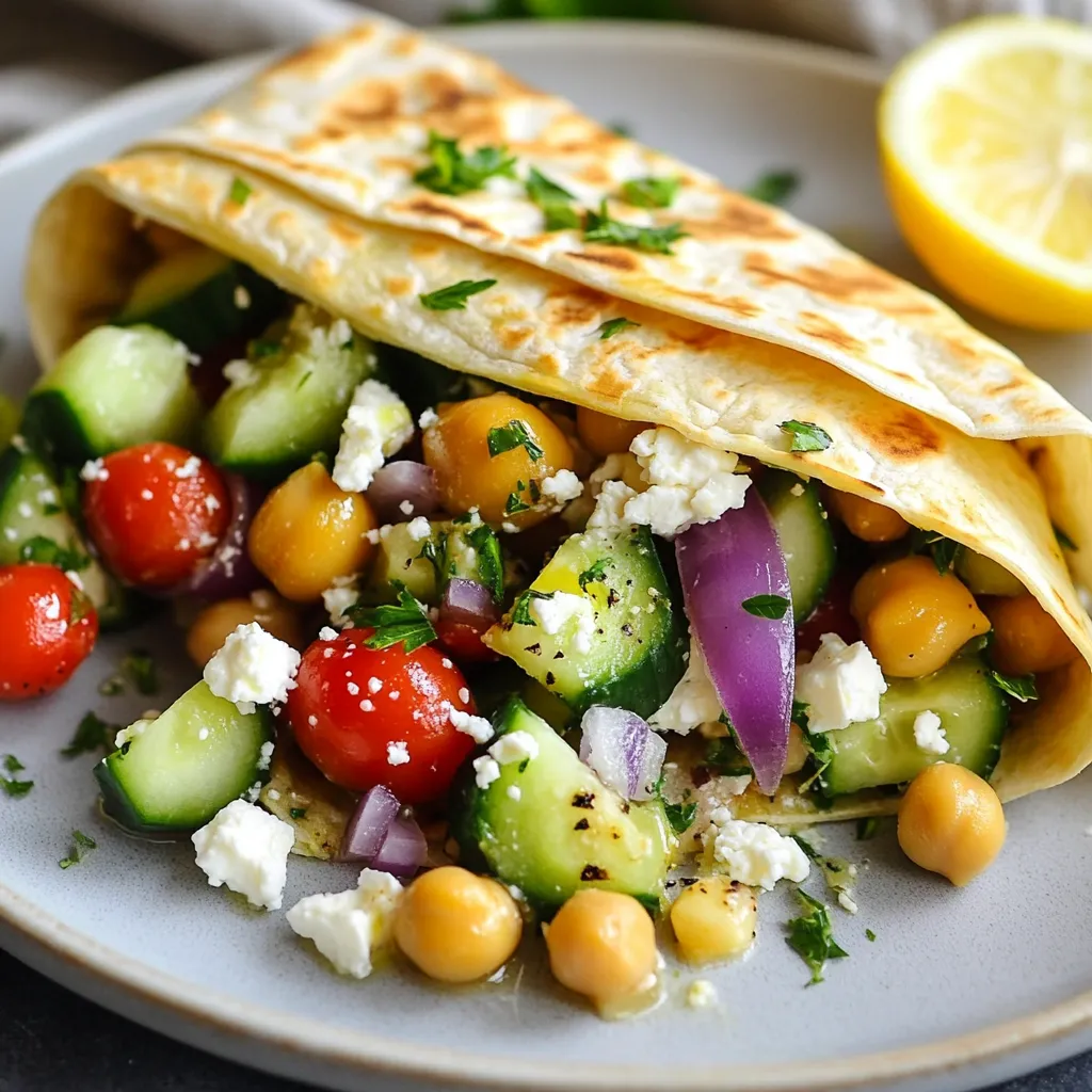 - 1 can (15 oz) chickpeas, drained and rinsed - 1 cup cucumber, diced - 1 cup cherry tomatoes, halved - 1/2 red onion, thinly sliced - 1/2 cup feta cheese, crumbled - 1/4 cup Kalamata olives, pitted and sliced - 2 tablespoons fresh parsley, chopped - 2 tablespoons fresh mint, chopped - Juice of 1 lemon - 3 tablespoons olive oil - 1 teaspoon dried oregano - Salt and pepper to taste - 4 whole wheat or spinach wraps The key ingredients for Greek chickpea wraps are chickpeas, fresh veggies, and feta cheese. Chickpeas give protein and texture. Fresh cucumber and tomatoes add crunch and color. Red onion brings a mild bite. Feta cheese adds creaminess and saltiness, while Kalamata olives offer a briny flavor that makes your wraps pop. Fresh herbs are vital for these wraps. Parsley and mint brighten the dish. They add freshness and enhance the flavors. When you use fresh herbs, you create a more vibrant and tasty experience. You can also play with herbs based on your taste. Try dill or basil for a twist. If you have allergies or dietary preferences, you can swap some ingredients. Use a dairy-free cheese if you're vegan. You can replace chickpeas with black beans for a different flavor. If you are gluten-free, use lettuce leaves instead of wraps. This keeps the meal light and fresh. {{ingredient_image_1}} - Combining Ingredients in a Bowl Start by draining and rinsing one can of chickpeas. In a large bowl, mix the chickpeas with 1 cup of diced cucumber, 1 cup of halved cherry tomatoes, and 1/2 of a thinly sliced red onion. Add 1/2 cup of crumbled feta cheese and 1/4 cup of sliced Kalamata olives. Finally, toss in 2 tablespoons each of chopped parsley and mint. This mix gives a fresh taste. - Making the Dressing In a separate small bowl, whisk together the juice of one lemon, 3 tablespoons of olive oil, 1 teaspoon of dried oregano, and add salt and pepper to taste. This dressing adds flavor and richness. - Tossing and Coating All Ingredients Pour the dressing over the chickpea mixture. Gently toss everything together. Ensure all ingredients are well coated. This step is key for flavor. - Laying Out the Wraps Lay out your whole wheat or spinach wraps on a clean, flat surface. Make sure they are ready to fill. - Portioning the Chickpea Filling Spoon an equal amount of the chickpea mixture onto the center of each wrap. Leave some space at the edges. This space helps with folding. - Folding and Rolling the Wraps Fold the sides of each wrap inward. Then, roll the wrap from the bottom up tightly. This secures the filling inside. - Reasons to Grill the Wraps Grilling adds a nice crunch and warmth to the wraps. It enhances the flavors and makes them even more enjoyable. - Tips for Achieving Perfect Crispiness If you choose to grill, heat a pan on medium. Grill each wrap for 2-3 minutes on each side. Look for a light golden color. This gives you a crispy outside while keeping the filling warm. Fresh ingredients make all the difference. Use ripe tomatoes, crisp cucumbers, and vibrant herbs. This gives your wraps a bright taste. You can also try adding spices. A pinch of smoked paprika or a dash of cumin can add warmth. Experiment with different herbs, like dill or basil, for a unique twist. To save time, prep your chickpea mixture a day in advance. Store it in the fridge. This lets the flavors blend well. When you are ready to eat, just wrap it up. For storing wraps, place them in an airtight container. They will stay fresh longer. If you make them early, keep the filling separate. This helps prevent sogginess. Pair your wraps with sides like a small Greek salad or hummus. This gives you more flavor and texture. You can also serve them with tzatziki for a refreshing dip. For presentation, slice the wraps in half before serving. Arrange them on a colorful plate. Garnish with extra herbs for a pop of color. Pro Tips Use Fresh Herbs: Fresh parsley and mint elevate the flavor of your wraps. Always opt for fresh over dried when possible for a vibrant taste. Customize Your Wraps: Feel free to add other vegetables like bell peppers or avocados for extra nutrition and flavor. Tailor the wraps to your liking! Grilling Option: Grilling the wraps adds a nice crunch and enhances the flavors. If you choose to grill, keep an eye on them to prevent burning. Make Ahead: Prepare the chickpea mixture in advance and store it in the fridge. This makes for a quick assembly when you're ready to enjoy your wraps! {{image_2}} For those who eat meat, you can add grilled chicken or shrimp. Both options give more protein. You can also use turkey for a leaner choice. For a heartier wrap, consider adding cooked quinoa. It adds great texture and helps fill you up. If you're vegan, keep the chickpeas as your main filling. You can also include other veggies like roasted peppers or zucchini. Avocado is a great addition for creaminess. Try adding a touch of tahini for an extra flavor boost. You can use lettuce leaves if you want a lighter option. They add crunch and freshness. Romaine or butter lettuce works best. If you prefer flatbreads, whole wheat or spinach wraps are tasty choices. They hold the filling well. For those who need gluten-free options, try brown rice wraps. They are flexible and easy to find. Corn tortillas are also a great choice. They add a nice flavor and keep everything together. Instead of a wrap, you can turn this dish into a salad. Use a bowl as your base and layer in all your favorite ingredients. Start with a bed of fresh greens. Then, add the chickpea mixture on top. For a fresh twist, drizzle the dressing over the salad. Toss it gently before serving. This way, you keep all the flavors while enjoying a different texture. It’s a great way to enjoy your meal without using any wraps. To store leftover wraps, wrap them tightly in plastic wrap or parchment paper. Place them in the fridge. They stay fresh for about 2-3 days. Check the wraps for any signs of spoilage before eating. Ingredients like chickpeas, cucumbe