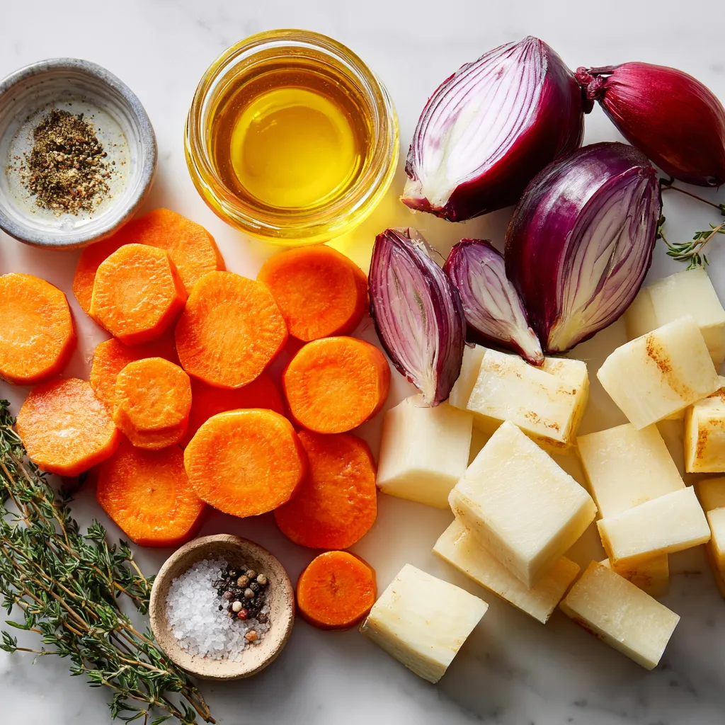 - 2 medium carrots, peeled and cut into thick rounds - 2 medium parsnips, peeled and cut into thick rounds - 1 large sweet potato, peeled and chopped into cubes - 1 small red onion, cut into wedges - 2 teaspoons fresh thyme, chopped (or 1 teaspoon dried thyme) - 2 teaspoons fresh rosemary, chopped (or 1 teaspoon dried rosemary) - 3 tablespoons olive oil - 1 tablespoon honey (optional for a touch of sweetness) - Use salt and pepper to taste - Try using garlic powder or paprika for extra flavor - Mix in other herbs like oregano or basil for variety {{ingredient_image_1}} Start by peeling your root vegetables. For this dish, I use: - 2 medium carrots - 2 medium parsnips - 1 large sweet potato - 1 small red onion Cut the carrots and parsnips into thick rounds. Chop the sweet potato into cubes. Cut the red onion into wedges. Next, place all these veggies into a large mixing bowl. Drizzle in 3 tablespoons of olive oil and, if you like, 1 tablespoon of honey for a hint of sweetness. Toss everything well to coat. Now, sprinkle in 2 teaspoons of fresh thyme and rosemary. Add salt and pepper to taste. Toss again until the herbs and spices mix well with the veggies. Preheat your oven to 425°F (220°C). This high heat helps the veggies get crispy and golden. Spread the vegetable mixture in a single layer on a large baking sheet lined with parchment paper. This makes cleanup easy and ensures even cooking. Roast in the preheated oven for 30 to 35 minutes. Stir halfway through to help them cook evenly. When they are golden brown and tender, they are ready. After roasting, remove the vegetables from the oven. Let them cool for a few minutes. This helps the flavors settle. For a beautiful presentation, serve the warm roasted vegetables on a rustic wooden platter. Garnish with fresh herb sprigs for added color. Enjoy your tasty dish! To get your vegetables cooked just right, start by cutting them into similar sizes. This helps them cook at the same time. I like to cut carrots and parsnips into thick rounds, while sweet potatoes work best in cubes. Make sure to spread your veggies in a single layer on the baking sheet. This ensures even cooking and gives them a nice crisp. You can boost the taste of your roasted vegetables with spices. Try adding paprika or cumin for a warm twist. A splash of lemon juice or orange zest can brighten up the dish. Different oils also add unique flavors. For example, using avocado oil gives a buttery taste. You could even try infused oils for an extra kick. Roasting times change based on how big your vegetable pieces are. Smaller pieces cook faster, so keep an eye on them. The ideal oven temperature for root vegetables is 425°F (220°C). This high heat helps caramelize the sugars in the veggies, giving them a sweet flavor. If your vegetables are not browning, you may need a bit more time. Pro Tips Choose Fresh Vegetables: Select vibrant, firm vegetables for the best flavor and texture. Fresh produce will enhance the overall taste of your dish. Uniform Cutting: Cut all vegetables into similar sizes to ensure even cooking. This helps them roast uniformly and achieve the perfect tenderness. Don't Overcrowd the Pan: Spread the vegetables out in a single layer on the baking sheet. Overcrowding can cause steaming instead of roasting, which affects flavor and texture. Experiment with Herbs: Feel free to mix and match herbs according to your preference. Adding different herbs can give a unique twist to the flavor profile. {{image_2}} You can change the root vegetables based on the season. In spring, use young beets or turnips. In summer, try zucchini or radishes. Fall brings great choices like butternut squash. Winter is perfect for rutabaga or celeriac. You can also mix different roots for a colorful dish. Combine carrots with parsnips for sweetness. Adding sweet potatoes gives a lovely texture. If you want a quicker method, try air frying. It gives you crispy edges while using less oil. Set your air fryer to 400°F (200°C) and cook for about 25 minutes. Shake the basket halfway for even cooking. You can also grill these veggies. Toss them in a grill basket and cook over medium heat. This adds a nice smoky flavor. To make your dish stand out, add garlic. Mince two cloves and mix them with the veggies. This gives a savory punch. You can also use citrus zest for brightness. Grate some lemon or orange peel into the mix. This adds a fresh twist. For a sweet version, drizzle extra honey before roasting. Balance it with a pinch of salt to enhance the taste. After enjoying your herb roasted root vegetables, you may have some left. To keep them fresh, place the leftovers in an airtight container. This helps prevent drying out. Store them in the fridge for up to four days. If you want to keep them longer, consider freezing them. You can reheat your roasted vegetables in either the oven or microwave. For the oven, set it to 350°F (175°C). Spread the veggies on a baking sheet and heat for about 10-15 minutes. This method keeps them crispy. If you're in a hurry, the microwave works too. Heat them in a bowl for about two minutes. Stir halfway to warm evenly. To freeze your roasted root vegetables, let them cool completely first. Then, place them in a freezer-safe bag or container. Make sure to remove as much air as possible to prevent freezer burn. They can last up to three months in the freezer. When you're ready to eat them, thaw in the fridge overnight. Reheat as described above for the best taste. Roasted root vegetables last about 3 to 5 days in the fridge. To keep them fresh, store them in an airtight container. Make sure they cool down before sealing. This helps prevent moisture buildup, which can make them soggy. You can use frozen vegetables, but they may change the dish's texture. Frozen veggies often lose some crispness when roasted. They can also release water, which may make the dish less flavorful. If you choose frozen, reduce the cooking time. Check for tenderness to ensure th