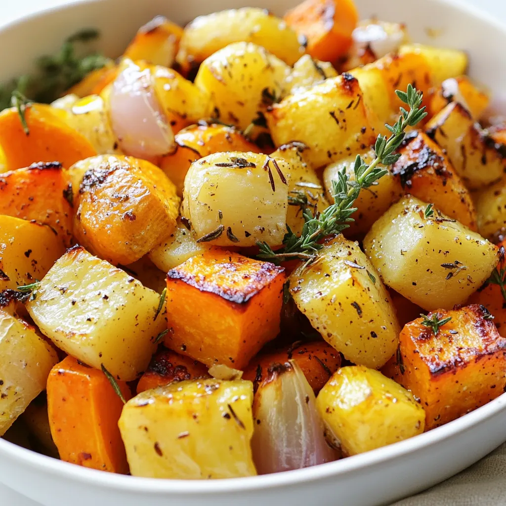 Discover the delightful flavors of herb roasted root vegetables with this easy vegetable recipe! Packed with healthy ingredients like carrots, parsnips, and sweet potatoes, this roasted vegetable recipe is perfect as a healthy vegetable side. Infused with fresh thyme and rosemary, these thyme rosemary vegetables are a crowd-pleaser. Try this recipe today and elevate your meals! Save this for your next dinner! #RoastedVegetables #HealthySides #VegetableRecipes #HerbRoastedVeggies