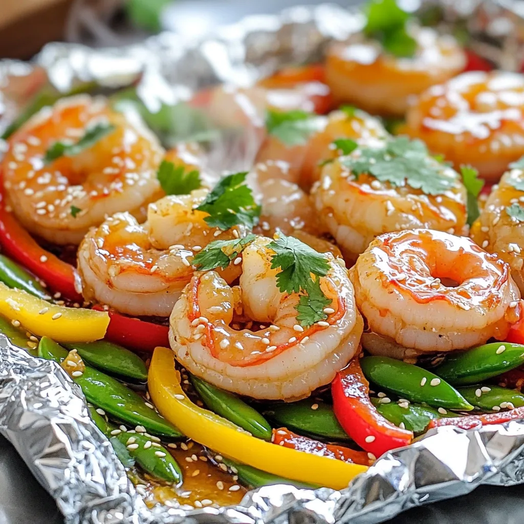 - 1 pound large shrimp, peeled and deveined - 3 tablespoons honey - 2 tablespoons soy sauce or tamari - 3 cloves garlic, minced The main ingredients for honey garlic shrimp foil packs are simple yet full of flavor. Using large shrimp gives you a nice bite. The honey adds a sweet touch, while soy sauce brings depth. Fresh garlic gives a bold taste that makes the dish shine. - 1 bell pepper, sliced into strips - 1 cup snap peas, trimmed - Fresh cilantro or green onions for garnish Adding vegetables makes this dish colorful and healthy. I love using bell peppers for their crunch and sweetness. Snap peas add freshness, while cilantro or green onions give a final pop of flavor. - 2 tablespoons olive oil - 1 teaspoon sesame seeds (optional) - Salt and pepper to taste Olive oil helps the shrimp and veggies cook evenly. Seasoning with salt and pepper brings all the flavors together. Sesame seeds add a nice crunch if you choose to use them. - Preheat your grill or oven to 400°F (200°C). - Cut four large pieces of aluminum foil, about 12 inches each, and lay them flat. - In a small bowl, whisk together 3 tablespoons of honey, 2 tablespoons of soy sauce, 3 cloves of minced garlic, and 1 tablespoon of grated ginger. Mix until smooth. - In a medium bowl, toss 1 pound of peeled and deveined shrimp with 2 tablespoons of olive oil, salt, and pepper. - Divide the shrimp evenly onto the four pieces of foil. - Top each shrimp portion with sliced bell pepper and snap peas. - Spoon the honey garlic sauce over the shrimp and veggies in each pack. - Fold the sides of the foil over the shrimp and veggies, sealing the packs tightly. - Cook the foil packs on the grill or in the oven for 12-15 minutes. The shrimp should be pink and opaque, and the veggies tender. To cook shrimp just right, look for a few signs. Cooked shrimp turn pink and curl slightly. They should feel firm but not rubbery. For different shrimp sizes, adjust your cooking time. Larger shrimp take longer, while smaller shrimp cook faster. Aim for 12-15 minutes if you're using large shrimp. Always check to ensure they are fully cooked. To boost flavor, think about adding spices or herbs. Some great options include red pepper flakes or fresh basil. If you want a twist, try adding lime juice or chili paste. For those with dietary needs, substitute soy sauce with tamari for gluten-free. You can also use coconut aminos for a different taste. To prevent sticking, use enough olive oil in your pack. This helps the shrimp and veggies cook well. When sealing the foil, fold it tightly but gently. This keeps the steam inside and prevents tearing. For easy cleanup, line your baking tray with parchment paper. This way, any drips will not stick to your pan. {{image_2}} You can switch out shrimp for other proteins. Chicken is a great choice. Use boneless, skinless chicken breasts. Cut them into bite-sized pieces. Tofu is perfect for a vegetarian option. Use firm or extra-firm tofu for the best texture. Fish also works well; try salmon or tilapia. Just adjust cooking times based on the protein you choose. Want to mix things up? Try different sauces for unique flavors. Teriyaki sauce adds a sweet and savory taste. For a bright twist, use lemon garlic sauce. If you like heat, add some chili flakes or hot sauce. Each option gives the dish a fresh spin while keeping it easy. Seasonal veggies can elevate your foil packs. In spring, use asparagus and baby carrots. Summer is great for zucchini and corn. In autumn, add butternut squash or Brussels sprouts. Winter is perfect for hearty root vegetables like parsnips and sweet potatoes. Fresh ingredients not only taste better but also boost nutrition. To store leftover foil packs, let them cool first. Then, place them in an airtight container. You can also wrap them in plastic wrap or foil. Store them in the fridge for up to three days. When you are ready to enjoy them again, check for any signs of spoilage before heating. If you want to save the cooked shrimp, freezing is a great option. Allow the foil packs to cool completely. Then, transfer the shrimp and veggies to a freezer-safe bag. Remove as much air as possible before sealing. You can keep them frozen for up to three months. Label the bags with the date, so you know when to use them. To reheat your leftover meals, there are a few safe methods. You can use the microwave, oven, or stovetop. For the microwave, place the pack on a microwave-safe plate and heat for about 2-3 minutes. If using the oven, preheat it to 350°F (175°C) and heat for about 10 minutes. For the stovetop, add a little water to a pan, place the pack inside, and cover. Heat on low until warm. Always check that the shrimp are heated through before serving. Yes, you can cook Honey Garlic Shrimp Foil Packs in the oven. Preheat your oven to 400°F (200°C). Use aluminum foil to create your packs, just like on the grill. Place the sealed packs on a baking sheet for easy handling. Cook for about 12-15 minutes or until the shrimp turn pink and the veggies are tender. This method keeps the shrimp juicy and full of flavor. You can serve Honey Garlic Shrimp Foil Packs with a variety of tasty sides. Here are some great options: - Steamed rice or quinoa for a filling base - A fresh green salad for a light touch - Grilled corn on the cob for sweetness - Garlic bread for a comforting addition These sides balance the meal and add more textures and flavors. To check if the shrimp are cooked, look for a few signs. The shrimp should turn pink and opaque. They also curl into a C shape. If they are still gray or translucent, they need a bit more time. You can always cut one open to check; it should be white and firm. This way, you ensure the shrimp are delicious and safe to eat. This recipe for Honey Garlic Shrimp Foil Packs combines tasty shrimp and fresh veggies. You learned how to make it step-by-step, from preparation to cooking. I also shared storage tips and variations to suit your taste. These foil packs are ea