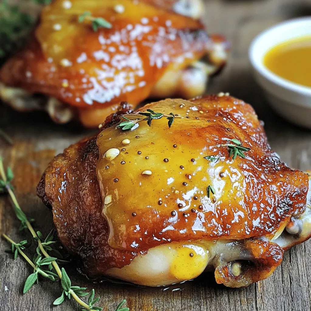 To make Honey Mustard Chicken Thighs, you will need these key ingredients: - 4 bone-in chicken thighs, skin-on - 1/4 cup honey - 1/4 cup Dijon mustard - 2 tablespoons apple cider vinegar - 1 tablespoon olive oil - 3 cloves garlic, minced - 1 teaspoon smoked paprika - Salt and pepper to taste - Fresh thyme or parsley for garnish Each ingredient plays a vital role in creating the dish. The bone-in thighs keep the meat juicy and tender. Honey adds sweetness, while Dijon mustard gives a nice tang. Apple cider vinegar adds a bit of acidity to balance the flavors. Olive oil keeps everything moist during cooking. Garlic adds depth, and smoked paprika gives a hint of warmth. Don't forget to season with salt and pepper for the best taste. Finally, fresh herbs make your dish look beautiful and add a burst of freshness at the end. Whisking the sauce Start by grabbing a mixing bowl. Add 1/4 cup honey, 1/4 cup Dijon mustard, 2 tablespoons apple cider vinegar, and 1 tablespoon olive oil. Toss in 3 minced garlic cloves, 1 teaspoon smoked paprika, and a pinch of salt and pepper. Whisk it all together until it blends smoothly. Marinating the chicken Next, take 4 bone-in chicken thighs and place them in a large resealable bag or a shallow dish. Pour your sauce over the chicken. Make sure each piece gets a nice coat. Seal the bag or cover the dish. Let it chill in the fridge for at least 1 hour. For best flavor, marinate overnight. Preheating the oven When you're ready, preheat your oven to 400°F (200°C). This step is key for even cooking. Line a baking dish with parchment paper. This makes clean-up a breeze. Placing the chicken in the baking dish Take the marinated chicken out of the fridge. Place the thighs skin-side up in your baking dish. Pour any leftover marinade over the chicken for extra flavor. Baking time and checking doneness Bake the chicken for 35 to 40 minutes. The skin should turn golden brown. To check if it’s done, insert a meat thermometer into the thickest part of the thigh. It should read 165°F (75°C) to be safe to eat. Broiling for crispy skin For a nice crunch, broil the chicken on high for 2 to 3 minutes. Watch it closely to avoid burning. Once done, take the chicken out and let it rest for 5 minutes. This helps keep it juicy. Garnish with fresh thyme or parsley before serving. Enjoy your flavorful dish! Marinating chicken is key to great flavor. It helps the meat soak up all the tasty juices. I recommend marinating your chicken for at least one hour. However, marinating overnight gives the best results. The longer you let it sit, the more flavor it gains. To enhance flavors, mix in fresh herbs or spices. You can try adding rosemary or thyme for a fragrant twist. For perfect doneness, always check the internal temperature. It should reach 165°F (75°C) for safety. If you prefer crispy skin, broil the chicken for a few minutes at the end. This adds a nice crunch. You can also grill the chicken for a smoky flavor. Just keep an eye on it to prevent burning. Pair your honey mustard chicken with side dishes that balance its sweetness. Roasted vegetables, like carrots and Brussels sprouts, work well. You can also serve it with fluffy rice or creamy mashed potatoes. For garnish, use fresh thyme or parsley. They add color and freshness to your plate. {{image_2}} You can change the taste of your honey mustard chicken thighs with simple tweaks. Adding spices like cayenne pepper brings heat. Fresh herbs like rosemary or oregano add depth. You can also swap honey for maple syrup for a unique touch. If you want more tang, use lemon juice instead of apple cider vinegar. This makes a bright flavor that pairs well with chicken. Try grilling instead of baking for a smoky flavor. Just marinate the chicken as usual. Preheat your grill to medium-high, then cook the thighs skin-side down. Grill for about 6-8 minutes per side. Make sure the internal temp hits 165°F (75°C). Another option is using a slow cooker. Place the marinated chicken in the slow cooker with the sauce. Cook on low for 6-8 hours or high for 3-4 hours. This method makes the chicken super tender and full of flavor. To store leftover honey mustard chicken thighs, let them cool. Place the chicken in an airtight container. This keeps it fresh for 3 to 4 days in the fridge. Make sure to cover the container tightly. You can also wrap the chicken in plastic wrap. This extra layer helps prevent drying. If you want to keep the chicken longer, freezing is a great choice. First, let the chicken cool completely. Then, wrap each piece in plastic wrap. Place the wrapped chicken in a freezer-safe bag. Remove as much air as possible. This helps avoid freezer burn. You can freeze the chicken for up to 3 months. When it's time to eat, reheating is simple. For best results, use the oven. Preheat it to 350°F (175°C). Place the chicken on a baking sheet, cover it with foil, and heat for 20-25 minutes. This keeps the chicken juicy. You can also use the microwave, but it may dry out the chicken. Heat it in short bursts, checking often. Enjoy your delicious honey mustard chicken! Yes, you can use boneless chicken thighs. They will cook faster without the bone. Just adjust the cooking time. Bake them for about 25-30 minutes. Check the internal temperature to ensure it reaches 165°F. If you don’t have Dijon mustard, use yellow mustard. You can also try whole grain mustard. These will change the flavor slightly but still taste great. Honey mustard will work too, but adjust the honey amount. Marinate the chicken for at least 1 hour. For the best flavor, marinate it overnight. The longer it sits, the more the flavors blend together. This gives a great taste to the chicken. Broiling is not necessary, but it helps achieve crispy skin. If you want that nice crunch, broil for 2-3 minutes at the end. Keep an eye on it to avoid burning. It adds a lovely finish to the dish. Yes, you can make this recipe in advance. Marinate the chicken and store it in the re